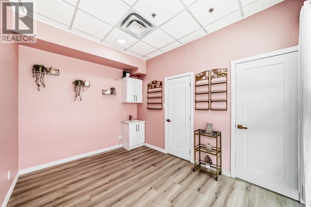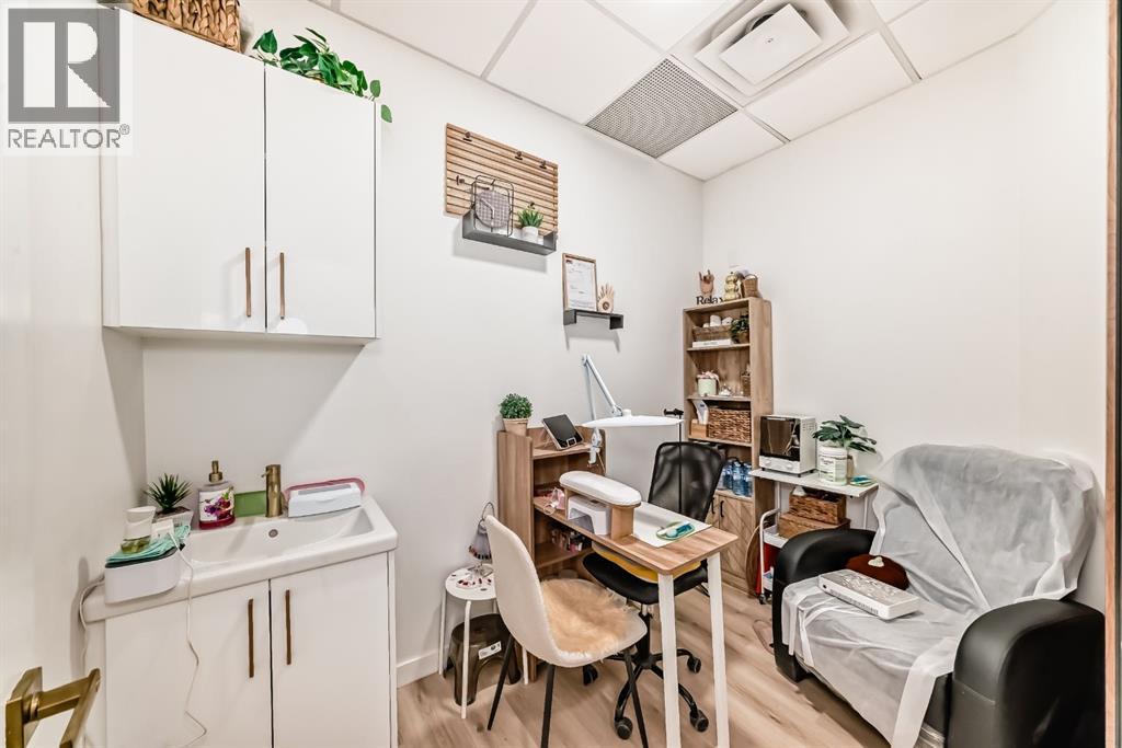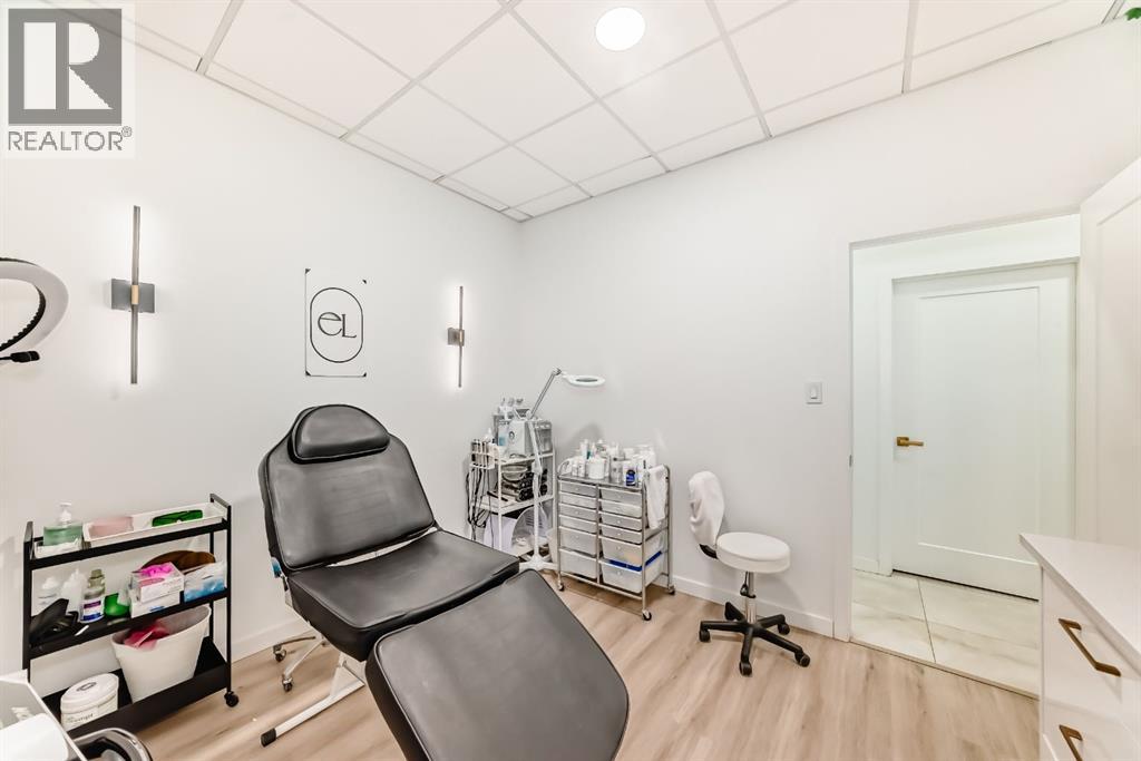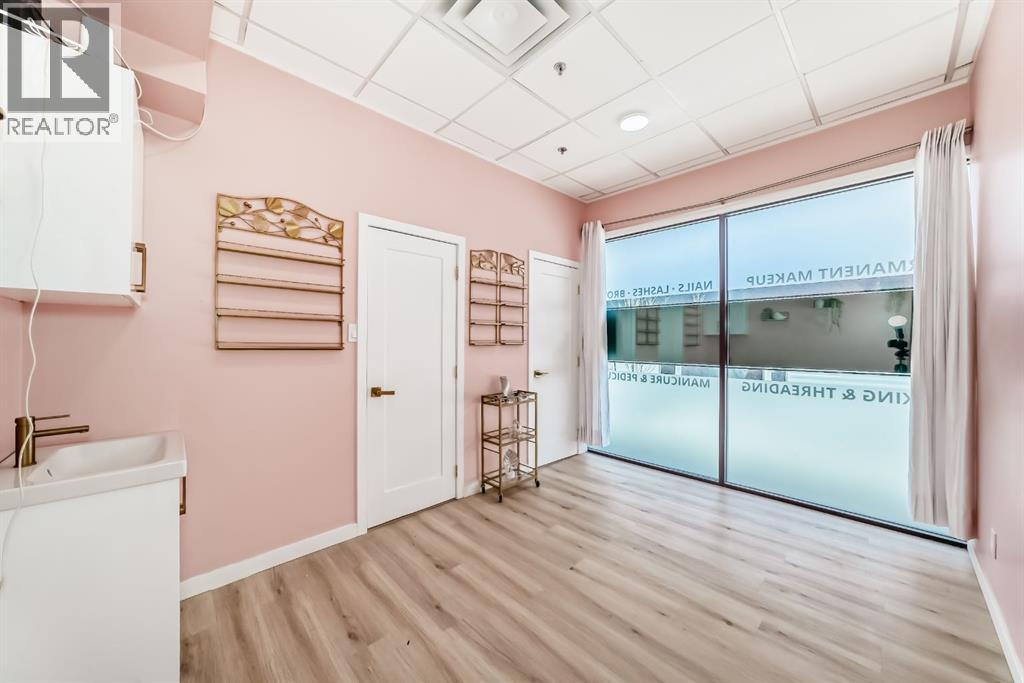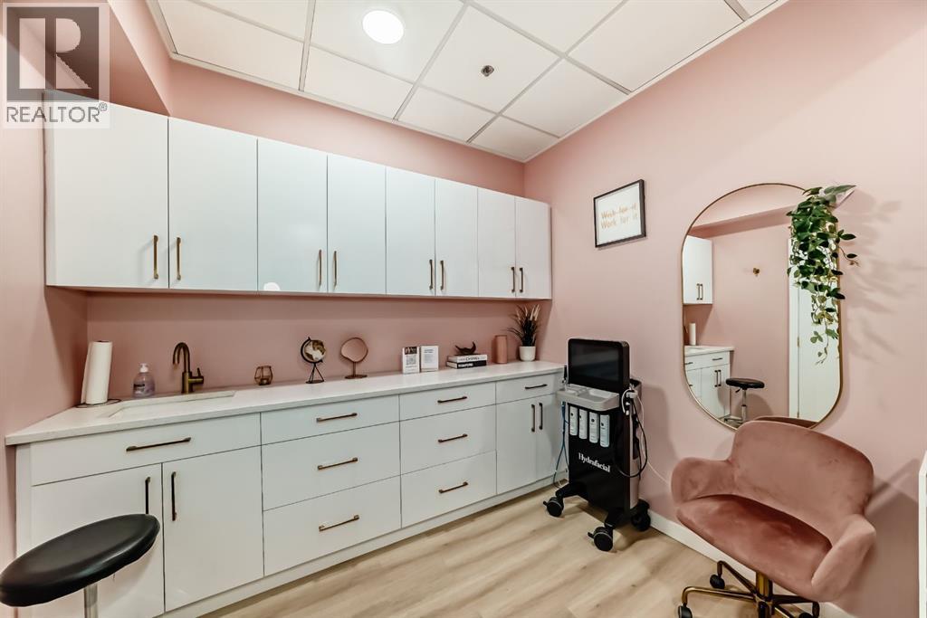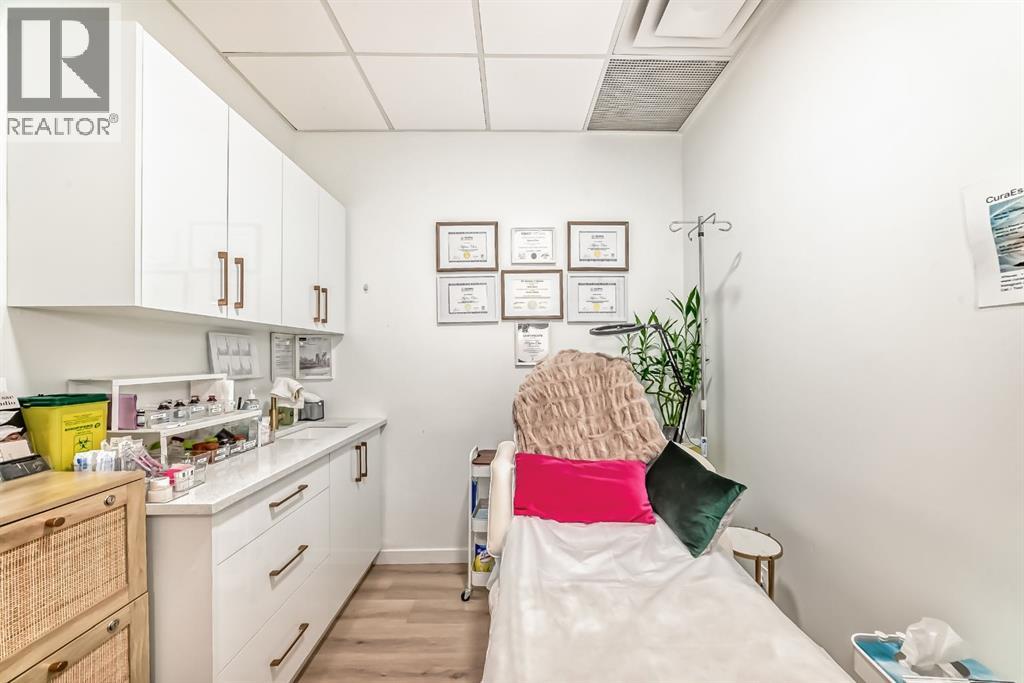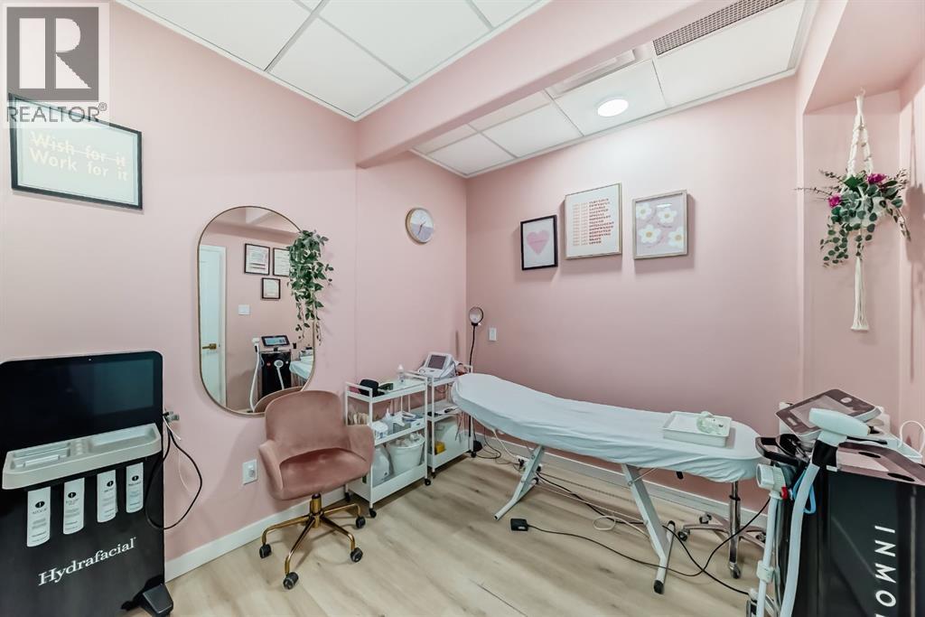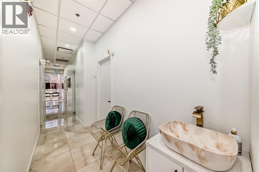 Turn-key professional commercial condominium unit with full clinical infrastructure. Currently operating as an established aesthetics clinic, this impeccably maintained 1,060 square foot suite presents a rare opportunity for medical, wellness, or high-end aesthetics users seeking a fully built-out space. Positioned along the high-exposure Centre Street NW corridor, the unit has been thoughtfully designed to support multiple practitioners while maintaining a refined, boutique atmosphere. The layout features eight private treatment rooms, each equipped with its own sink; an extensive and costly infrastructure upgrade. The space is anchored by a polished front reception and client waiting area that delivers a strong first impression. A central hallway provides efficient circulation, complemented by a private two-piece bathroom and a dedicated laundry and utility room to support daily operations. Dual access points enhance functionality, with a welcoming front entrance for clients and a separate rear exit ideal for staff and deliveries. Two assigned underground parking stalls are included, offering added convenience in this highly accessible inner-city location. This is a rare opportunity to secure a fully plumbed, high-density professional space in a prime Calgary corridor, with immediate usability and long-term flexibility. (id:63190)