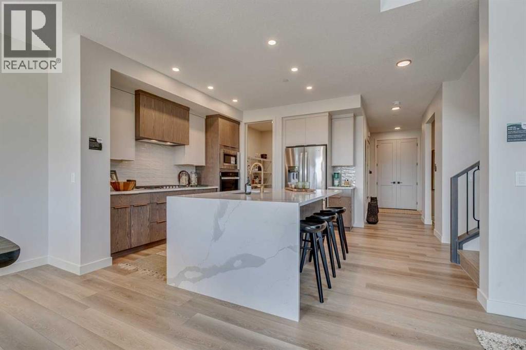 Built by Sterling Homes, this home showcases on-trend, designer-curated interior selections tailored for a home that feels personalized to you. The executive kitchen is beautifully appointed with built-in stainless steel appliances, gas cooktop, fridge with water and ice dispenser, waterfall island, pendant lighting, pots and pans drawers, waste bin pullout, Silgranit sink, and a walk-through pantry. The main floor offers a versatile flex room, a spacious mudroom with built-in bench and coat hooks, and a striking great room with open-to-above ceilings and an electric fireplace. Upstairs, enjoy a well-designed layout with a luxurious 5-piece ensuite featuring a tiled shower, tile flooring, and a bank of drawers. Additional highlights include LVP flooring throughout the main floor, main bath, and laundry, quartz countertops with undermount sinks, paint grade railing with iron spindles, and extra windows for abundant natural light. This energy-efficient home is Built Green certified and includes triple-pane windows, a high-efficiency furnace, and a solar chase for a solar-ready setup. Home includes blower door testing for energy efficiency, plus an electric car charger rough-in, it’s designed for sustainable, future-forward living. Featuring smart home technology, this home includes a programmable thermostat, ring camera doorbell, smart front door lock, smart and motion-activated switches—all seamlessly controlled via an Amazon Alexa touchscreen hub. Plus, your move will be stress-free with a concierge service provided by Sterling Homes Calgary that handles all your moving essentials—even providing boxes! Photos are a representative. (id:63190)