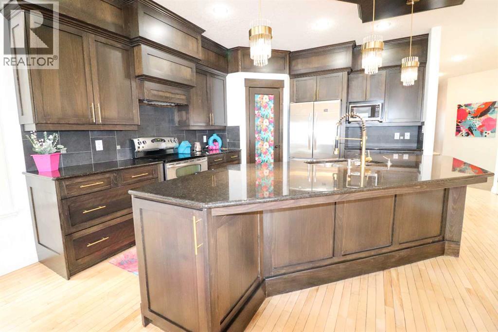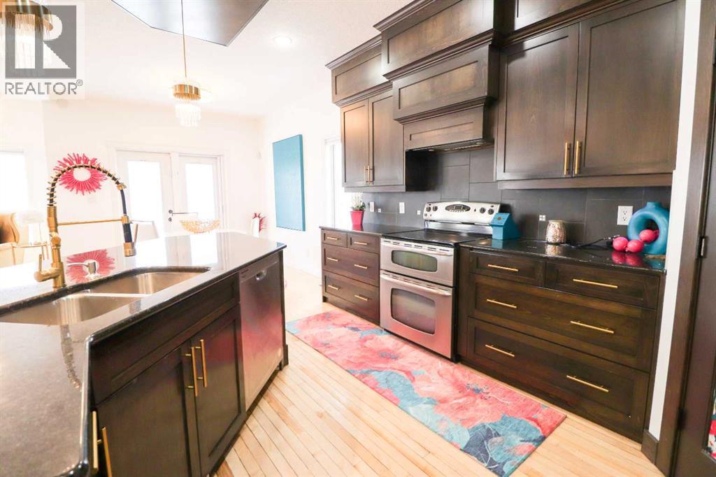 Discover exceptional square footage, elegance, and a peaceful neighborhood setting in this beautifully maintained two-story home with a walkout basement, perfectly situated on a corner lot in the sought-after Heritage Heights community. With over 4,000 sq. ft. of finished living space, this property offers room to grow, entertain, and live in comfort.Recent upgrades within the past year include new lighting and faucets throughout, new appliances, a high-efficiency hot water tank, fresh paint, and updated landscaping. The oversized, extra-tall garage is ideal for hobbyists, car enthusiasts, or anyone needing space for lifts, toys, or storage.Step inside to a welcoming tile entry and custom hardwood flooring. A bright, naturally lit den sits just off the foyer. The gourmet kitchen is a chef’s dream, featuring floor-to-ceiling cabinetry, granite countertops, stainless steel appliances, a large granite island, and a spacious corner pantry.The living room offers a cozy natural gas fireplace with a custom wood mantle, while the adjacent breakfast nook opens to the first of two private decks. A formal dining room with its own garden doors leads to the second deck—perfect for hosting or relaxing outdoors. A convenient laundry room and 2-piece bath complete the main level.Upstairs, you’ll find a massive enclosed bonus/flex room, pre-wired for a 7.1 surround-sound system—ideal as a family movie room or kids’ play space. This level includes three bedrooms, including a generous primary suite with a 5-piece ensuite featuring a tub/shower combo, double vanity, and walk-in closet.The fully finished walkout basement offers a spacious family room, a fourth bedroom, and a 3-piece bathroom with a stand-up shower. Double doors open to a covered patio, extending your living space outdoors.Located just a short walk from the coulees and Heritage Point Park, this home blends luxury, comfort, and an unbeatable location. Call your favorite REALTOR® today so as not miss out on thi s opportunity. (id:63190)