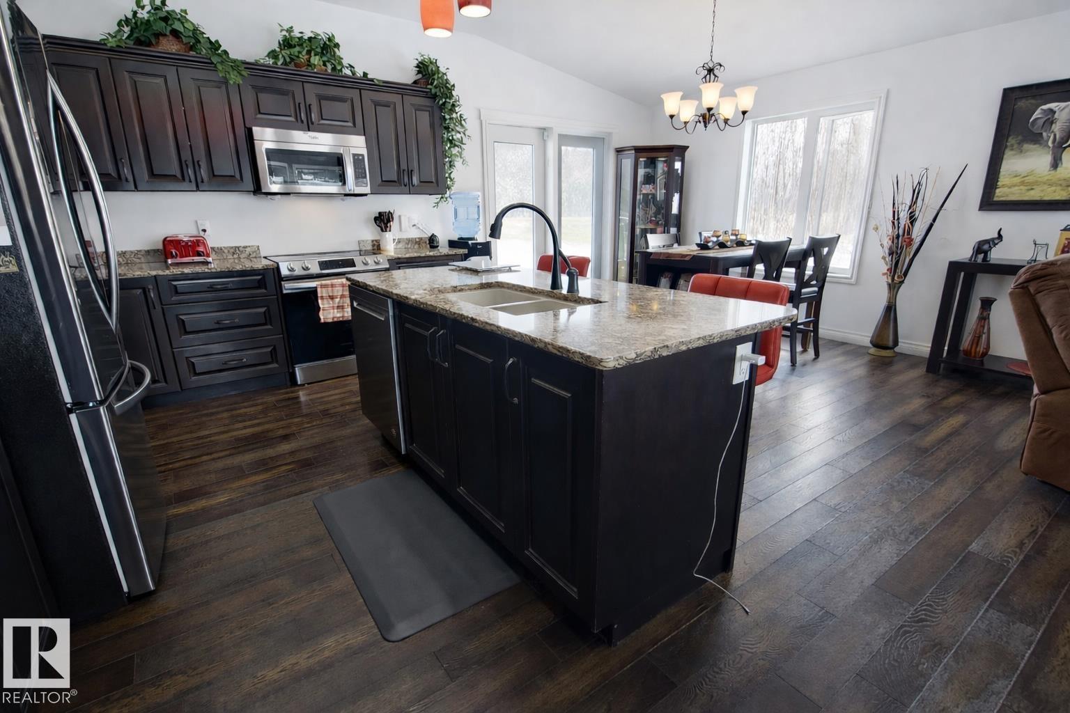 Welcome to this beautifully maintained 3-level split situated on a spacious 1.58-acre lot, offering the perfect blend of comfort, functionality, and country charm. This home features 4+1 bedrooms and 3 full bathrooms, ideal for families of all sizes. The bright and open-concept main floor showcases a spacious kitchen complete with a large island, perfect for entertaining, along with engineered and carpet flooring throughout. Vaulted ceilings and expansive windows fill the home with an abundance of natural light, creating a warm and inviting atmosphere. The primary bedroom includes a walk-in closet and a private 4-piece ensuite. The fully finished lower level offers a generous family room, 2 additional bedrooms, and plenty of space for relaxation or recreation. Additional highlights include a double attached garage and ample outdoor space to enjoy the privacy and tranquility of acreage living. (id:63190)