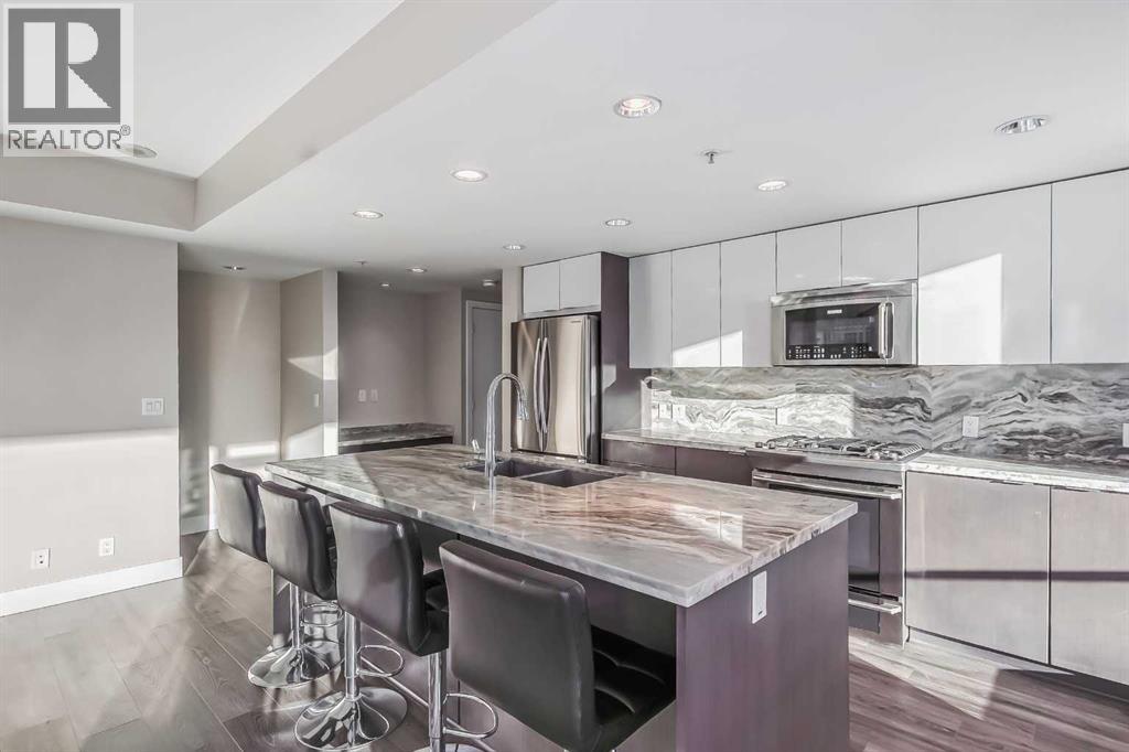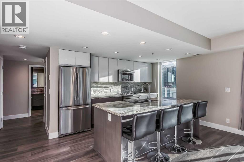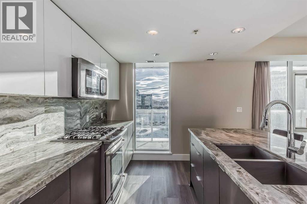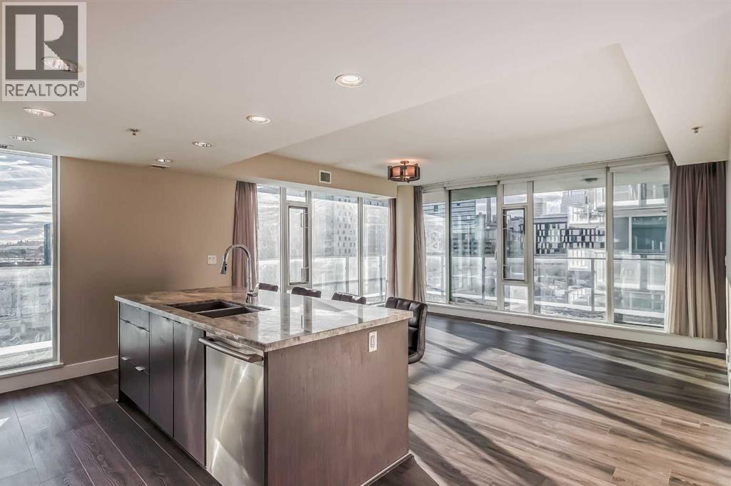 Welcome to Evolution in East Village, where elevated urban living meets exceptional design. This stunning 2 bedroom, 2 bathroom condo offers over 1000 sq ft of thoughtfully designed space, perfect for professionals, couples, or a small family seeking both comfort and lifestyle.The heart of the home is the sleek, modern kitchen featuring quartz countertops, a gas range, stainless steel appliances, and a large island—ideal for entertaining or casual everyday living. The open-concept layout flows seamlessly into a bright and spacious living area, framed by floor-to-ceiling windows that fill the space with natural light.One of the standout features of this home is the massive private balcony, offering an incredible extension of your living space. Whether you're hosting friends, enjoying a quiet morning coffee, or taking in the vibrant East Village views, this outdoor area is truly something special.The well-designed floor plan provides excellent bedroom separation for privacy. The primary suite features a walk-through closet and a private ensuite, while the second bedroom and full bath make this home ideal for guests, a home office, or a growing family. Additional highlights include in-suite laundry, central air conditioning, high-end finishes throughout, storage locker and underground parking. Residents of Evolution enjoy premium amenities including a fitness centre, sauna & steam room, concierge service, and a rooftop terrace with BBQs and panoramic city views. Book your private showing today! Located steps from the Bow River pathways, cafes, restaurants, Studio Bell, Superstore, and transit, this is your opportunity to own in one of Calgary’s most dynamic and walkable communities. (id:63190)