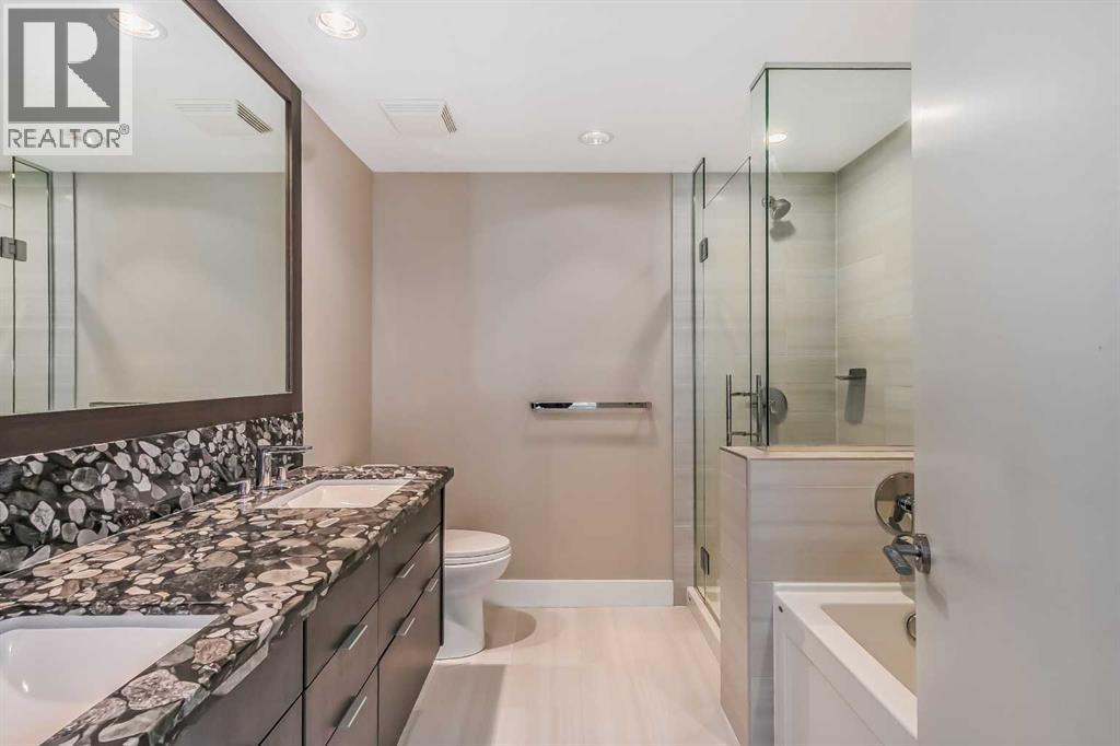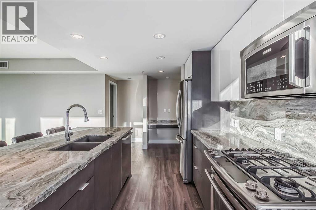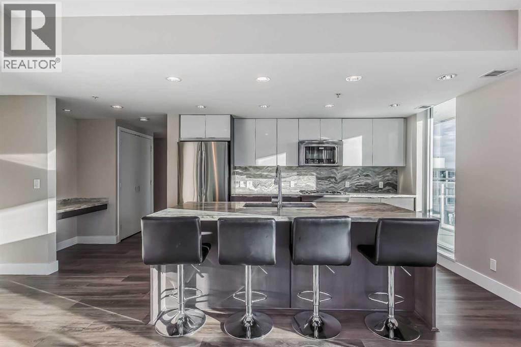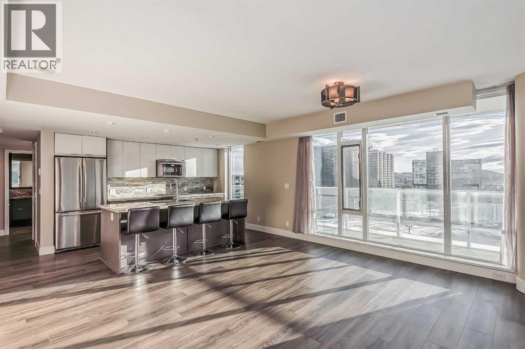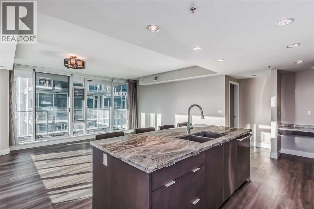 Welcome to Evolution in East Village, where elevated urban living meets exceptional design. This stunning 2 bedroom, 2 bathroom condo offers over 1000 sq ft of thoughtfully designed space, perfect for professionals, couples, or a small family seeking both comfort and lifestyle.The heart of the home is the sleek, modern kitchen featuring quartz countertops, a gas range, stainless steel appliances, and a large island—ideal for entertaining or casual everyday living. The open-concept layout flows seamlessly into a bright and spacious living area, framed by floor-to-ceiling windows that fill the space with natural light.One of the standout features of this home is the massive private balcony, offering an incredible extension of your living space. Whether you're hosting friends, enjoying a quiet morning coffee, or taking in the vibrant East Village views, this outdoor area is truly something special.The well-designed floor plan provides excellent bedroom separation for privacy. The primary suite features a walk-through closet and a private ensuite, while the second bedroom and full bath make this home ideal for guests, a home office, or a growing family. Additional highlights include in-suite laundry, central air conditioning, high-end finishes throughout, storage locker and underground parking. Residents of Evolution enjoy premium amenities including a fitness centre, sauna & steam room, concierge service, and a rooftop terrace with BBQs and panoramic city views. Book your private showing today! Located steps from the Bow River pathways, cafes, restaurants, Studio Bell, Superstore, and transit, this is your opportunity to own in one of Calgary’s most dynamic and walkable communities. (id:63190)