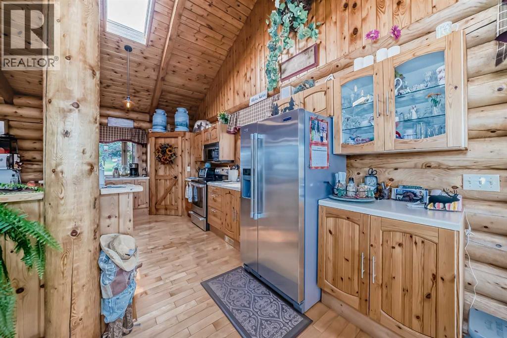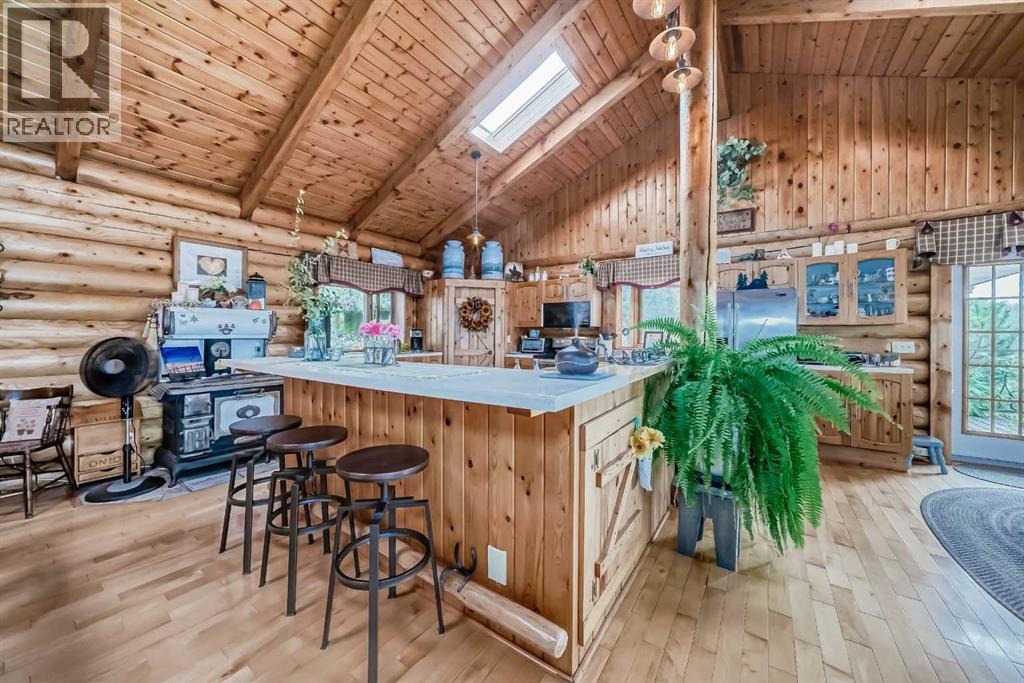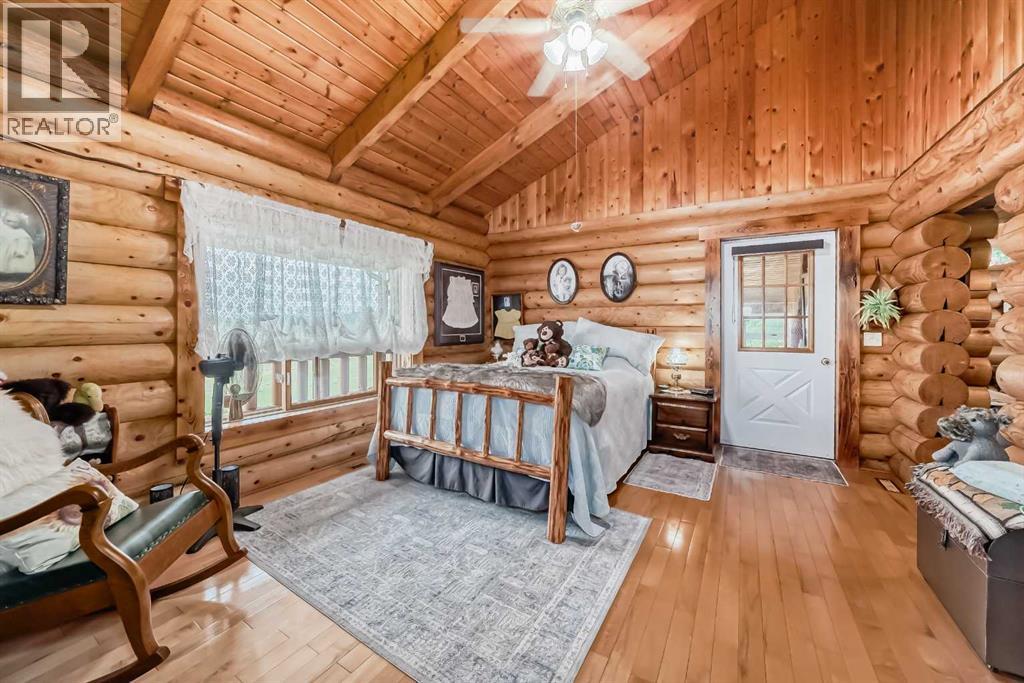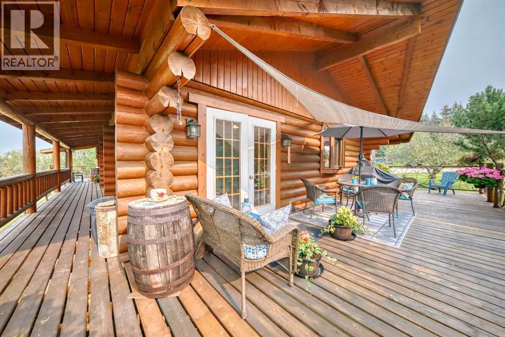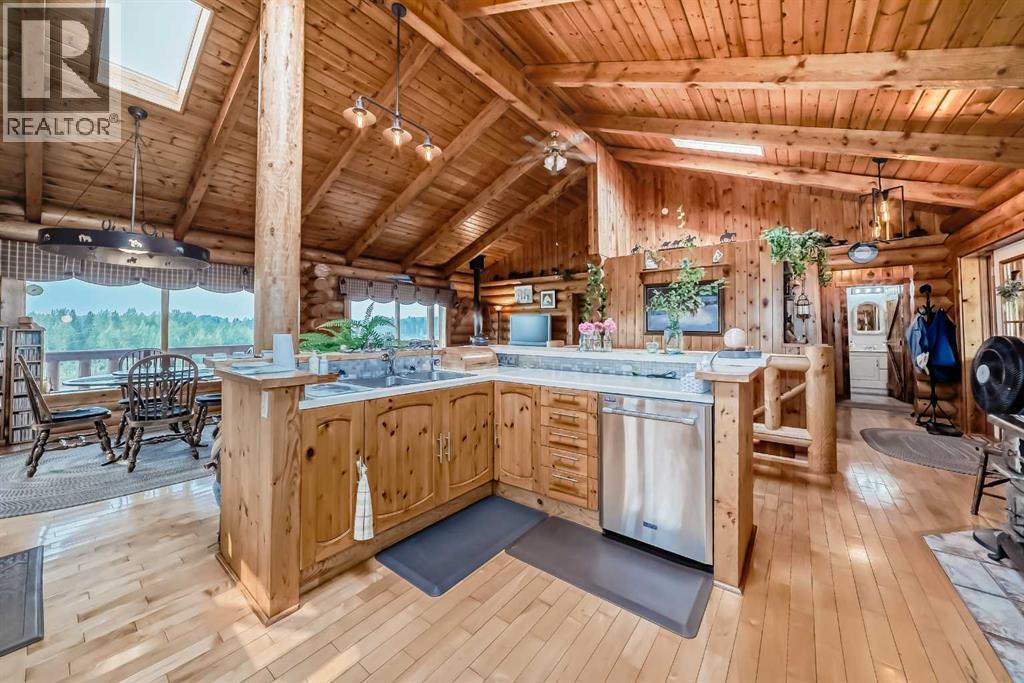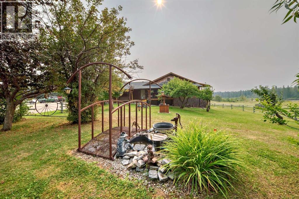There won't be a moment that you won't say "wow" to this award winning acreage when you drive into this sensational property located on pavement at the end of a dead end road close to Rocky Mountain House and Caroline. Nestled within the trees, this beautiful log bungalow has "Welcome": written all over it. From the exceptional landscaping, to the outdoor amenities to the one in a million view of the Clearwater River, this hand crafted log home has been exceptionally built and maintained. The wrap around deck and covered porch leads you into the main living space with a central kitchen area complete with corner pantry and an eating bar for your family to gather for those special events. The living room with woodstove invites you to cozy up for the evening and the convenience of your primary bedroom on main floor shares a luxurious ensuite with a claw tub and heated floors. The sunroom/reading room is located directly off the primary bedroom. The downstairs walkout houses 3 bedrooms a large family room with wet bar and both storage and a cold room. Not enough can be said about the parking as there is a heated double attached garage along with a 16 x 48 motorhome garage, and a combination of shop areas which are 8x24,12x32,14x32,24x32 and 32x32 and 8x14. Shop comes with an air compressor that is plumbed in. Also there is an overhead crane and welder plugs. There is a hayshed, gazebo, fruit trees, grassed pastureland and access to the river. Animal friendly property that has been fenced complete with water bowl. This is one of those properties that needs to be seen to truly be appreciated. (id:63190)