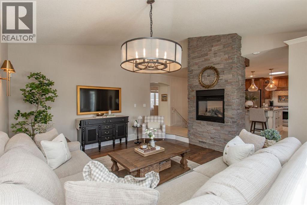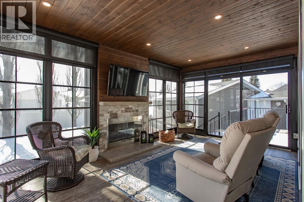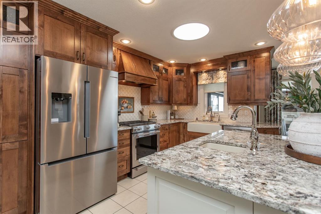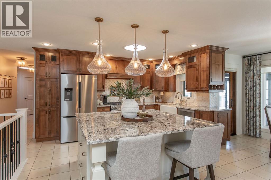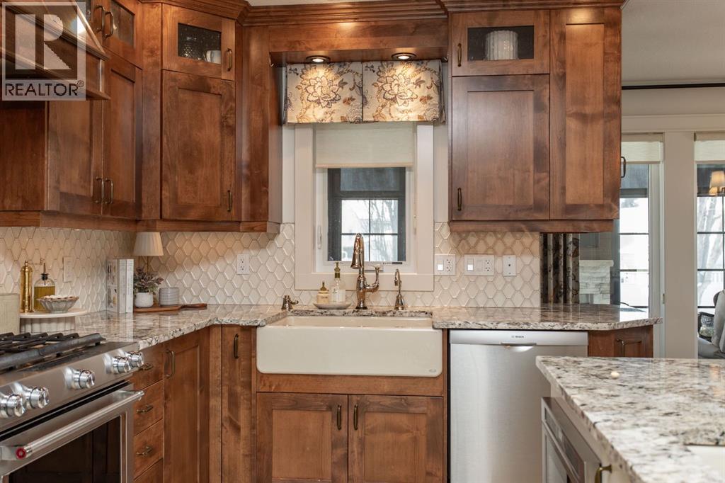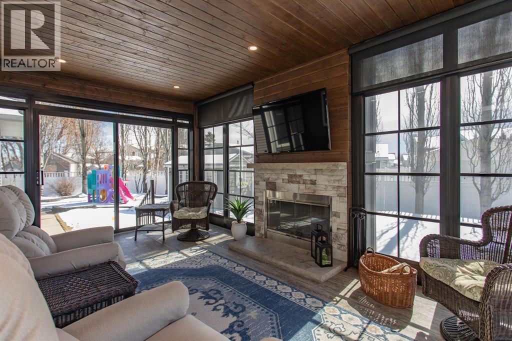 Tucked away in a quiet close, this stunning executive bungalow is a true hidden gem. Sitting on a massive pie lot and facing on to a green space, the home has been comprehensively transformed inside and out and delivers the kind of space, quality, and lifestyle that appeal to even the most discerning of buyers. From the moment you arrive, the curb appeal sets the tone - stacked stone exterior, permanent architectural lighting, exposed aggregate driveway, beautiful professional landscaping, and a triple attached heated garage. A 22x24' double detached garage at the rear adds even more functionality, complete with vaulted ceilings, pot lighting, epoxy floor, and separate storage area. Inside, the main floor unfolds with rich hardwood and tile flooring, and a floor-to-ceiling stacked stone fireplace anchoring the living room with vaulted ceilings to the kitchen. The kitchen is nothing short of spectacular with custom cabinetry, granite countertops, a massive island with bar sink, Kohler cast iron farmhouse sink, upgraded stainless steel appliances, gas stove, and glass pendant lighting. A formal dining room, dedicated front office, and thoughtful layout make this home equally suited to entertaining and everyday living. The primary suite is a genuine retreat and connects to a spa-calibre 5-piece ensuite with a freestanding soaker tub, glass-enclosed shower, mosaic tile, walk-in closet with California closet built-ins, water closet, and all high end fixtures. Two additional main floor bedrooms and a 4-piece bath complete the main floor. The crown jewel of the outdoor space is the fully enclosed 4-season sunroom with cedar ceilings, mounted TV, and its own wood-burning fireplace. The fully developed basement is heated with in-floor heat and features a massive rec room with wet bar, theatre room (currently used as a gym), a 4th bedroom, 3-piece bath, and an oversized laundry room with solid oak cabinetry and a sink. This home features all top of the line mechanic al systems including a 2 stage high efficiency furnace, steam humidifier, water softener, UV light filters, central A/C, and a 4 zone underground sprinkler system. Other upgrades include all triple pane windows, shingles are 5 years old, solid core interior doors, all upgraded plumbing and light fixtures, and more. This is a home built for buyers who want everything in one place and refuse to compromise on beauty and quality. This immaculate home shines with pride of ownership and is an absolute pleasure to show. (id:63190)