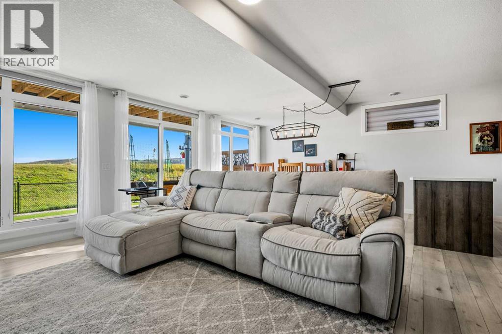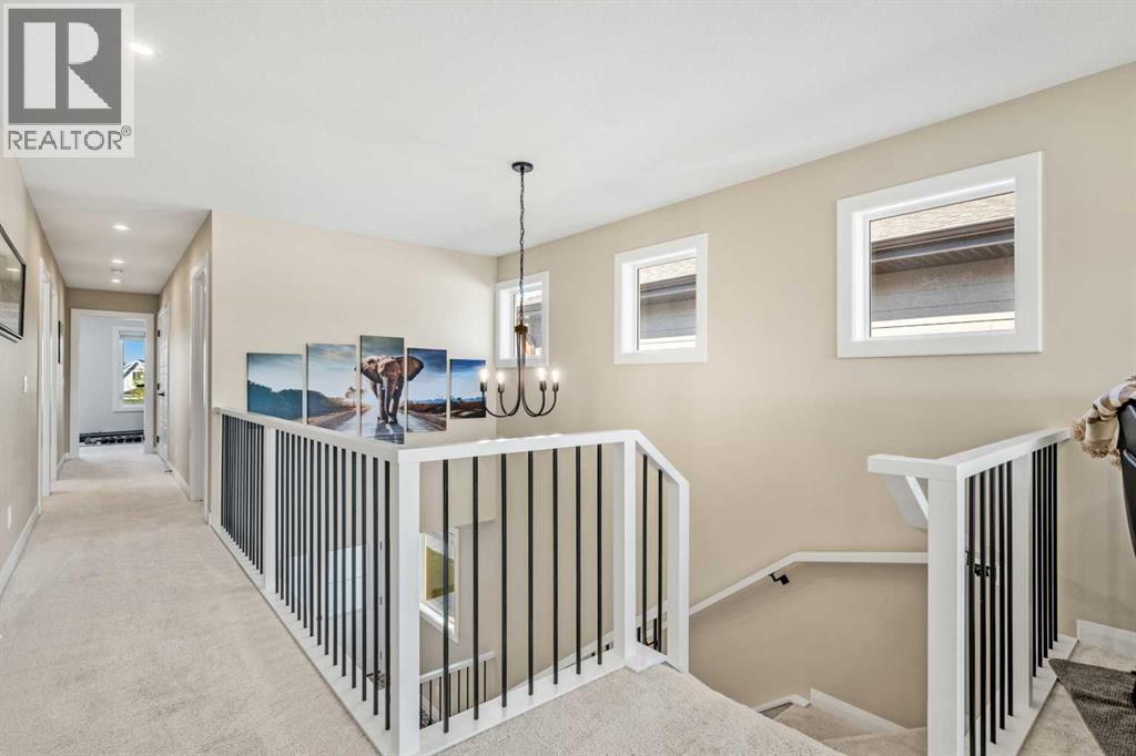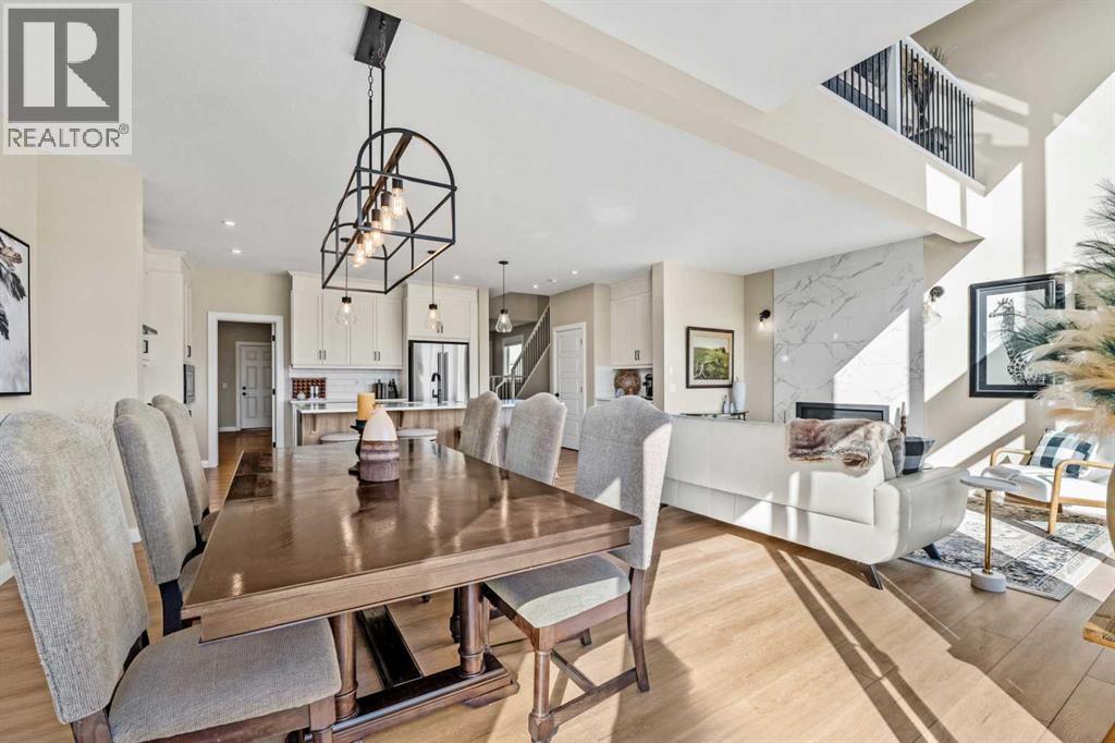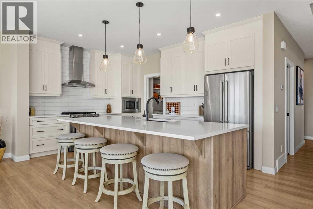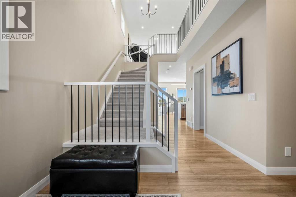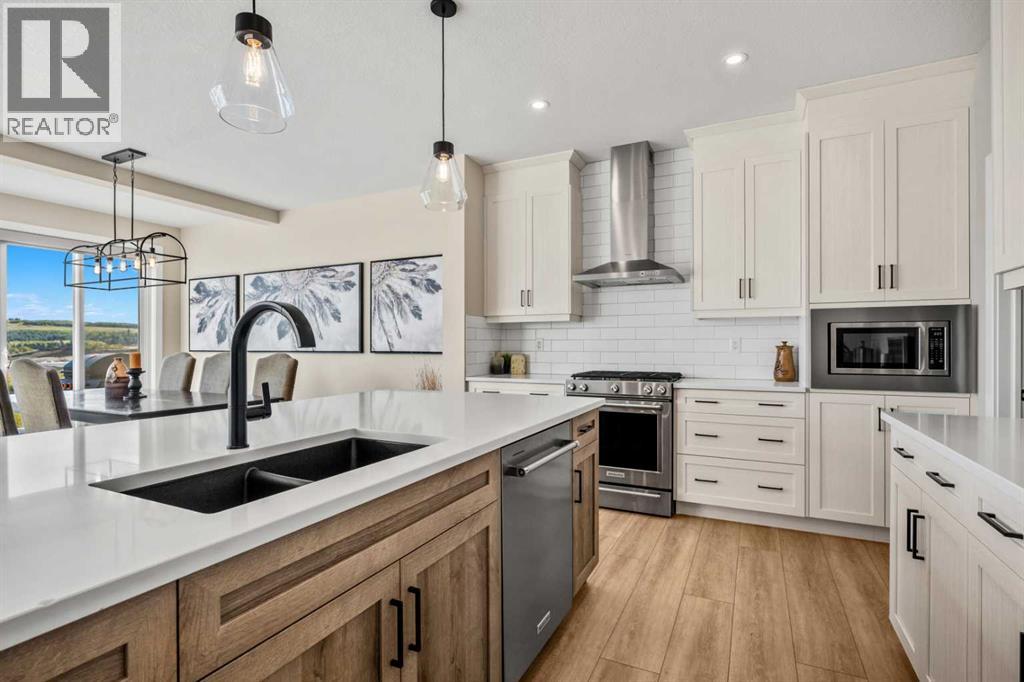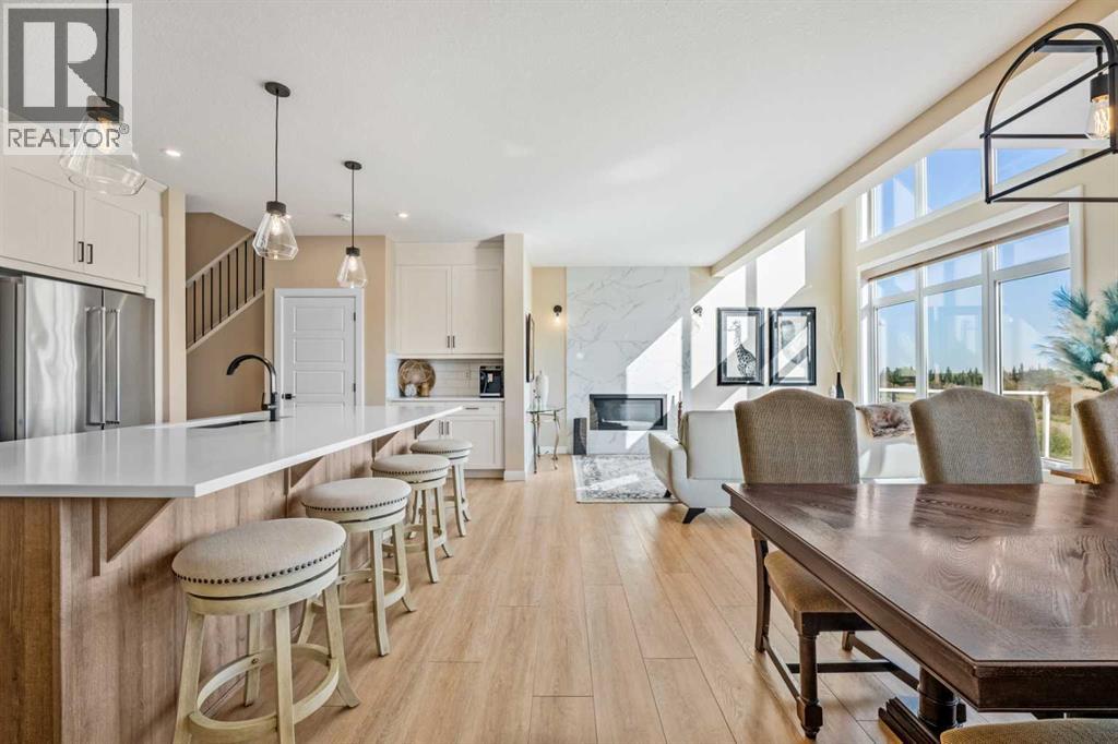 The One You’ve Been Waiting For – A Rare Find in Hudson at Pine Creek. Some homes check boxes - this one stops you in your tracks! A fully finished 2-storey walk-out in Hudson at Pine Creek, crafted for those waiting for the perfect home. With 2,600+ sq. ft. above grade and a beautifully developed lower level for 3,700+ sq. ft. total, it delivers lifestyle and setting. Towering windows frame rolling Foothills views, endless south/west skies, and trails steps from your back gate - a backdrop you won’t find again. Inside, every detail feels elevated yet inviting. The gourmet kitchen commands attention with its oversized island, gas range, full coffee bar and walk-through Butler’s pantry with custom live-edge countertop - ideal for daily living and stylish hosting. The open layout flows across wide-plank blond LVP floors under a soaring staircase that floods the entry with drama and light. Off the main living area, a massive deck with gas BBQ hookup and updated Tuff deck finish spans the back. Function meets polish with a spacious double garage leading to a mudroom with custom built ins. A main floor office/library/playroom adds versatility. Upstairs, the private primary retreat impresses with double walk-in closets, spa-like en-suite, and elevated views. The bonus room showcases panoramas, while two more large bedrooms (both with walk-ins) sit nearby. A dream laundry and well-planned bath make the upper floor both practical and stylish. The finished walk-out basement sets this home apart. With its own kitchen, oversized bedroom, bright living space, and abundant natural light, it’s perfect for multi-generational living or adult kids needing independence. Not using the illegal suite? Imagine the ultimate games room, home theatre, or an epic bar—this level adapts to your vision. Step outside to a maintenance-free yard with premium artificial turf and direct trail access. A large playground across the street offers open space for games and gatherings. Extras push this ho me over the top: exterior wrapped lighting (no more Christmas lights), programable motorized blinds that let in light while blocking heat, custom built-ins, upgraded powder room vanity, AC, and dual-zoned HVAC. Even the exterior is fully finished for pure, no-maintenance enjoyment. If you’ve been waiting for a home that stands out—a rare blend of style, function, and setting—this is it! Move-in ready, unforgettable, and truly one-of-a-kind. (id:63190)