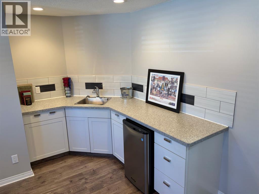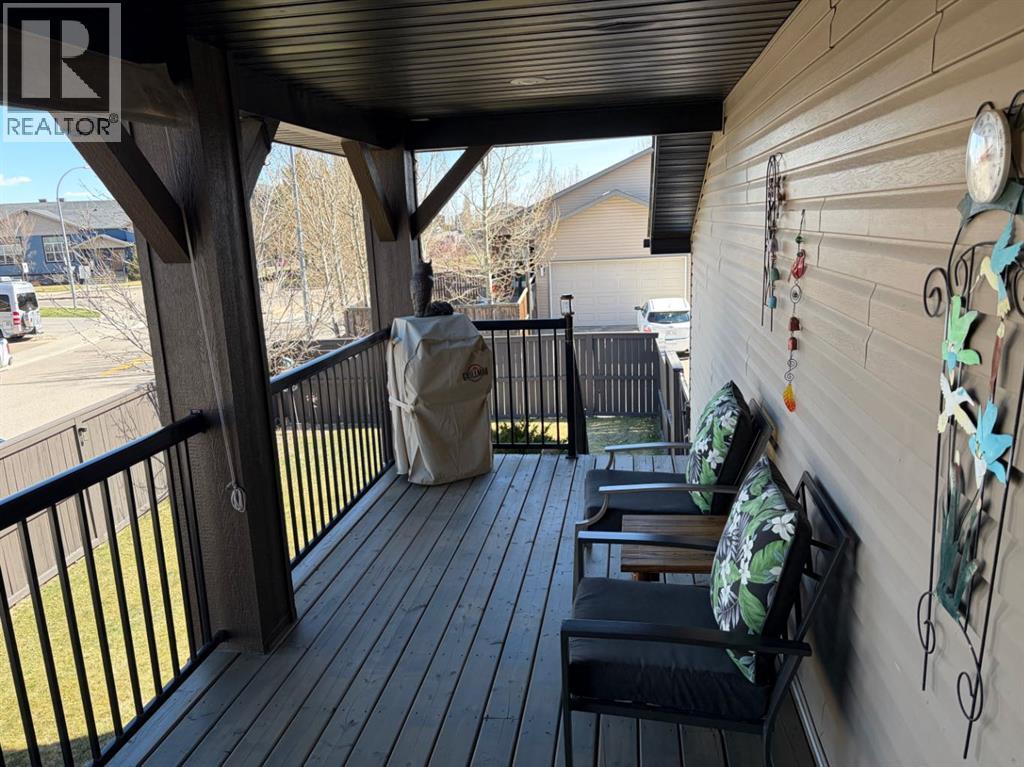 Impeccably maintained with splendid natural light! Ideally designed for a corner lot, this fully developed unique bilevel is ready for you to move into. From the street the character and charm of the front wrap-around verandah grabs your attention, and once you step into the huge front entrance you just might be hooked. The interior features an open kitchen layout that showcases brilliant east facing glass, a generous island with power, and quality deep stained maple cabinetry with under cupboard lighting. The kitchen eating area spills out onto a sheltered and shaded deck that takes you down to a sunny back yard. The primary bedroom is up over the garage, offers plenty of room, and has a convenient step in/double shower in the private ensuite. Just off the spacious back entrance is where the laundry is located, which it tucked nicely out of the way. The basement was fullly finished in 2016 and has the window size and light that you would expect in a bilevel. A 3rd and 4th bedroom can be found down here with the back bedroom being exceptionally large. Can you find the "secret" storage cubby? A cozy family room sporting a corner wet bar complete the lower living space, which would lend itself quite nicely to short term rentals or long term family visits. Shingles, fascia, eaves, and downspouts were replaced in 2014, the high efficiency furnace in 2016, and hot water tank in 2020. The rear attached garage is insulated and drywalled, has 10'8" ceilings, and gives you exciting vertical storage space possibilities. Being on a corner lot you'll have plenty of parking for your guests too. Just steps away from fabulous walking trails and pathways. (id:63190)