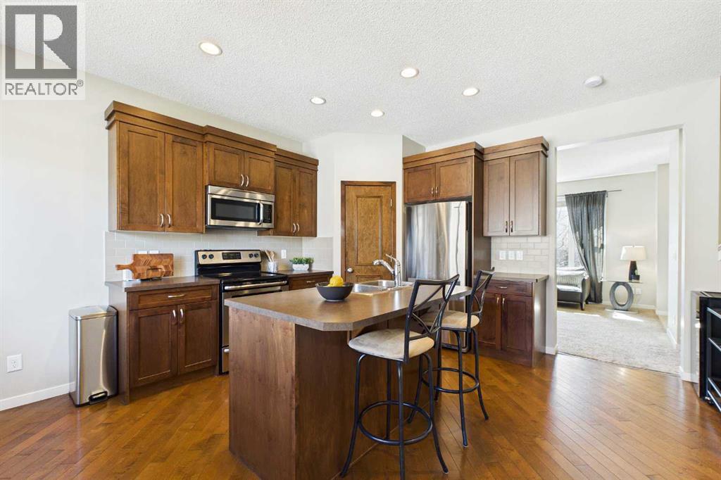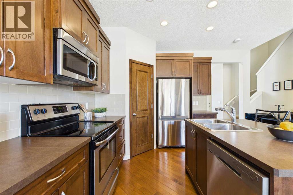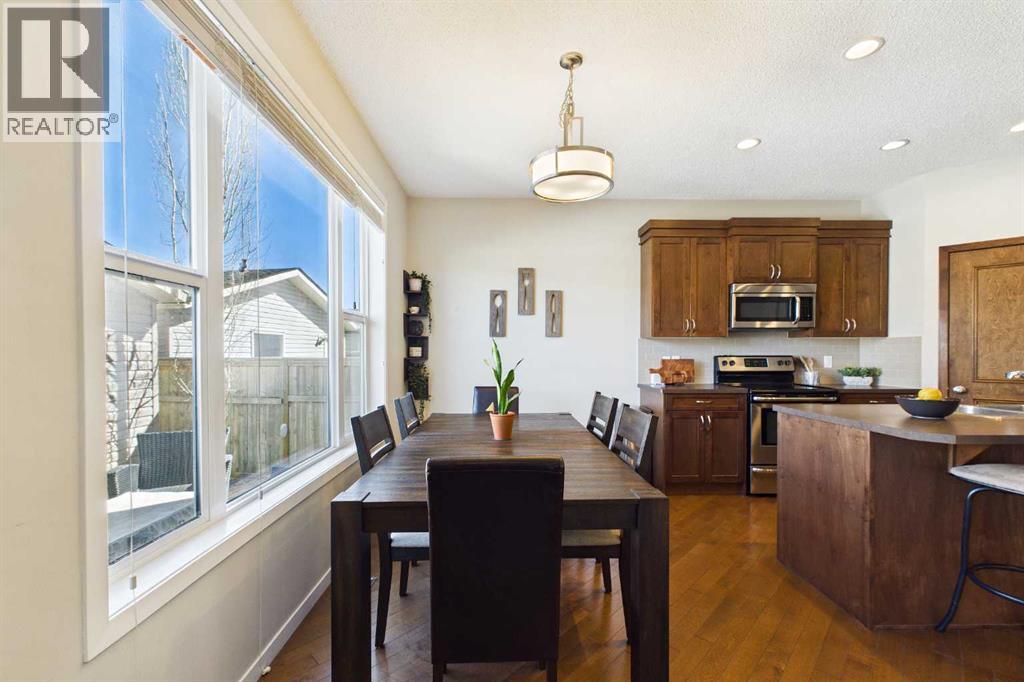 Welcome to this beautifully maintained 3-bedroom, 2.5-bath family home, offering a perfect balance of style, comfort and everyday functionality. Located on a quiet street in the sought after community of Cranston! Thoughtfully designed with 9’ ceilings, large windows, and modern finishes throughout, the bright main floor features an open-concept layout ideal for both relaxing and entertaining. A sun drenched south facing living room welcomes you to the home featuring a cozy gas fireplace. The upgraded kitchen features dark cabinetry, stainless steel appliances, a central island, a corner pantry, and rich hardwood flooring, all flowing into a spacious dining area perfect for hosting. At the rear of the home, a practical mudroom leads out to a fully fenced & landscaped backyard with a generous 2 tiered deck and a double detached garage, offering both convenience and a great outdoor living space. Upstairs, the spacious primary suite includes California Closet built-ins showcasing the large walk in closet, and a private 3pc ensuite, while two additional bedrooms and a full bathroom provide plenty of room for family or guests. The basement offers great potential for future development with two large windows and a bathroom rough-in. Additional features include a tankless hot water heater for greater efficiency. Ideally located in a family-friendly community close to top-rated schools, amenities, the HOA facility, parks, pathways, the Bow River, and with easy access to Deerfoot and Stoney Trail-this move-in ready home is an incredible opportunity. (id:63190)
