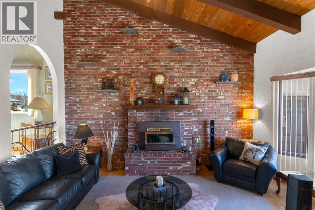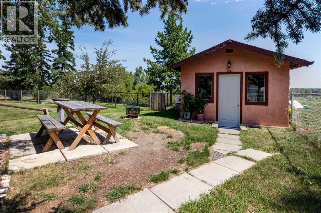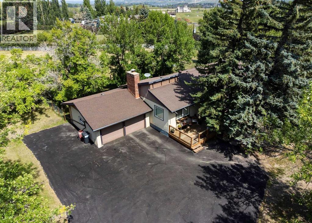 Welcome to this ‘close in’ charming starter acreage with quick highway access to south Calgary’s numerous amenities in Shawnessy & Seton including the South Calgary Hospital. Approx. 4 minutes to Seton and 10 minutes to Shawnessy. Situated on 4.1 acres the property has a private country feeling and is beautifully treed with mature vegetation and is fenced and cross-fenced with 2 large pastures inter-connected at the side and back of the property suitable for horses. The entry is gated and driveway paved including being resealed. The acreage also features a 14’ x 22’ heated studio perfect for an artist, separate office space or kids’ play area as well as a 22’ x 36’ workshop. This character filled home has been well-maintained with 2,200 sq. ft. of developed space with 1,361 sq. ft. on the main floor. There is a 2-car attached garage for colder nights, newer large front and rear decks ideal for outdoor relaxation, as well as a fenced area for the fur babies or kiddos. With a total of 4 bedrooms and 2 bathrooms this bright home is an ideal young family acreage or for those looking to have their first acreage. The main floor has a cozy sunken family room with brick faced fireplace, exposed beams and vaulted ceiling, with a somewhat Spanish influence feel dining nook off to the side. The kitchen is bright and has a traditional feel with good counter space. Three bedrooms on the main floor and 4-piece bathroom and an extra flex living space complete that level. The lower level is fully finished and is set-up as an illegal suite with full kitchen, bedroom, spacious 3 pce bathroom/laundry room combination and a cozy living area. Could also be a great teenager or mutli-generational living space. Over recent years since purchasing the owner has maintained the home and added or replaced various items. A significant addition was having a new well drilled in 2025 improving the pumping rate. Other work has included new vinyl windows, replacing the vacuum system, adding vent s, newer toilets, newer appliances in the basement, newer fixtures in bathrooms, ceiling fans, carpets, painting, attic insulation, updating of some wiring, replaced eavestroughs & gutters, new man door in garage, new hot water tank 2025, new carpet in the basement, added kitchen hood vent, newer ceiling fans and other items. (id:63190)