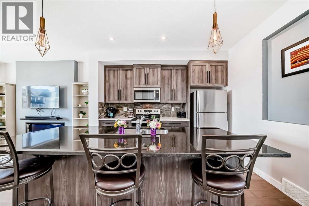 Welcome to Lanark, a community thoughtfully designed with pathways that connect you to scenic parks, playgrounds, picnic areas, soccer fields, a hockey rink, as well as nearby schools and shopping. This beautiful modern three-bedroom townhouse comes with no condo fees. The open-concept main floor is bright and spacious, featuring 9-foot ceilings and an inviting great room with an elegant fireplace. The kitchen is well-appointed with granite countertops, a centre island with breakfast bar, classic cabinetry, and updated stainless steel appliances. A cozy dining nook and convenient powder room complete the main level. Step outside to a rear deck that leads down to a fully landscaped yard, highlighted by a charming walkway to your double garage. The garage is a full double, and the back alley is fully paved for easy access. Upstairs, the primary suite offers a relaxing retreat with a walk-in closet and a four-piece ensuite featuring a granite vanity. Two additional bedrooms and a full four-piece bathroom provide comfort and convenience for the whole family. The unfinished lower level is ready for your personal touch—perfect for creating your dream space. As an added bonus, enjoy a south-facing front porch with a concrete pad, ideal for relaxing outdoors. This home also includes air conditioning for year-round comfort. A true gem with no condo fees—book your viewing today! (id:63190)