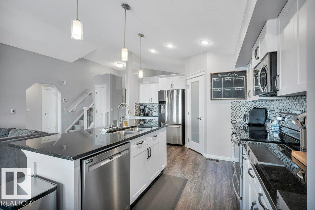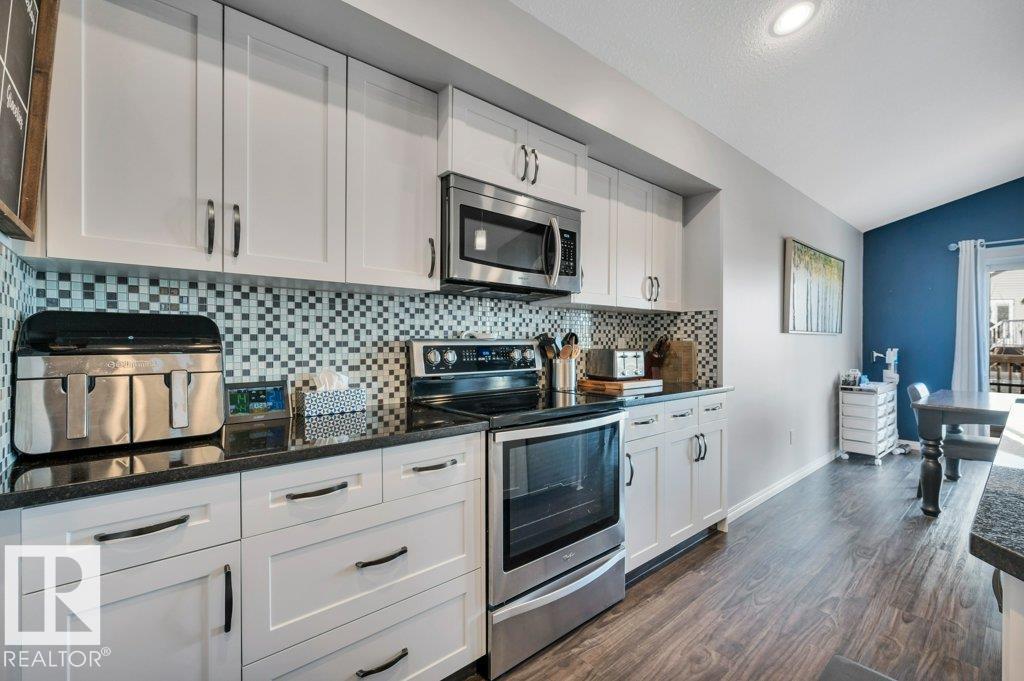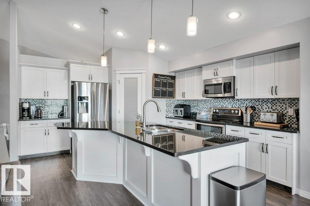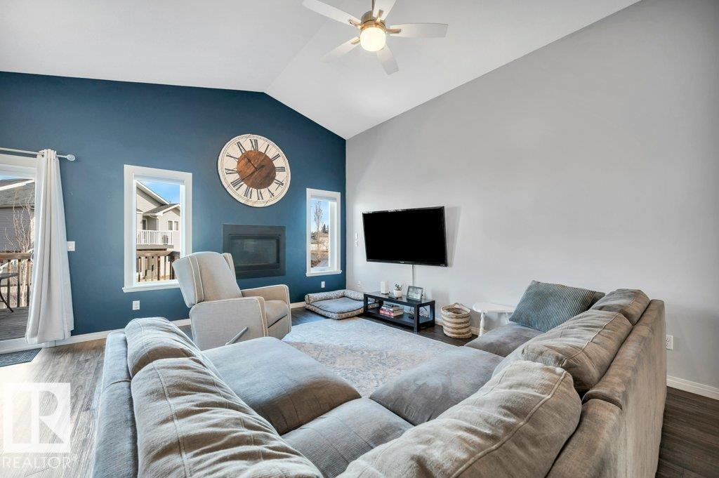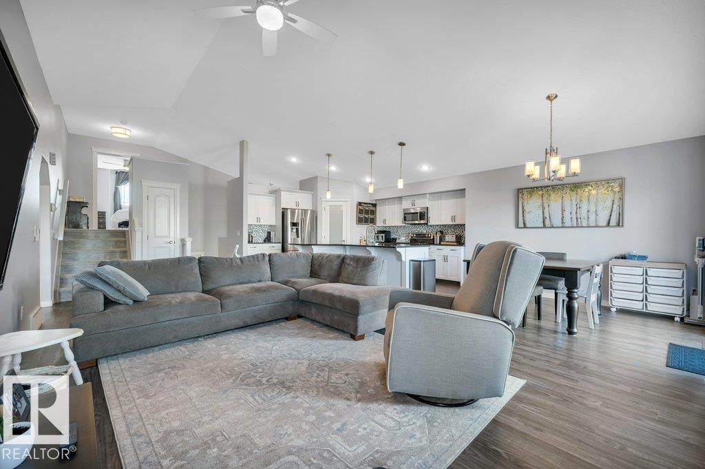 BIG, BEAUTIFUL BI-LEVEL offering a total of 2757 sqft of living space, located in a quiet, family-friendly neighbourhood in the growing community of Gibbons. Bright, generous entry of the home invites you to the main level, that features vinyl plank flooring, fresh paint, impressive vaulted ceilings & an open-concept layout, ideal for everyday living & entertaining. The spacious living room complimented by cozy gas fireplace, flows into the dining area & kitchen. Good working kitchen highlights gorgeous, granite countertops with eat up bar, tile backsplash, corner pantry & SS appliances. Step out onto the deck & enjoy the backyard space w/ greenhouse, dog run, storage under the deck. Find 2 Bedrooms & 4pc Bath on the home's main level. Large Primary Bedroom on upper level presents walk-in closet, 4pc ensuite w/ corner jacuzzi tub & separate shower. Handy laundry room at entrance level. Expansive basement ready for your design. Close to schools, parks, trails & amenities. 20 min to Fort Sask & N. Edmonton (id:63190)