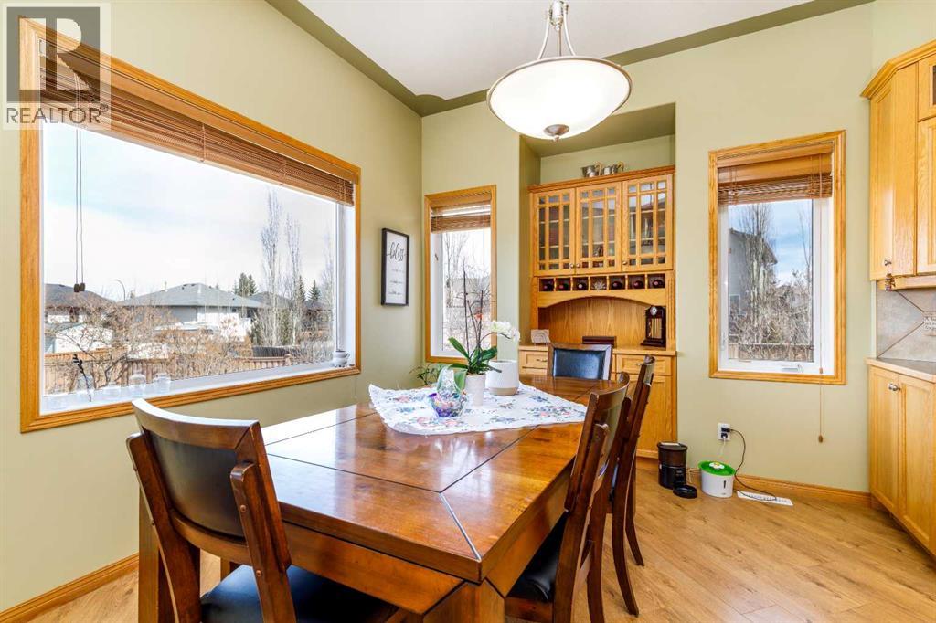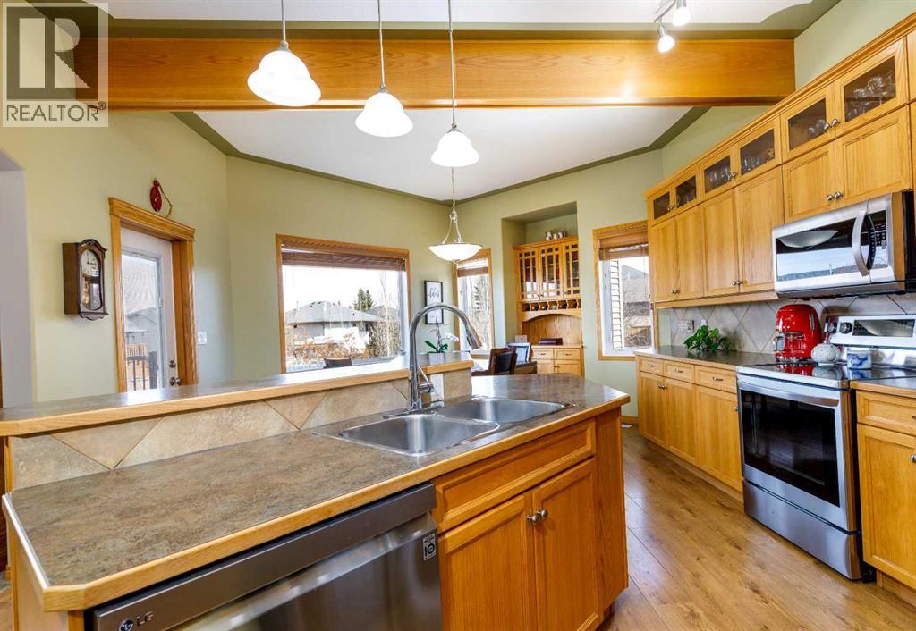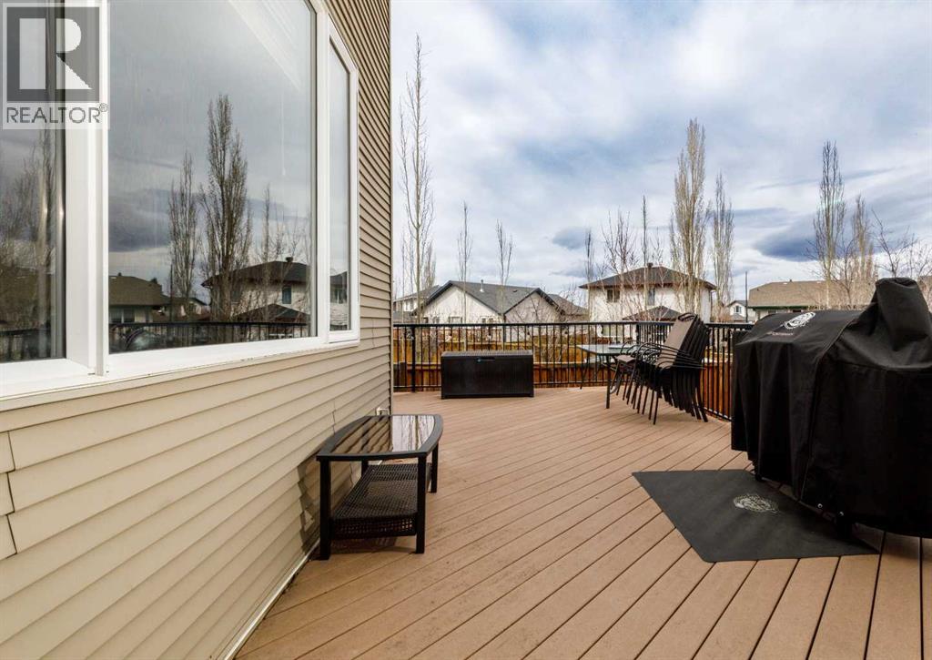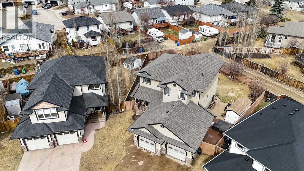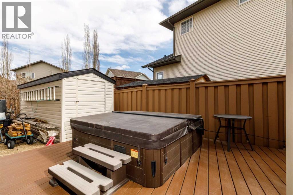 Fully finished 2-storey home offering 6 bedrooms and 4 bathrooms, including 4 bedrooms on the upper level—ideal for a growing family. The main floor features an open and spacious kitchen with an island, laminate flooring, and a nice sized dining area with direct access to the wraparound deck. Also find a good sized office and laundry room for convenience. This is perfect for everyday living and entertaining. The bright family room is highlighted by a cozy two-sided gas fireplace, large window overlooking the yard creating a warm and inviting atmosphere.The fully developed lower level provides additional living space, extra bedrooms, and flexibility for guests or family. Cosey theater area and in-floor heating creates a very comfortable area.Situated on a large pie-shaped lot in a quiet close, this property offers excellent outdoor living with a wraparound deck plus a second deck complete with a built-in hot tub—ideal for relaxing or hosting gatherings. The shed, playhouse combo is unique.This one-owner home shows pride of ownership throughout and includes a double attached garage, exposed aggregate driveway, and underground sprinkler system for added convenience. Located close to schools, parks, and walking paths, it offers a great combination of space, functionality, and location. (id:63190)