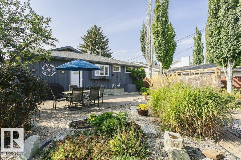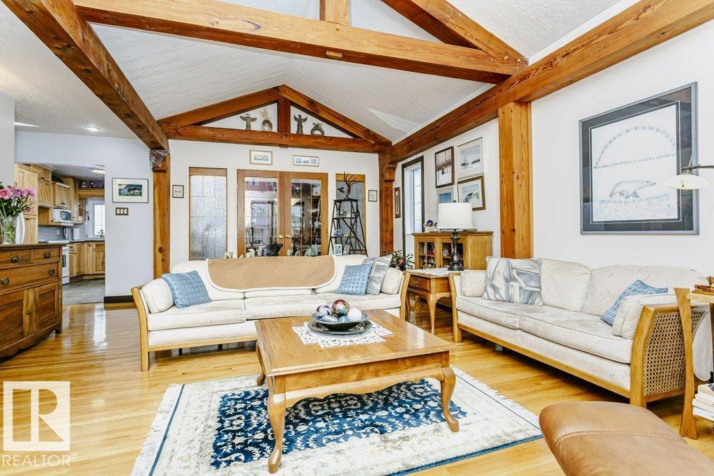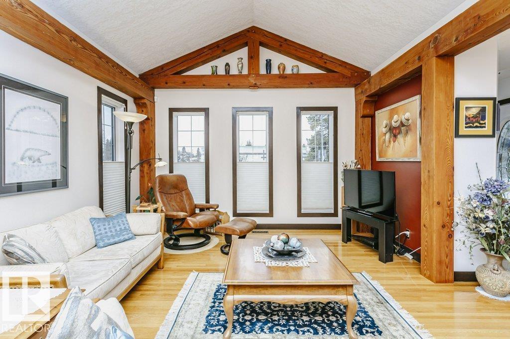 Curb Appealing and Immaculate. Expansive bungalow in very desirable Lynnwood features a distinctive open wood beam design that adds architectural character and warmth throughout. This exceptional property offers 4 bedrooms and a functional layout suited for a variety of living needs. The main floor showcases a bright and inviting living space with striking vaulted ceilings and exposed timber frame beams, creating an airy and welcoming atmosphere. The kitchen and dining areas flow seamlessly, ideal for everyday living and entertaining. Generous bedroom sizes and a thoughtfully designed floor plan enhance comfort and versatility. The lower level provides additional living space with spa bath and a king sized bedroom with walk-in closet. A large recreation and storage area completes the space. Outdoors you will appreciate the perennial gardens and quiet mature lot. Located in a prime park facing location, close to schools, parks, shopping, LRT and amenities - a rare opportunity in a desirable neighbourhood. (id:63190)
