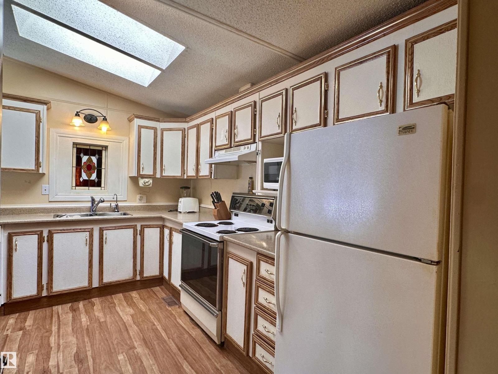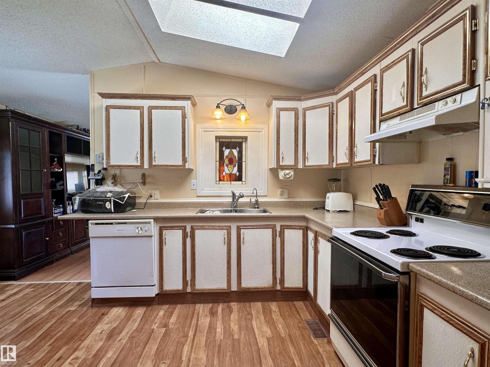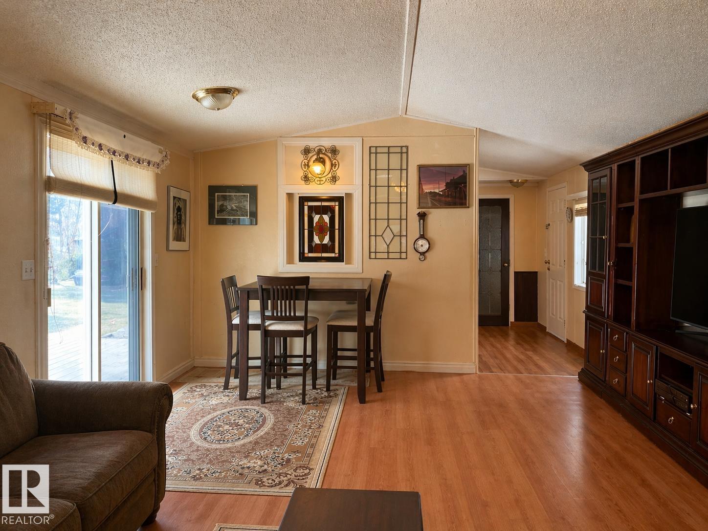 Front porch comfort in Fawcett! The double lot alone makes this property feel grand and private, thanks to the towering trees all around. Well maintained 1990 mobile home with garage. Step into large entry area, lots of space for your boots. Tons of natural light flood the kitchen and dining area, with skylight and patio doors. Beautiful South facing deck off the kitchen into the fully fenced back yard, ready for your furry friends. Very spacious living room equipped with a stunning and efficent wood burning stove. The primary bdrm is a good size, but the expansive 5 pc ensuite bathroom is a true prize. Two more bedrooms, and another 4 pc bath complete the home. Asphalt driveway to double garage, with lean-to. Serene and private, Fawcett is a beautiful community to get away from the city with lots to offer; a general store, hall, baseball diamonds and lots of community living! Take a little serene walk down to the creek to appreciate the train bridge. Only 15 minutes to Cross Lake Provincial Park. (id:63190)