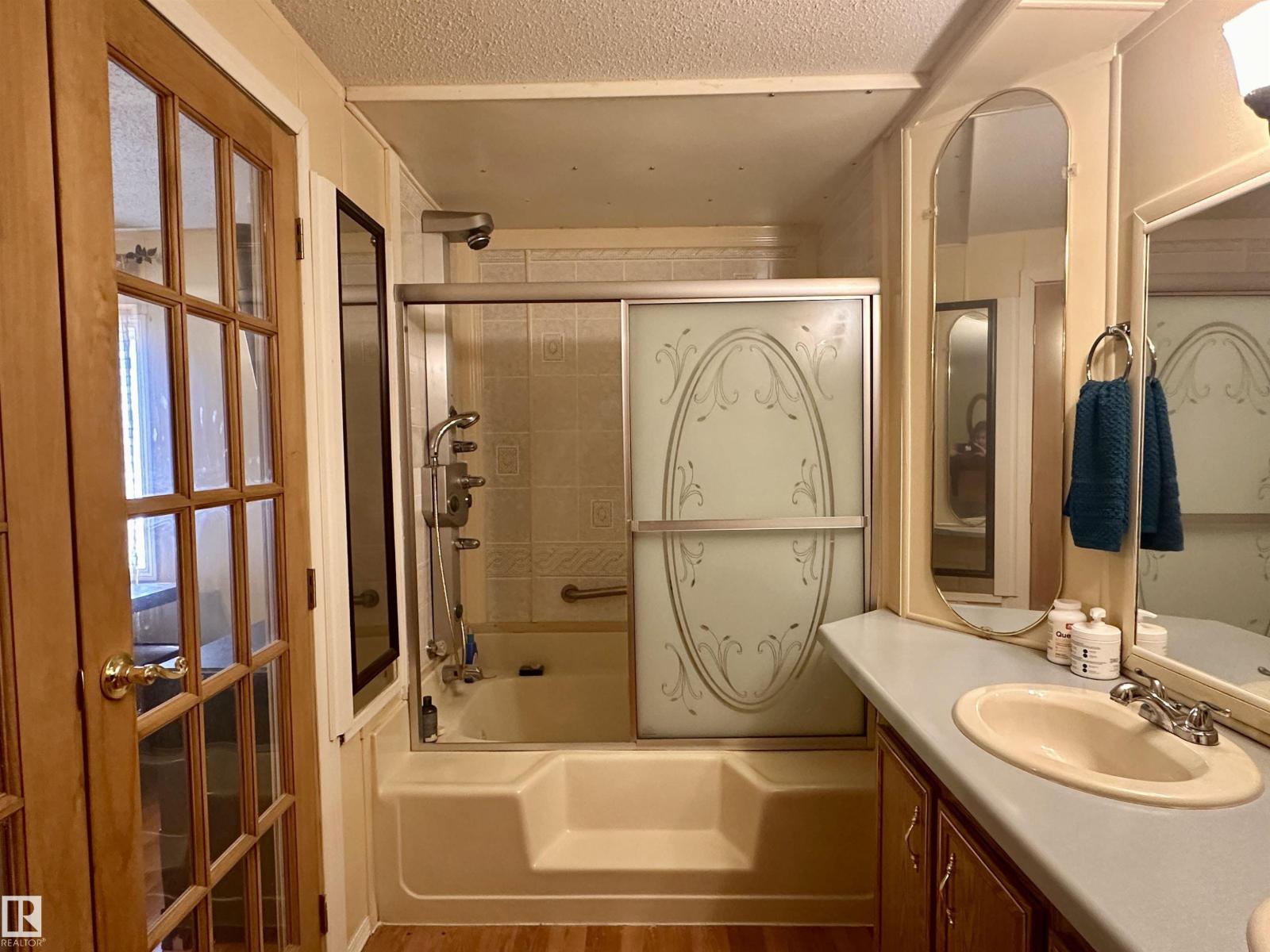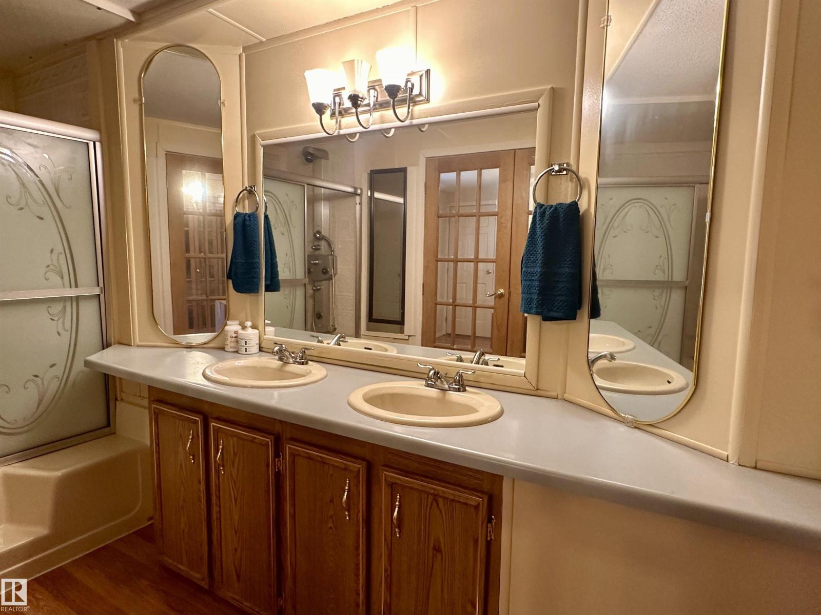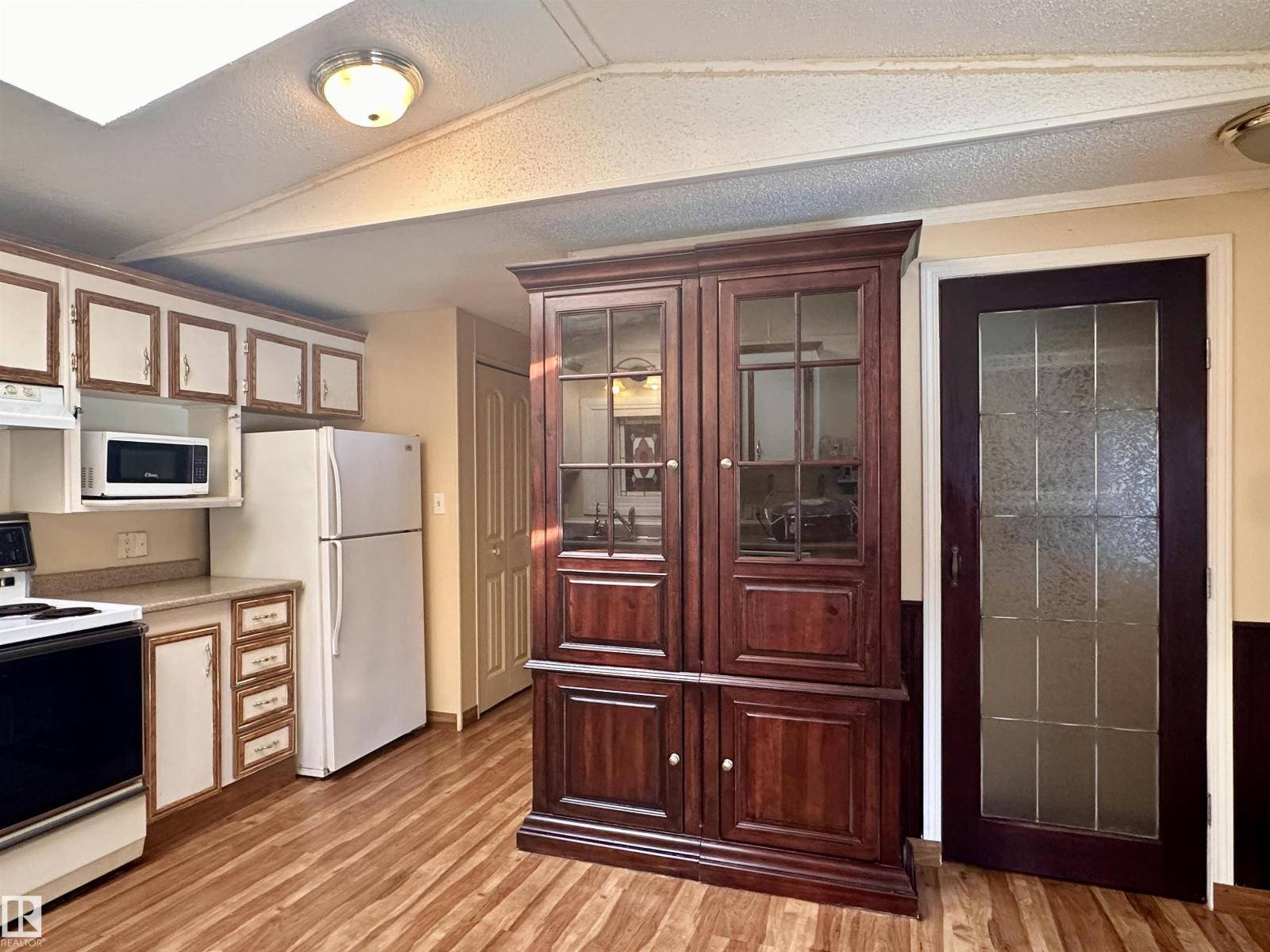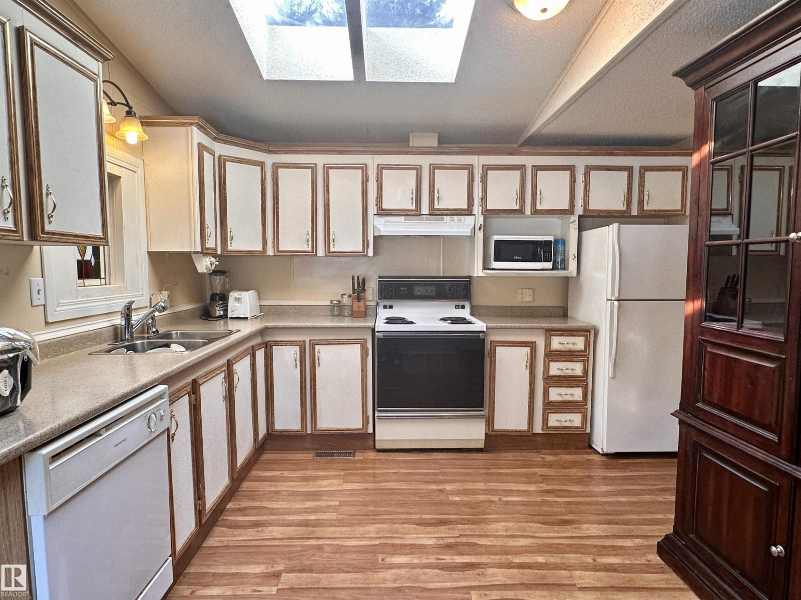 Front porch comfort in Fawcett! The double lot alone makes this property feel grand and private, thanks to the towering trees all around. Well maintained 1990 mobile home with garage. Step into large entry area, lots of space for your boots. Tons of natural light flood the kitchen and dining area, with skylight and patio doors. Beautiful South facing deck off the kitchen into the fully fenced back yard, ready for your furry friends. Very spacious living room equipped with a stunning and efficent wood burning stove. The primary bdrm is a good size, but the expansive 5 pc ensuite bathroom is a true prize. Two more bedrooms, and another 4 pc bath complete the home. Asphalt driveway to double garage, with lean-to. Serene and private, Fawcett is a beautiful community to get away from the city with lots to offer; a general store, hall, baseball diamonds and lots of community living! Take a little serene walk down to the creek to appreciate the train bridge. Only 15 minutes to Cross Lake Provincial Park. (id:63190)