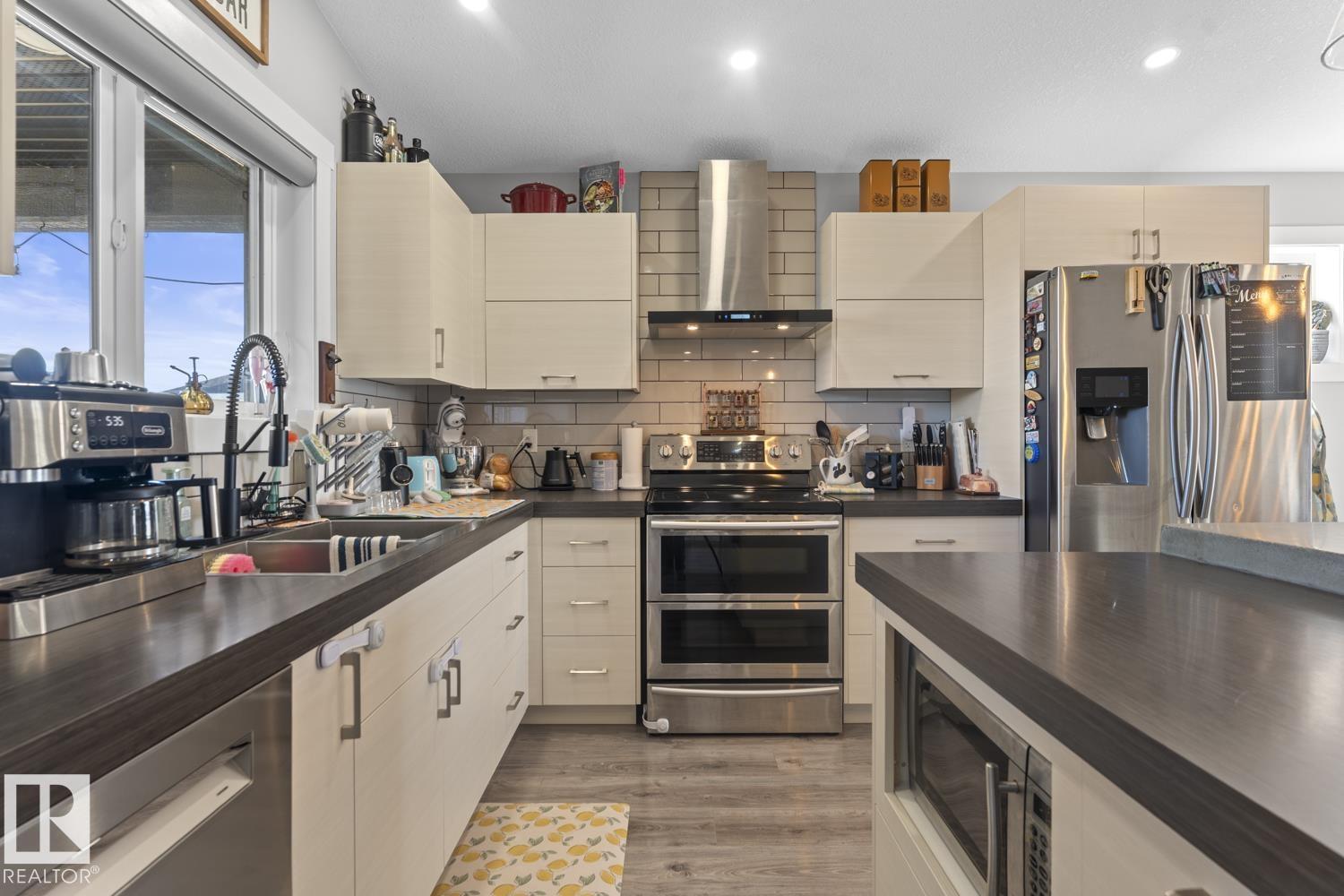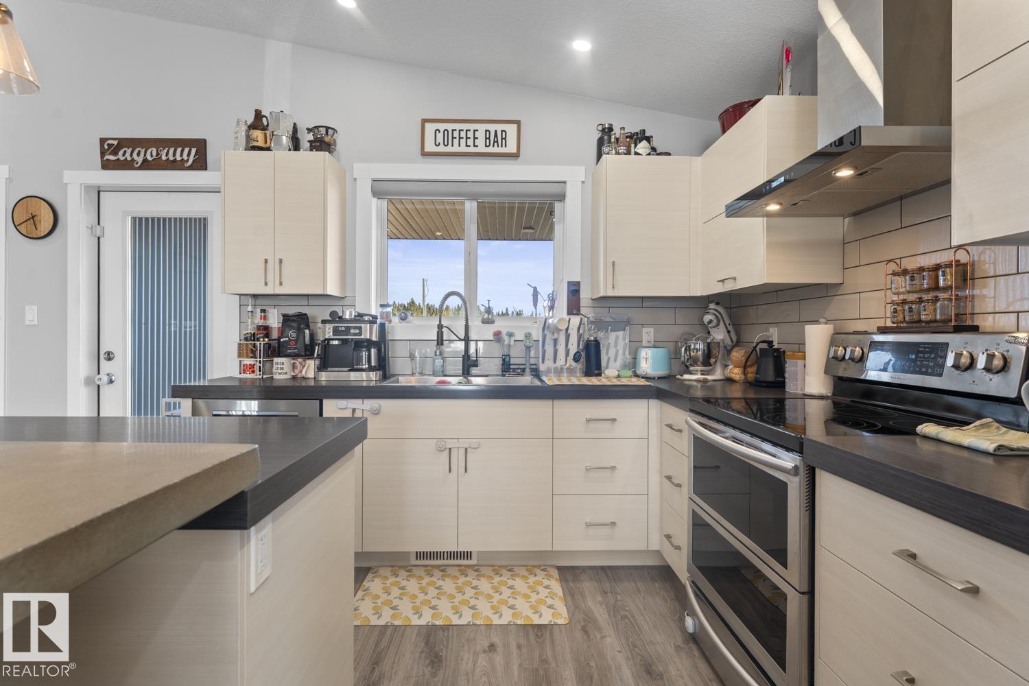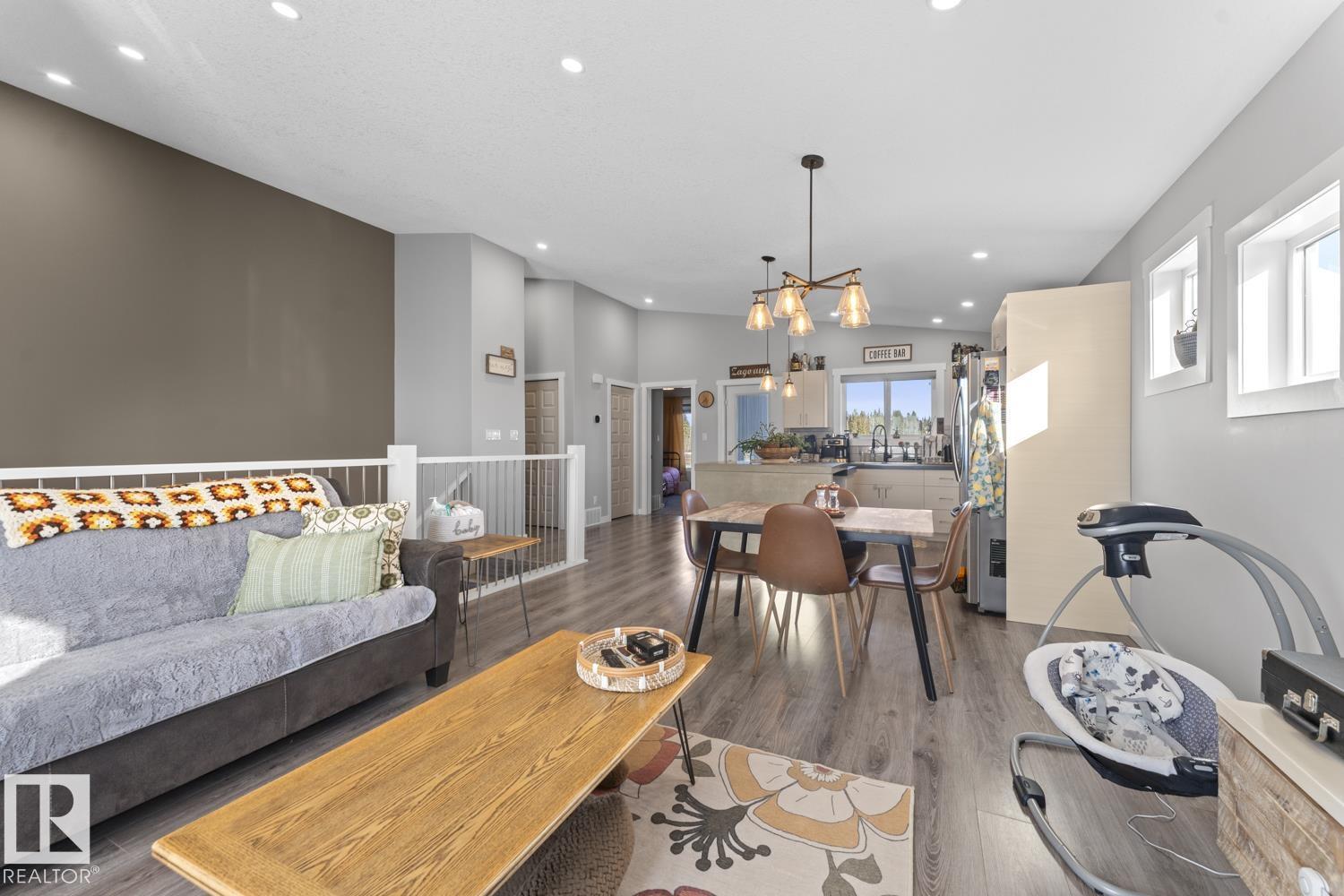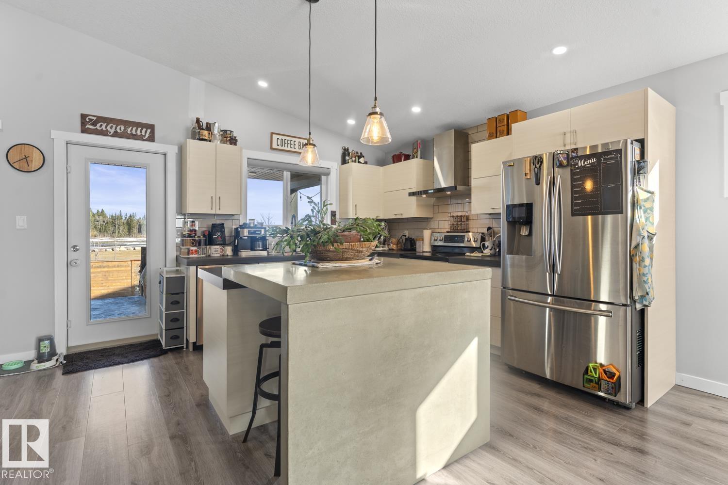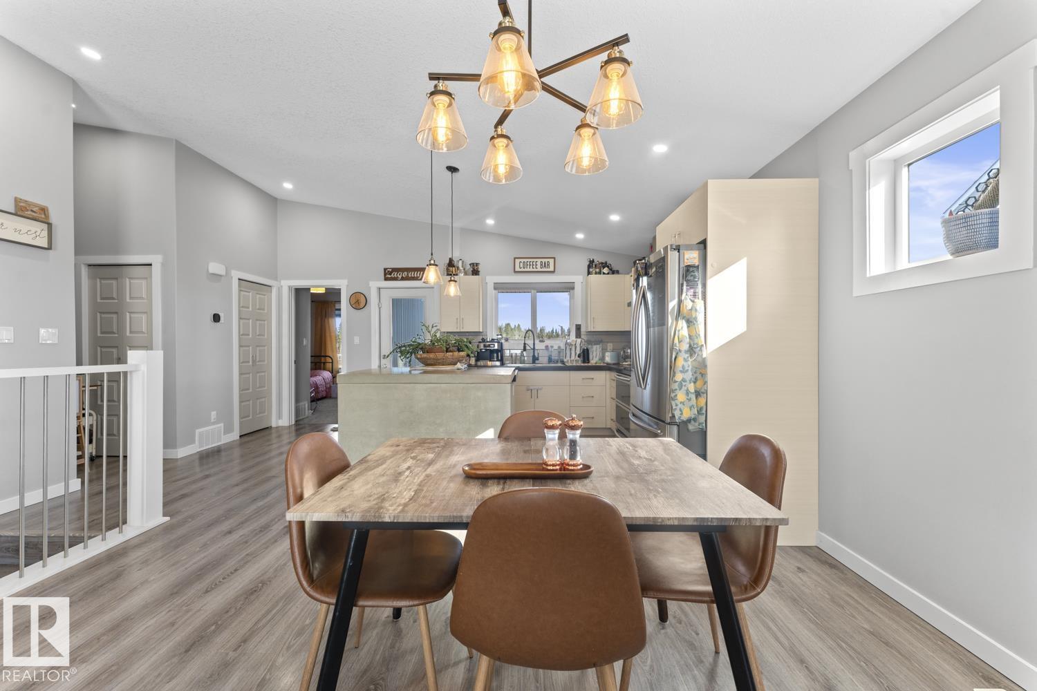 This luxurious modern home is located in sought after Lakewood Estates Subdivision in Cold Lake North, built in 2018 with 4 bedrooms and 2.5 bathrooms. Before you even enter this home, you know it has top quality finishes and design! Single pitch metal roofing, hardie board and metal exterior with a new stone front facade, stamped concrete boarders along the massive driveway. Inside of this modified bilevel you'll find an open concept main floor living space with vaulted ceilings, kitchen with oversized island with concrete waterfall feature, ample dining space and a nice bright living room with west facing windows. One bedroom just off the main floor and two up including the spacious primary bedroom equipped with a 3 piece ensuite with a nice tiled shower. Lower level is fully finished with heated stamped concrete floors throughout, 4th bedroom, rec room and laundry room with a 2 piece bathroom, lastly there is access to the garage walk up. Garage is fully finished and heated with additional work area. (id:63190)