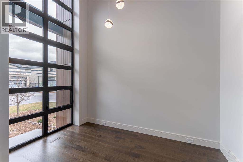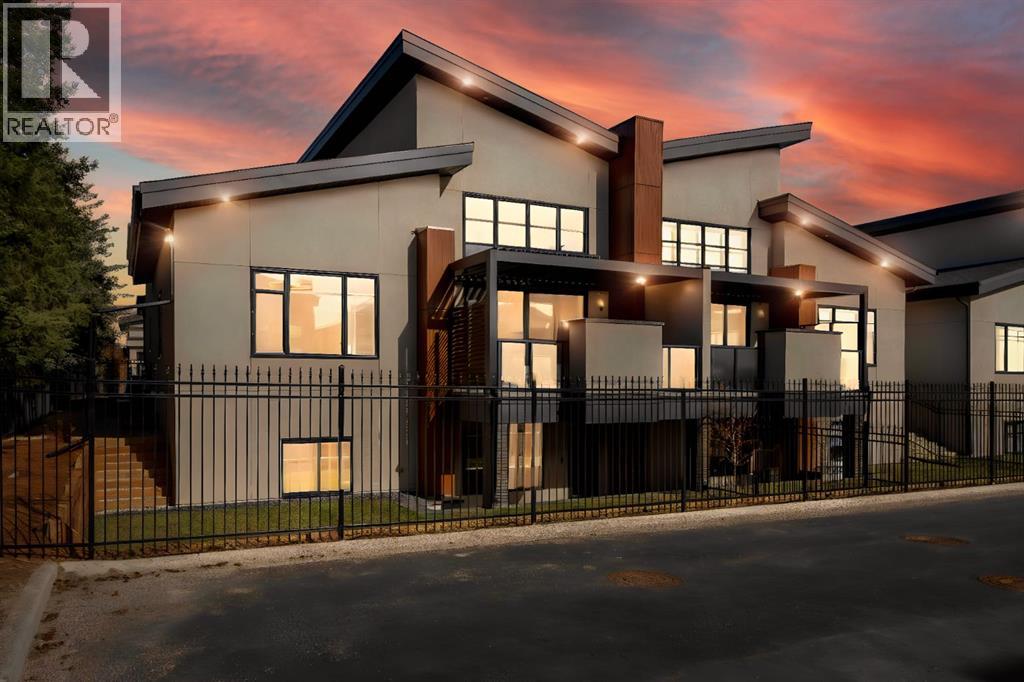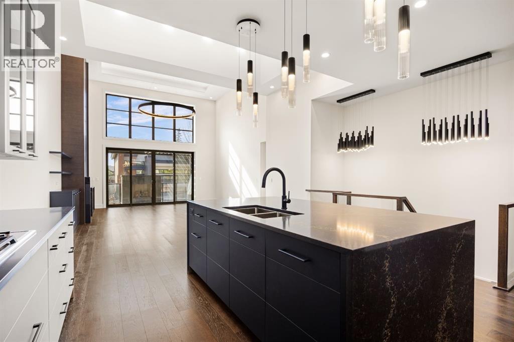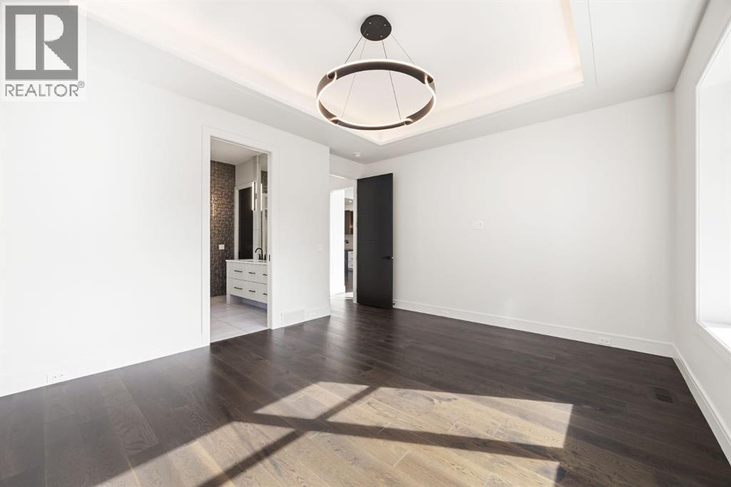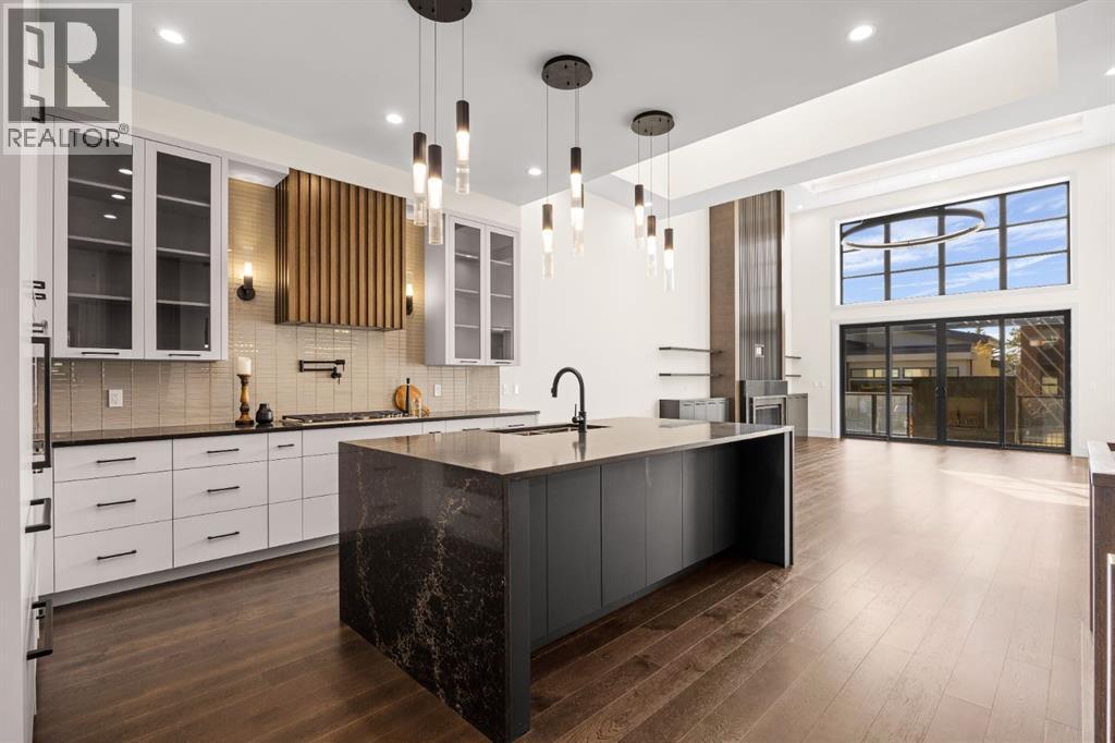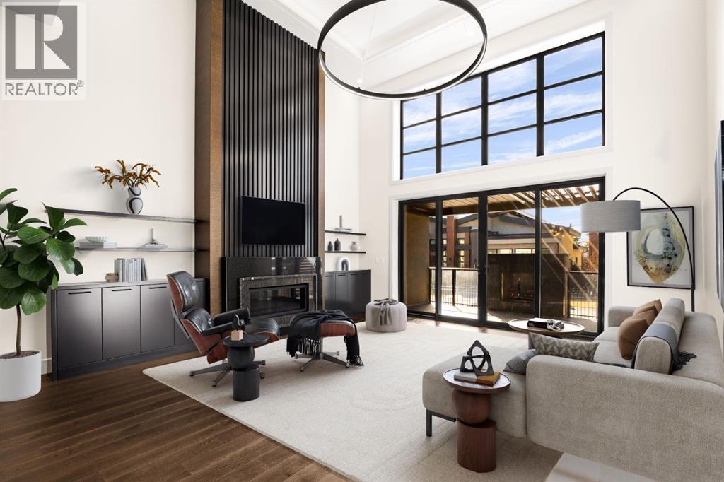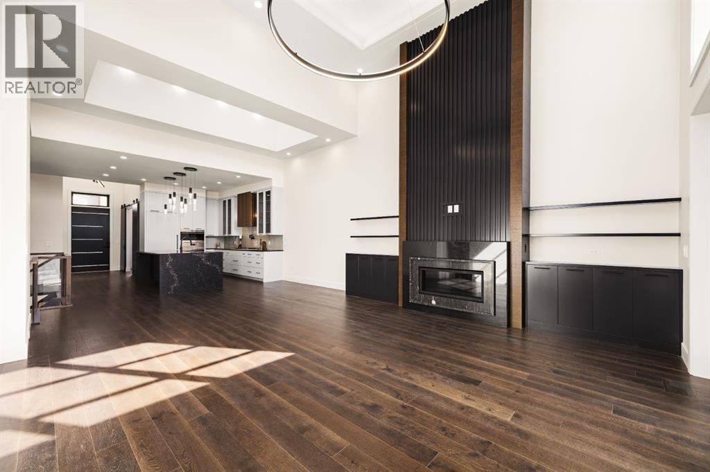 Presenting an opportunity to own a never-lived-in residence in Elveden Court, a prestigious and sold-out community of only 26 bungalow villas on Calgary’s west side. This luxury home represents the pinnacle of "smartsizing," specifically designed for discerning homeowners who refuse to compromise on quality while seeking the ultimate lock-and-leave lifestyle. Whether you are spending your winters south or your weekends in the mountains, this home offers the peace of mind and maintenance-free ease you’ve been looking for without sacrificing bespoke finishes and premium construction. The interior is a masterclass in modern elegance, defined by a high-contrast palette where dark elements meet crisp gallery walls and gleaming floors. The open-concept main level features soaring ceilings, multiple skylights, and expansive windows that flood the space with natural light. A custom fireplace surround reaching the 16’ ceilings anchors the great room creating a chic focal point in the home, while large doors transition seamlessly to a west-facing patio. This outdoor oasis extends the living space and is elevated by a built-in gas fireplace and a remote-controlled louvred pergola, allowing customized sun exposure or protection from the elements while entertaining.The kitchen is a flawless blend of style and utility, featuring premium, integrated Wolf and Sub-Zero appliances, custom cabinetry, plenty of counter space and a commanding island wrapped in deep, inky quartz that provides a sophisticated contrast to the light cabinetry. The main floor continues to impress with a primary suite that serves as a true sanctuary, boasting a walk-in dressing room and a spa-inspired ensuite with in-floor heat, dual vanities, a sizeable shower and a freestanding soaker tub. A private den with sleek barn door access, a mood-filled powder room featuring bold designer wallpaper and a statement pendant light, and a well-appointed laundry room complete the main level, ensuring all your daily es sentials are accessible on one floor.The fully developed lower level, with nine-foot ceilings and a second fireplace, is engineered for lifestyle flexibility and hosting. A generous recreation area features a designer wet bar with custom glossy millwork and dual refrigeration, while two additional bedrooms provide ideal accommodations for guests or teens. A flex room offers the perfect footprint for a home gym or hobby space. The spacious lower patio leads directly to the fenced, private west facing yard. The oversized double garage boasts a heated slab, transom windows and ceiling height to accommodate a car lift. Built to an exceptional standard with full Insulated Concrete Form (ICF) construction to the soffit line and triple-glazed windows, this home offers superior sound attenuation and thermal efficiency. Located just minutes from Aspen Landing and the Rocky Mountains, this villa offers an unparalleled blend of privacy and convenience for the next chapter of your life. (id:63190)