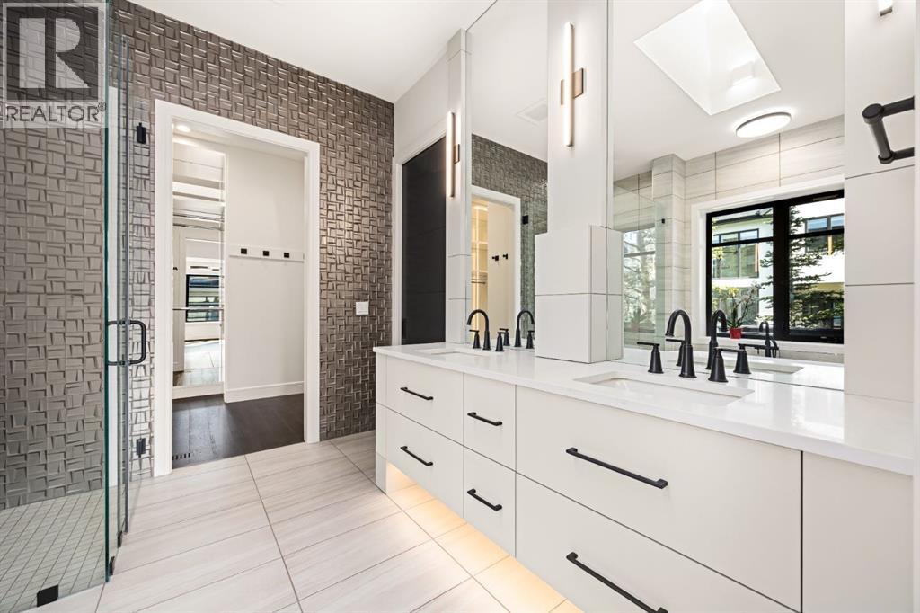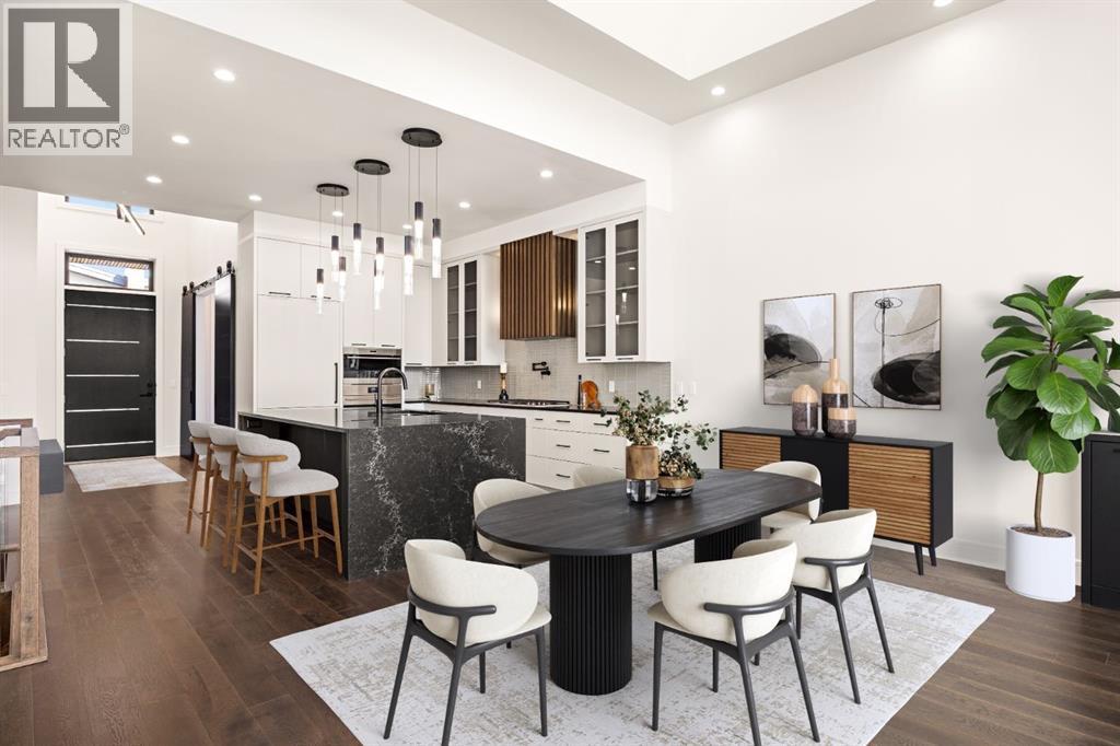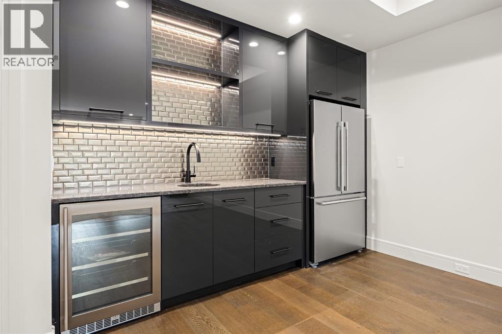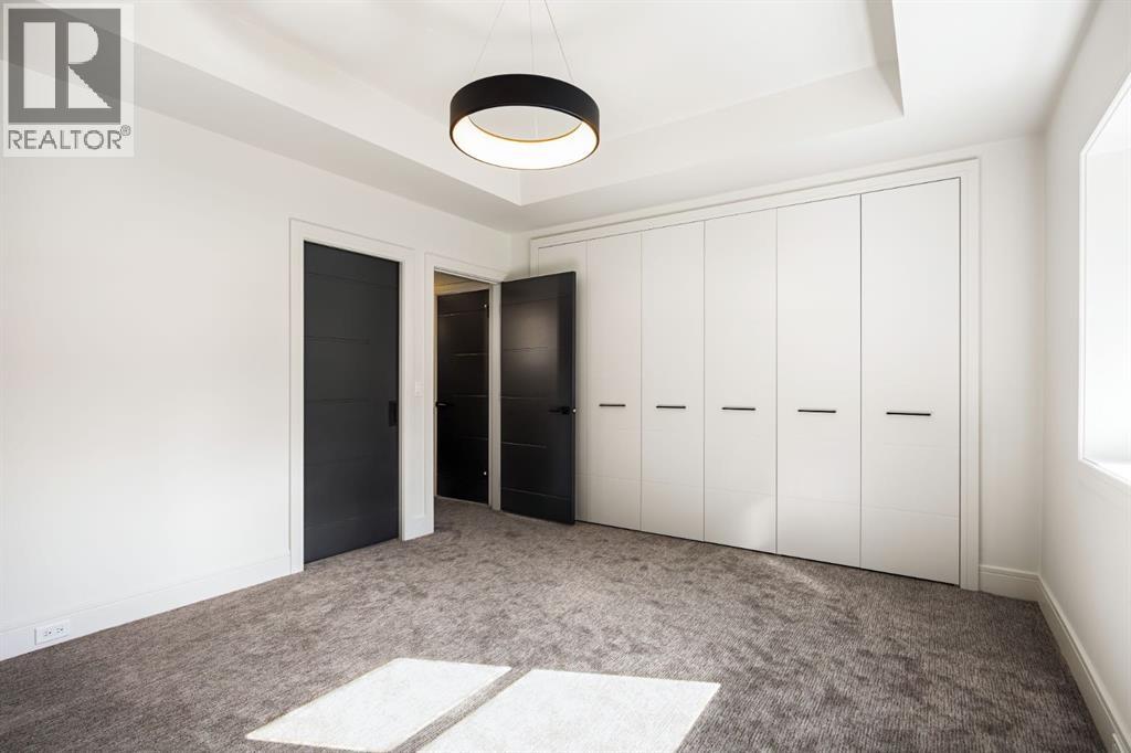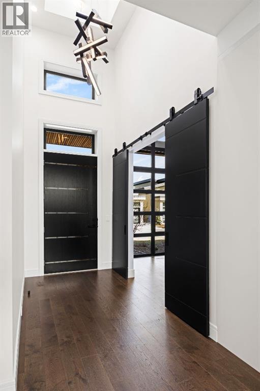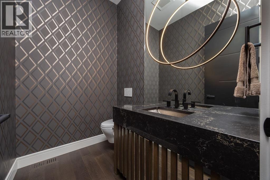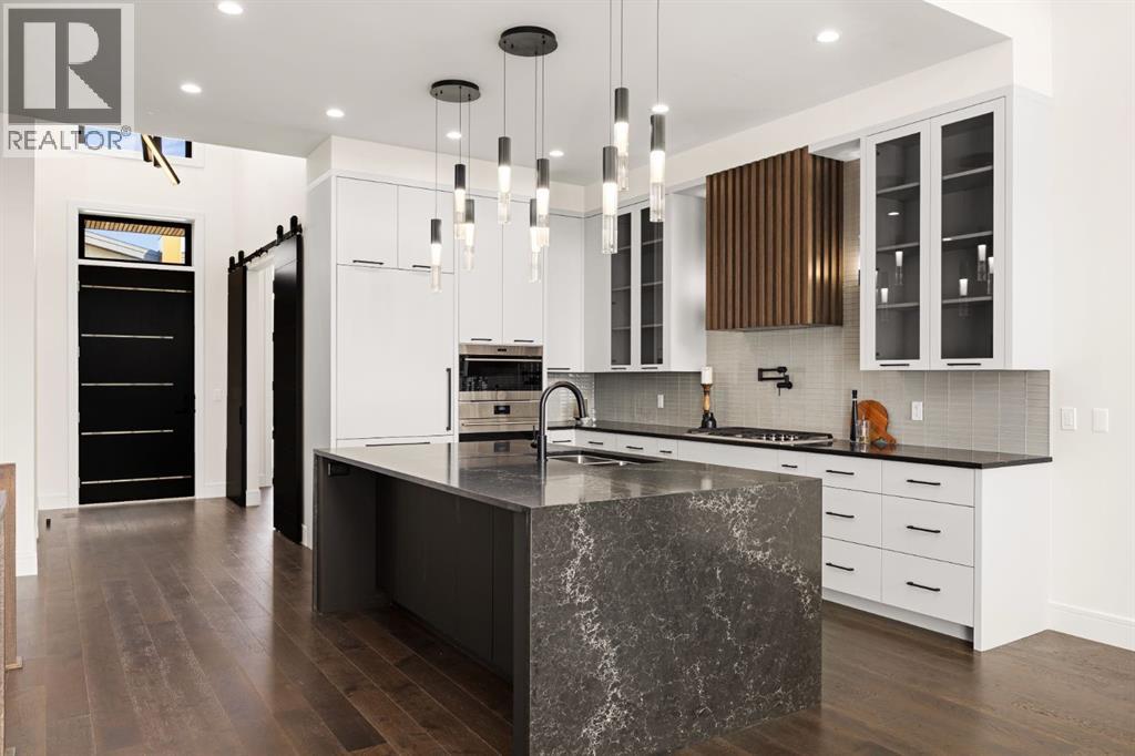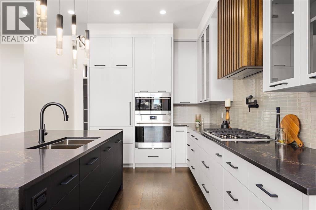 Presenting an opportunity to own a never-lived-in residence in Elveden Court, a prestigious and sold-out community of only 26 bungalow villas on Calgary’s west side. This luxury home represents the pinnacle of "smartsizing," specifically designed for discerning homeowners who refuse to compromise on quality while seeking the ultimate lock-and-leave lifestyle. Whether you are spending your winters south or your weekends in the mountains, this home offers the peace of mind and maintenance-free ease you’ve been looking for without sacrificing bespoke finishes and premium construction. The interior is a masterclass in modern elegance, defined by a high-contrast palette where dark elements meet crisp gallery walls and gleaming floors. The open-concept main level features soaring ceilings, multiple skylights, and expansive windows that flood the space with natural light. A custom fireplace surround reaching the 16’ ceilings anchors the great room creating a chic focal point in the home, while large doors transition seamlessly to a west-facing patio. This outdoor oasis extends the living space and is elevated by a built-in gas fireplace and a remote-controlled louvred pergola, allowing customized sun exposure or protection from the elements while entertaining.The kitchen is a flawless blend of style and utility, featuring premium, integrated Wolf and Sub-Zero appliances, custom cabinetry, plenty of counter space and a commanding island wrapped in deep, inky quartz that provides a sophisticated contrast to the light cabinetry. The main floor continues to impress with a primary suite that serves as a true sanctuary, boasting a walk-in dressing room and a spa-inspired ensuite with in-floor heat, dual vanities, a sizeable shower and a freestanding soaker tub. A private den with sleek barn door access, a mood-filled powder room featuring bold designer wallpaper and a statement pendant light, and a well-appointed laundry room complete the main level, ensuring all your daily es sentials are accessible on one floor.The fully developed lower level, with nine-foot ceilings and a second fireplace, is engineered for lifestyle flexibility and hosting. A generous recreation area features a designer wet bar with custom glossy millwork and dual refrigeration, while two additional bedrooms provide ideal accommodations for guests or teens. A flex room offers the perfect footprint for a home gym or hobby space. The spacious lower patio leads directly to the fenced, private west facing yard. The oversized double garage boasts a heated slab, transom windows and ceiling height to accommodate a car lift. Built to an exceptional standard with full Insulated Concrete Form (ICF) construction to the soffit line and triple-glazed windows, this home offers superior sound attenuation and thermal efficiency. Located just minutes from Aspen Landing and the Rocky Mountains, this villa offers an unparalleled blend of privacy and convenience for the next chapter of your life. (id:63190)