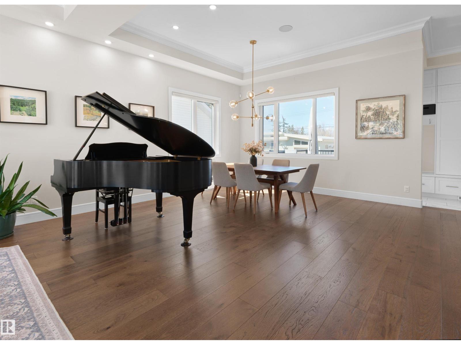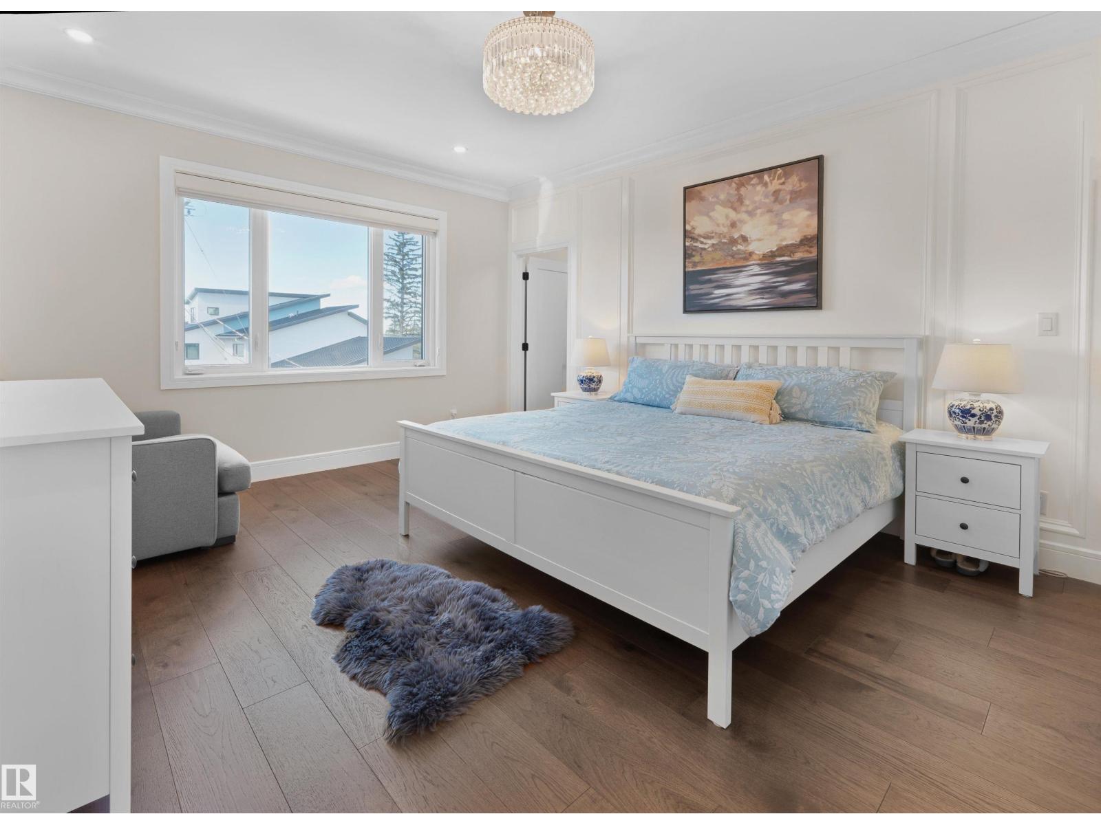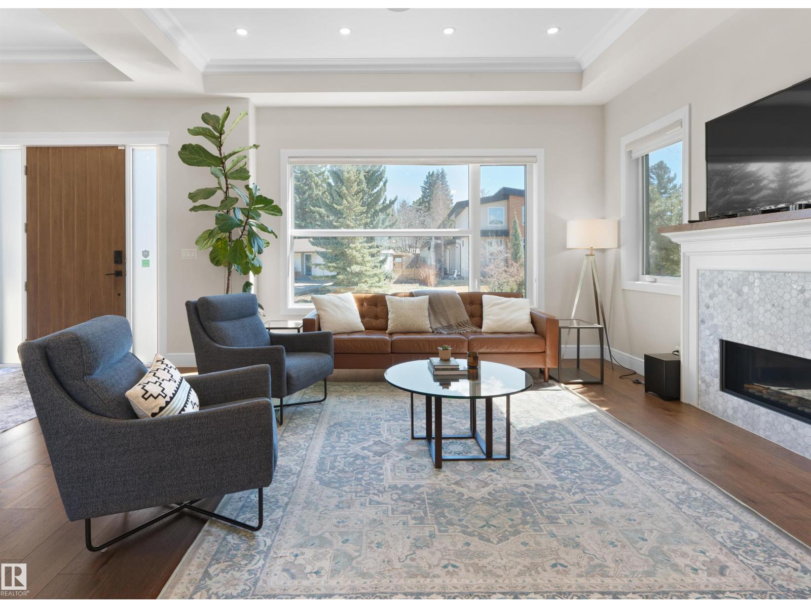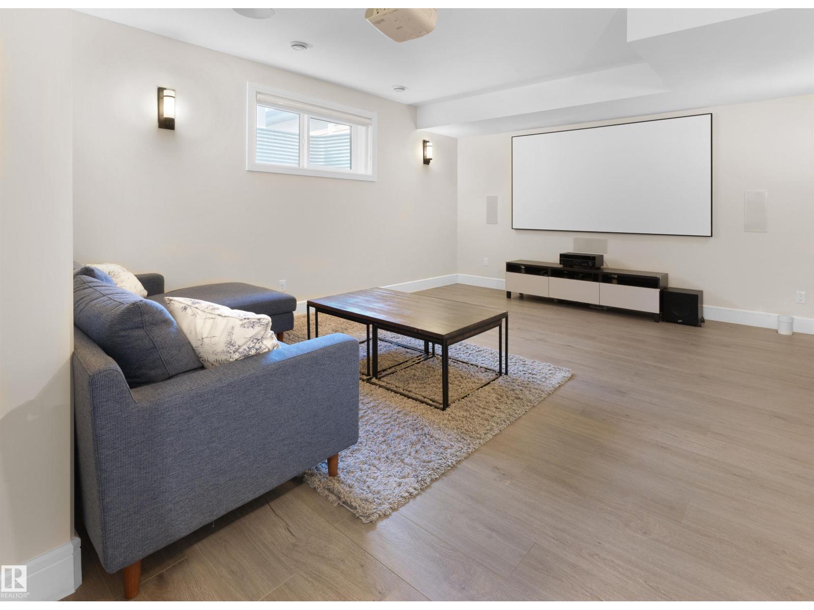 Belgravia. Steps from Saskatchewan Drive and the river valley trails. This 4+1 bed, 4.5 bath infill on a 50' lot is built for the neighbourhood it sits in. Inside, 11' painted ceilings, designer lighting, and wide plank hardwood throughout the main and upper floors. The main floor has it all: living and dining rooms, a chef's kitchen with a large island and professional appliances, a butler's kitchen, and a dedicated office. Upstairs, 4 beds including a primary w/ full ensuite and views toward Saskatchewan Drive, plus a jack & jill and a private ensuite for the other three. Basement delivers a wet bar, rec room, theatre room w/ projector and home theatre system included, 5th bed, and full bath. Landscaping redone in 2022; low-maintenance out front, with grass & a veggie garden out back. Features: 3-zone heating, HRV, HEPA filtration w/ dedicated cabinet (2025), reverse osmosis, A/C (2021), insulated and drywalled garage. Walk to the U of A and the hospital. Belgravia doesn't often give up homes like this. (id:63190)