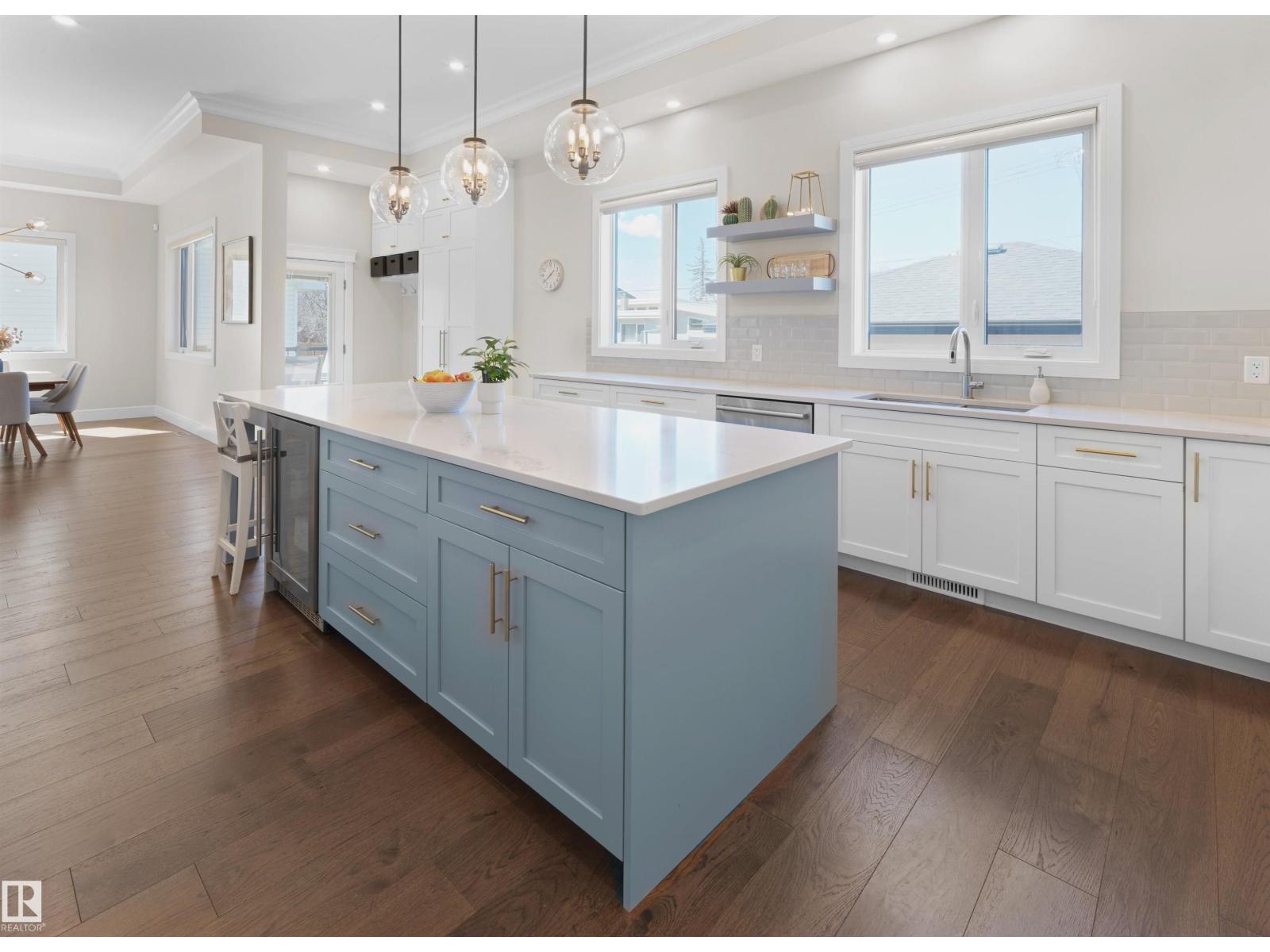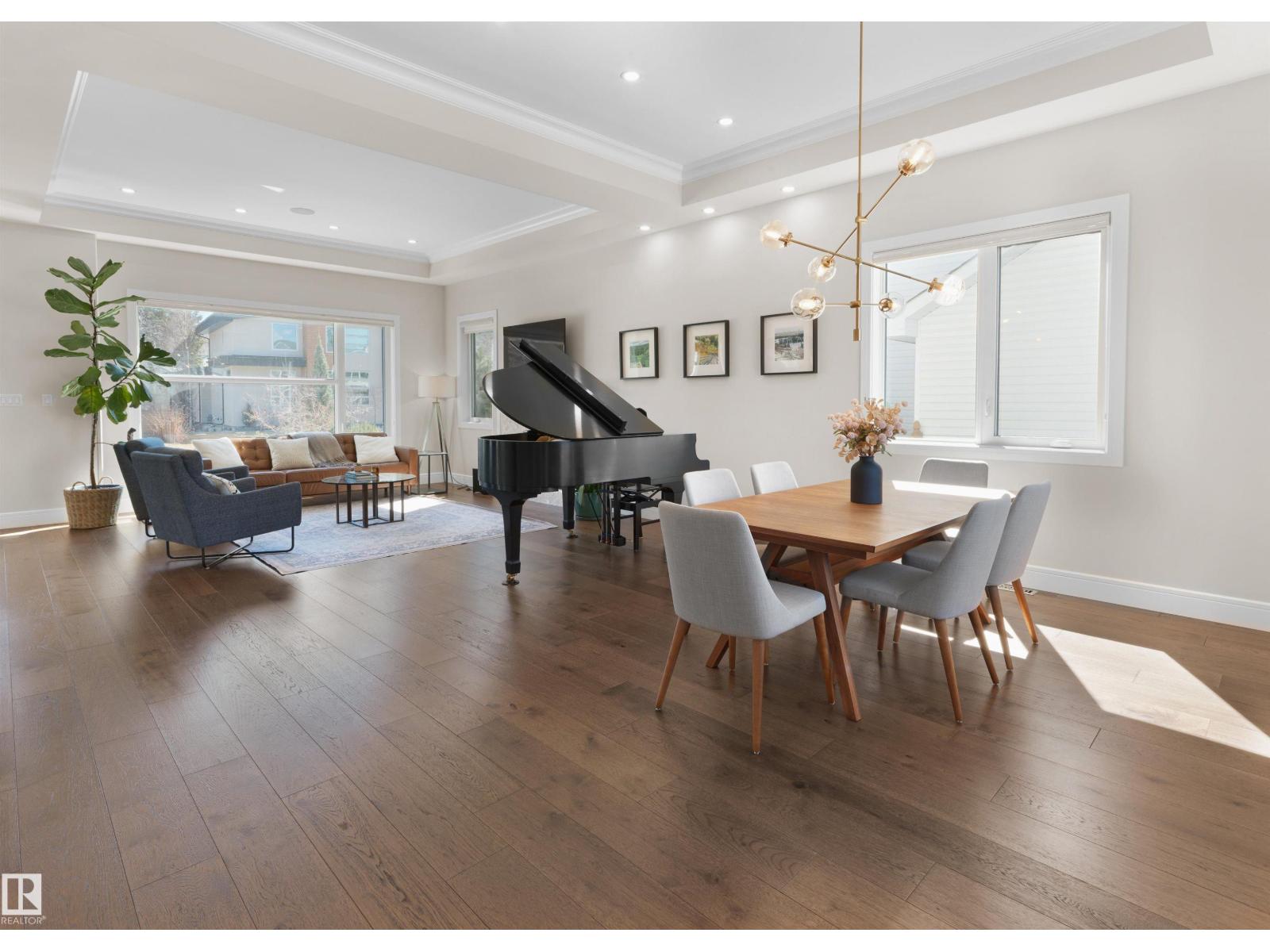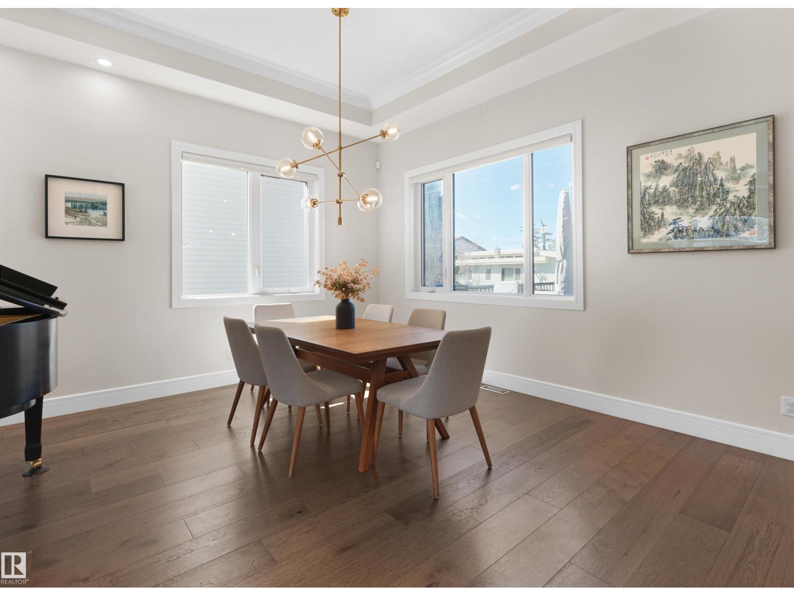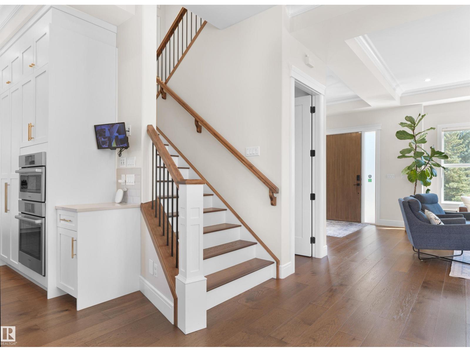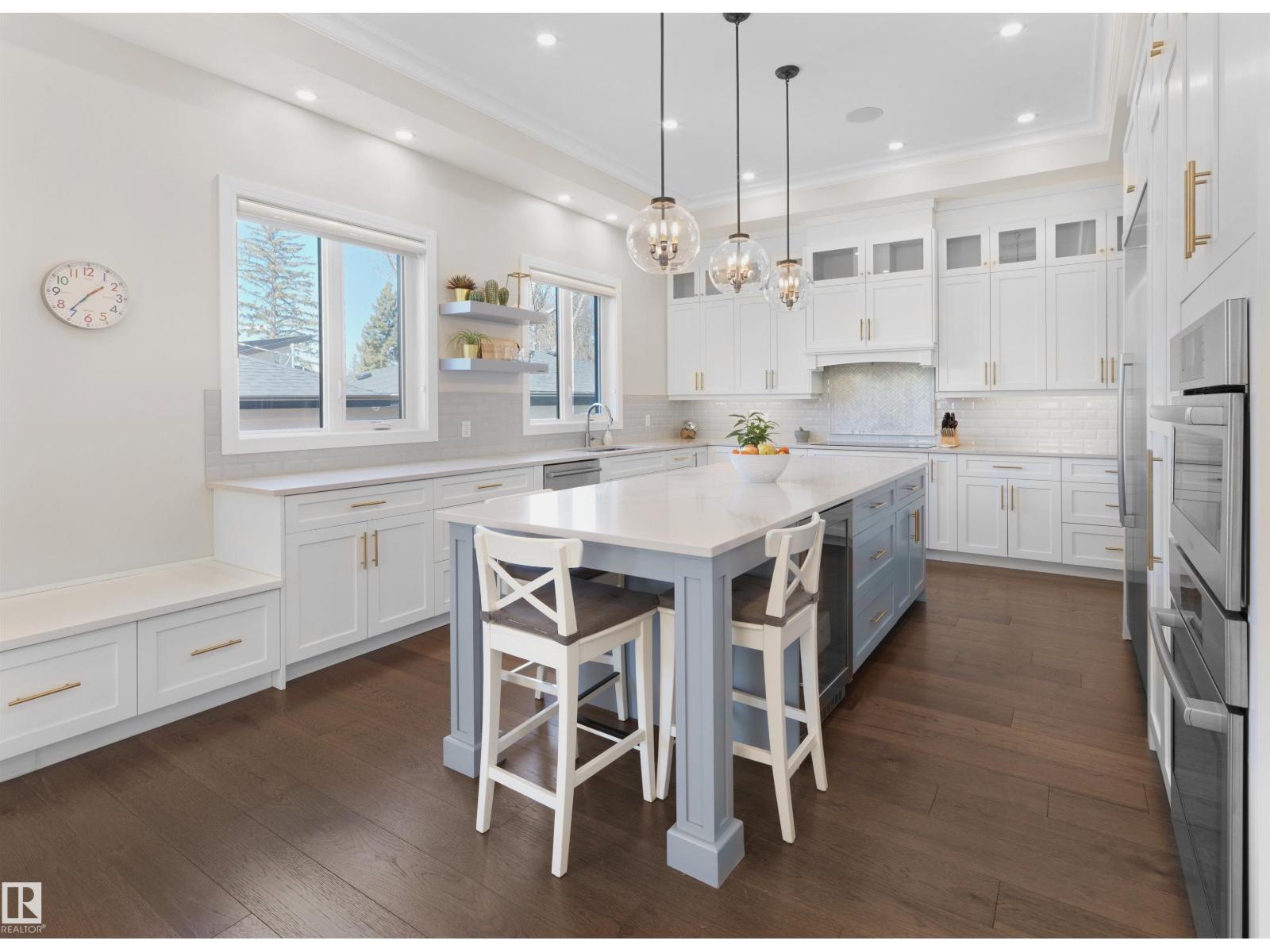 Belgravia. Steps from Saskatchewan Drive and the river valley trails. This 4+1 bed, 4.5 bath infill on a 50' lot is built for the neighbourhood it sits in. Inside, 11' painted ceilings, designer lighting, and wide plank hardwood throughout the main and upper floors. The main floor has it all: living and dining rooms, a chef's kitchen with a large island and professional appliances, a butler's kitchen, and a dedicated office. Upstairs, 4 beds including a primary w/ full ensuite and views toward Saskatchewan Drive, plus a jack & jill and a private ensuite for the other three. Basement delivers a wet bar, rec room, theatre room w/ projector and home theatre system included, 5th bed, and full bath. Landscaping redone in 2022; low-maintenance out front, with grass & a veggie garden out back. Features: 3-zone heating, HRV, HEPA filtration w/ dedicated cabinet (2025), reverse osmosis, A/C (2021), insulated and drywalled garage. Walk to the U of A and the hospital. Belgravia doesn't often give up homes like this. (id:63190)