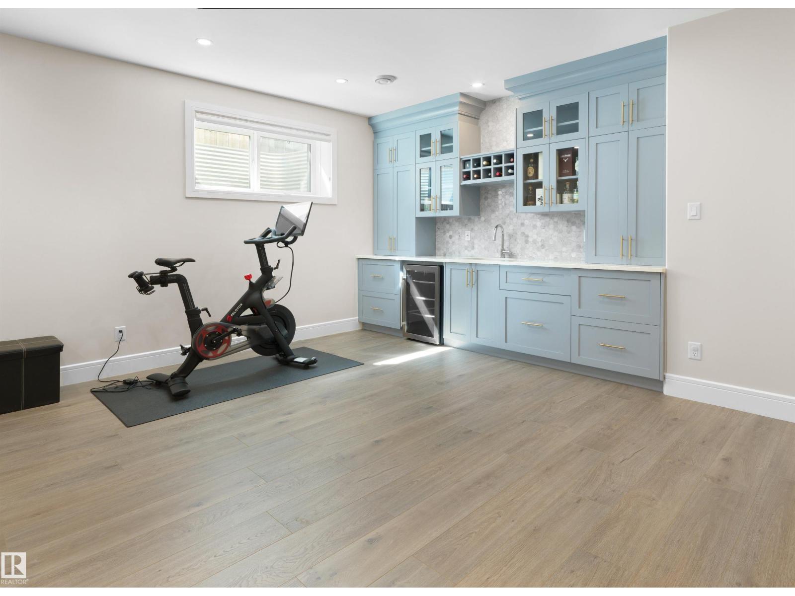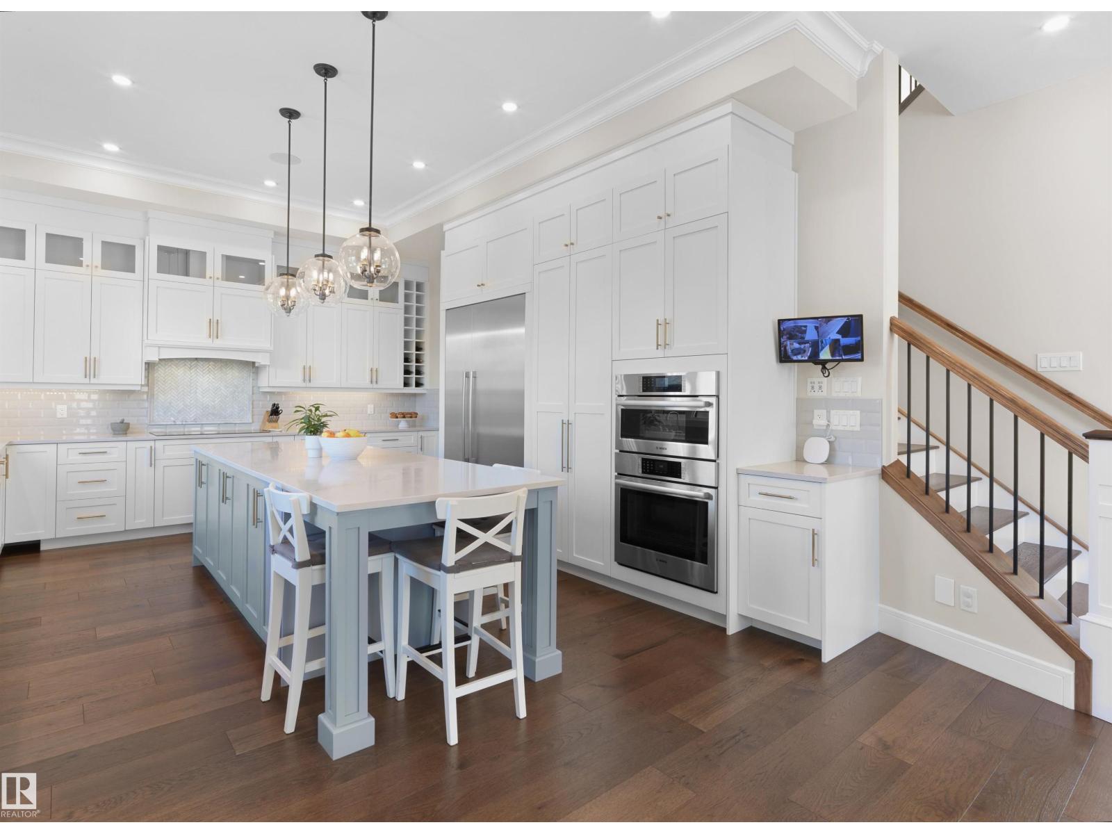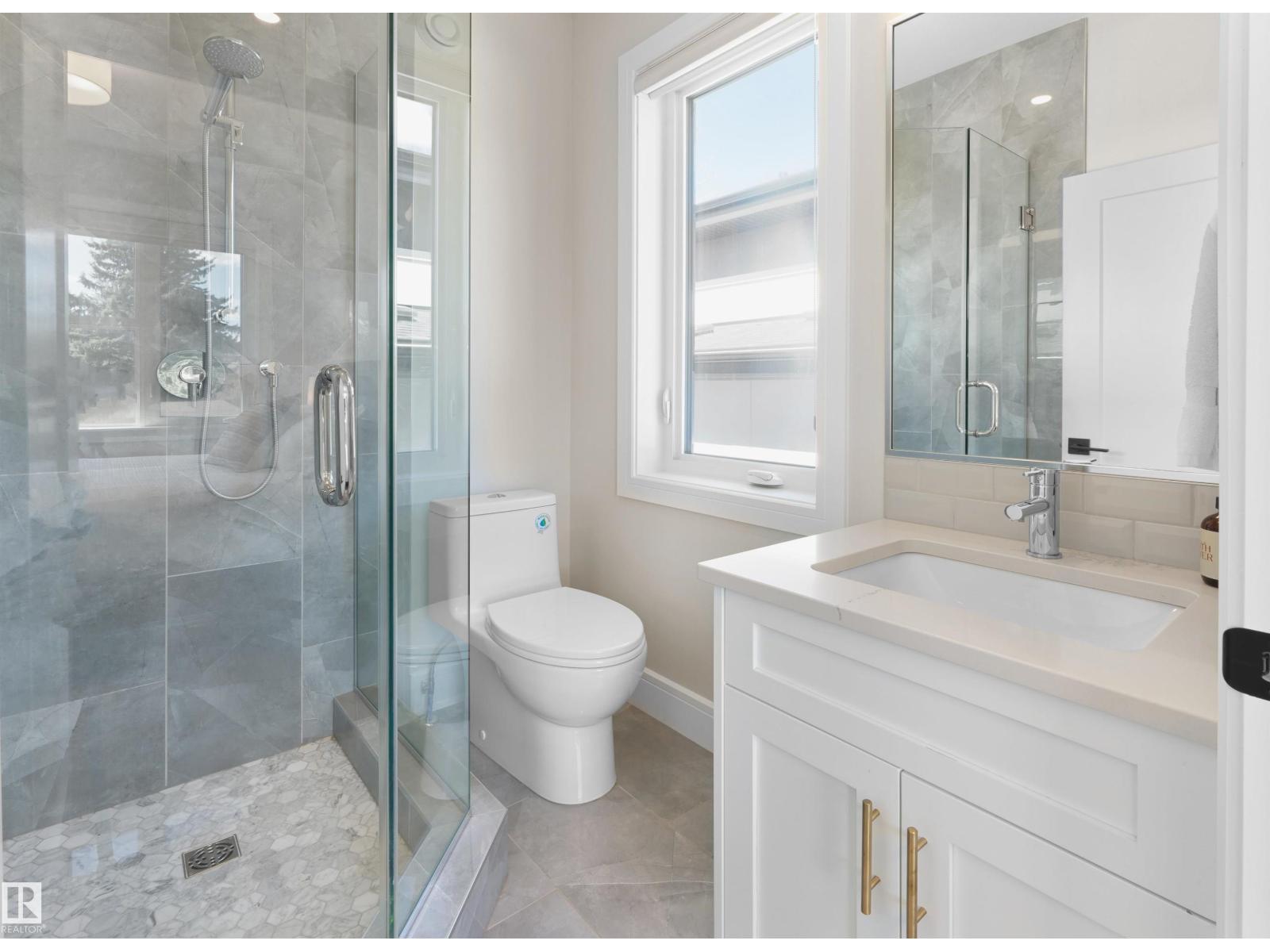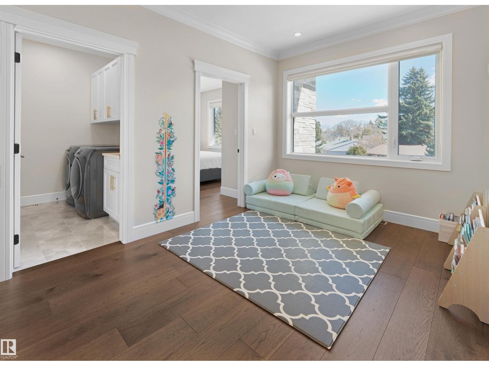 Belgravia. Steps from Saskatchewan Drive and the river valley trails. This 4+1 bed, 4.5 bath infill on a 50' lot is built for the neighbourhood it sits in. Inside, 11' painted ceilings, designer lighting, and wide plank hardwood throughout the main and upper floors. The main floor has it all: living and dining rooms, a chef's kitchen with a large island and professional appliances, a butler's kitchen, and a dedicated office. Upstairs, 4 beds including a primary w/ full ensuite and views toward Saskatchewan Drive, plus a jack & jill and a private ensuite for the other three. Basement delivers a wet bar, rec room, theatre room w/ projector and home theatre system included, 5th bed, and full bath. Landscaping redone in 2022; low-maintenance out front, with grass & a veggie garden out back. Features: 3-zone heating, HRV, HEPA filtration w/ dedicated cabinet (2025), reverse osmosis, A/C (2021), insulated and drywalled garage. Walk to the U of A and the hospital. Belgravia doesn't often give up homes like this. (id:63190)