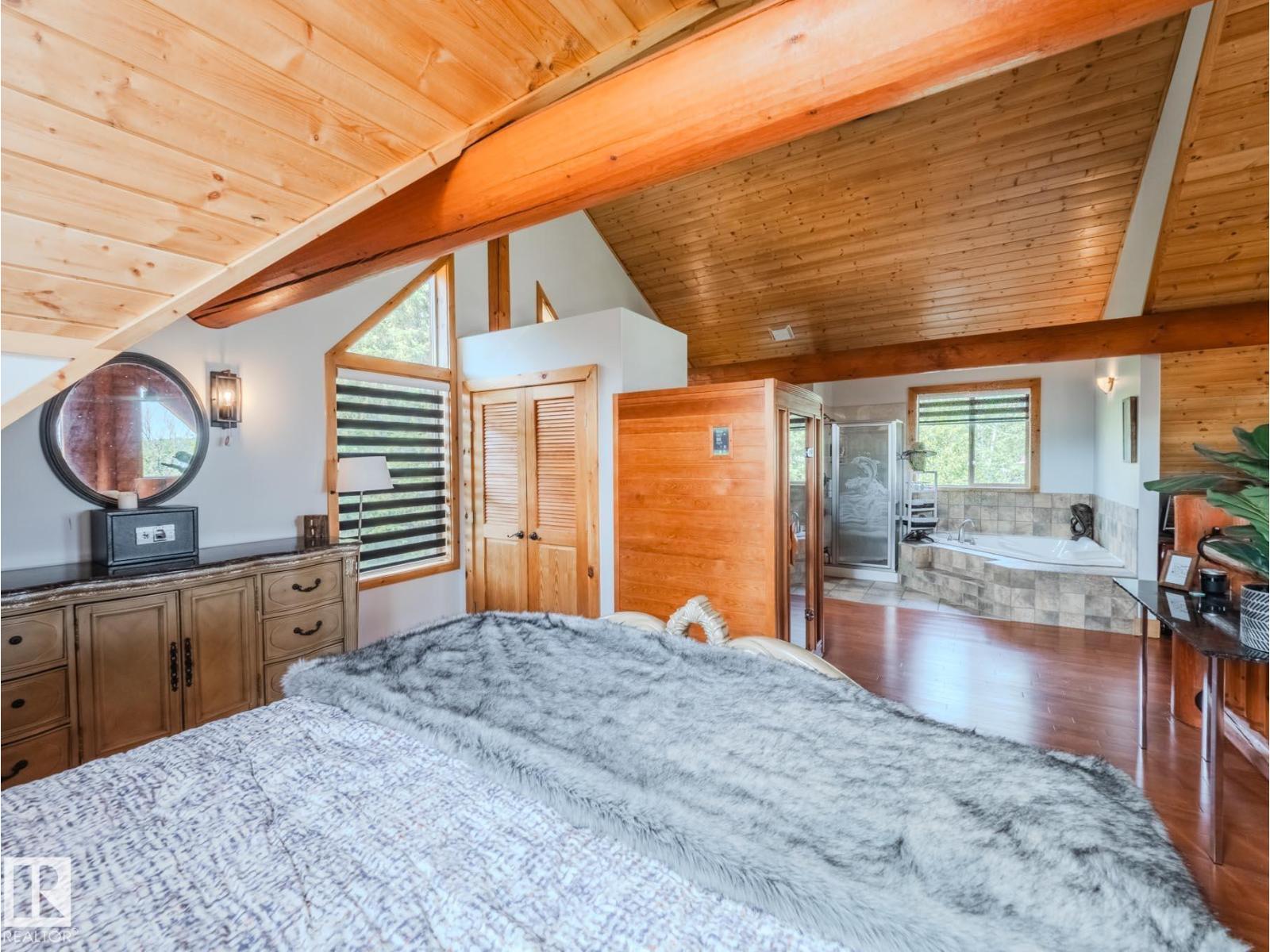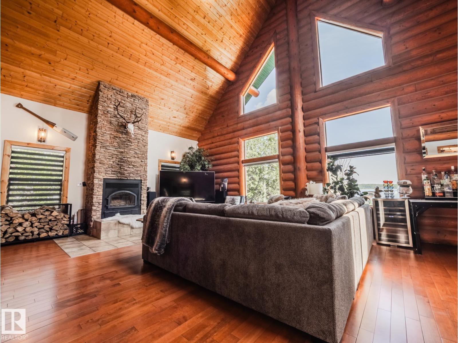 Stunning LAKEFRONT custom built log home at Island Lake. Whisper Creek Homes, known for their quality craftsmanship and attention to detail, constructed this gorgeous home with vaulted pine tongue & groove. The incredible great room, with vaulted ceilings, features maple hardwood flooring, a stone encased floor to ceiling wood burning fireplace & breathtaking views of the picturesque lake. The dreamy kitchen boasts solid hickory cabinets, quartz counter tops & backsplash plus matte black appliances. Completing the main level is the second bedroom, four piece bathroom and laundry closet with full size washer & dryer. Upstairs is the extraordinary primary suite with a 5 piece ensuite including jet tub, dual sinks and separate shower. The outdoor living space is unbelievable- scenic sun filled south views, covered veranda, massive vinyl deck with glass railing, seperate gazebo area, 26'x32' triple detached heated garage, greenhouse & storage sheds. Nestled on the private western shore of serene Island Lake. (id:63190)