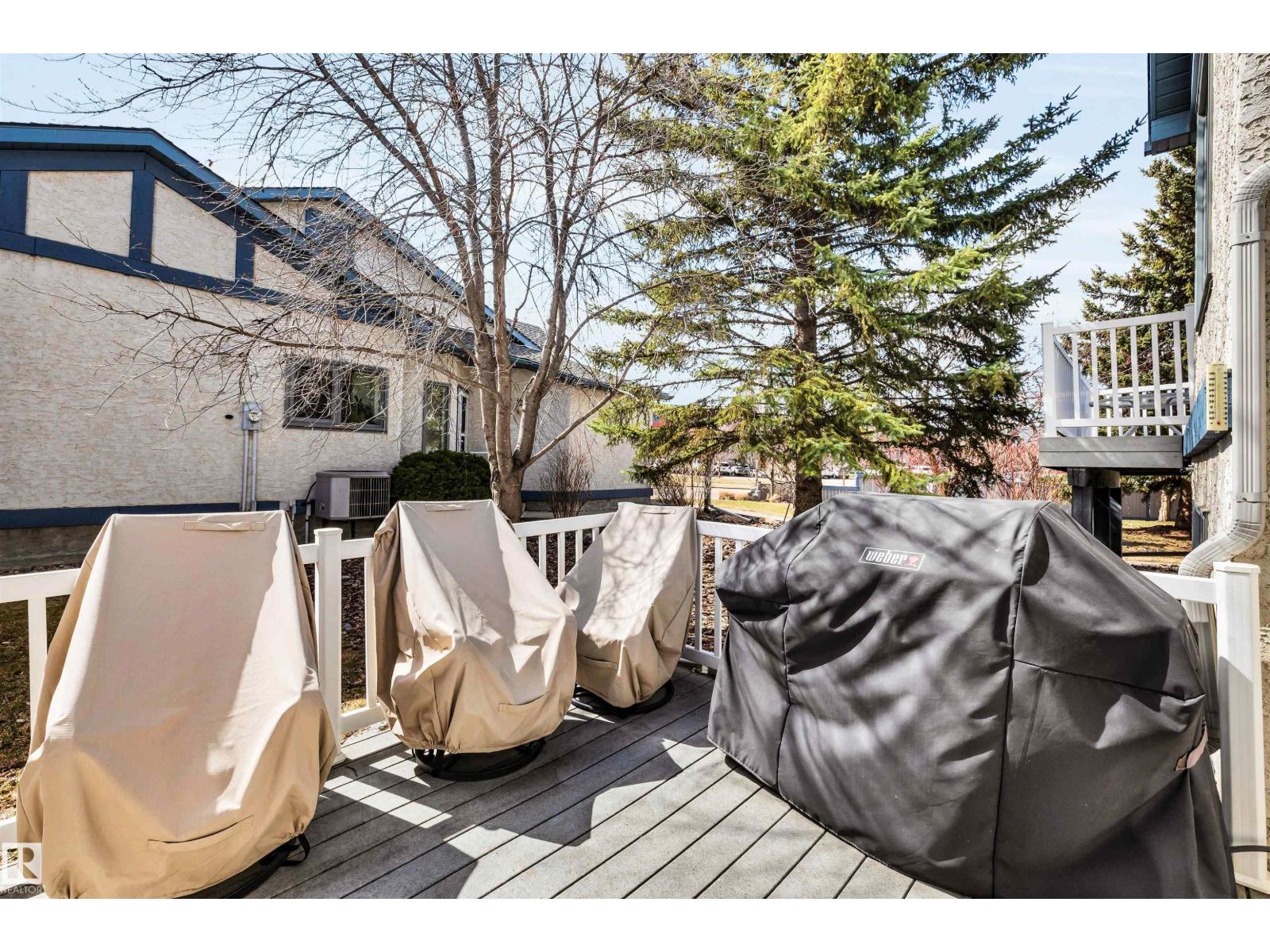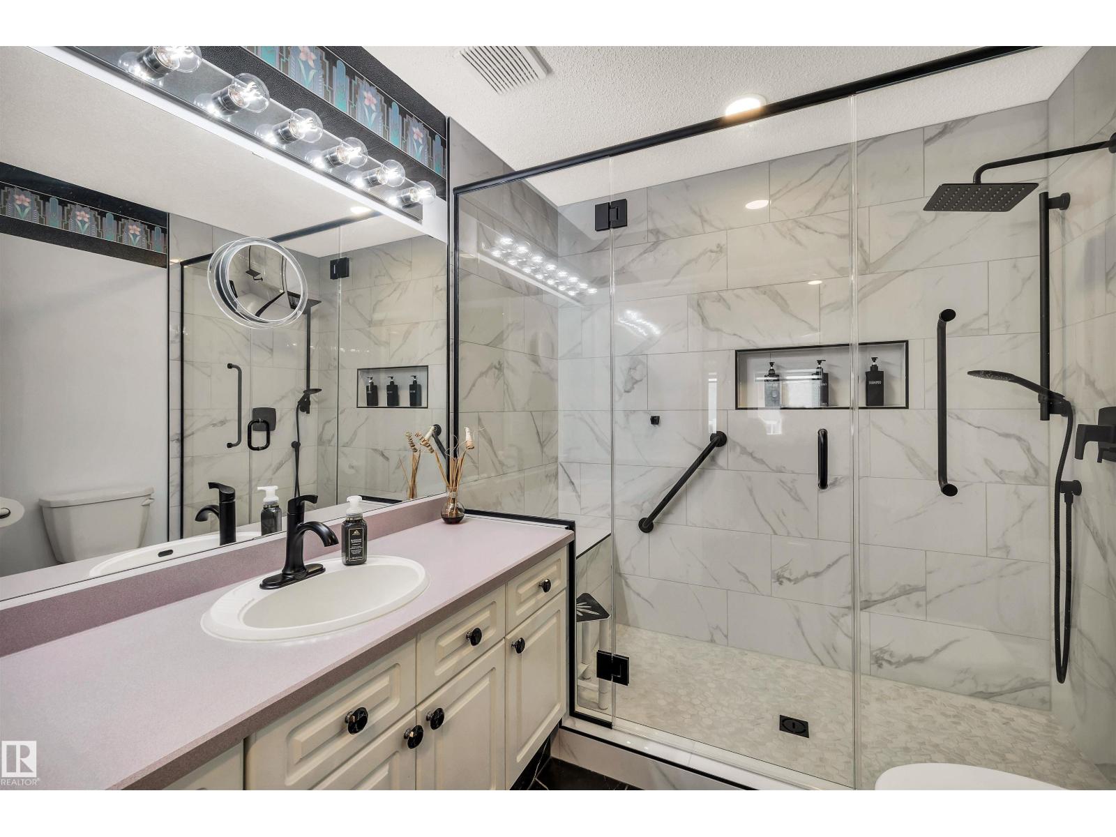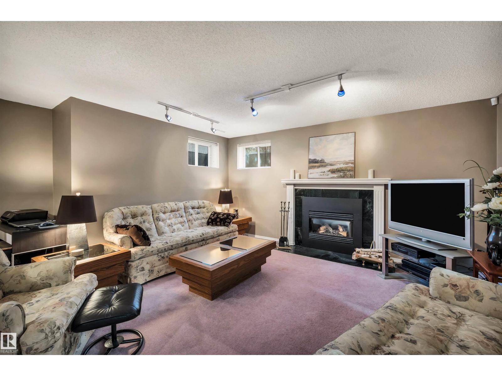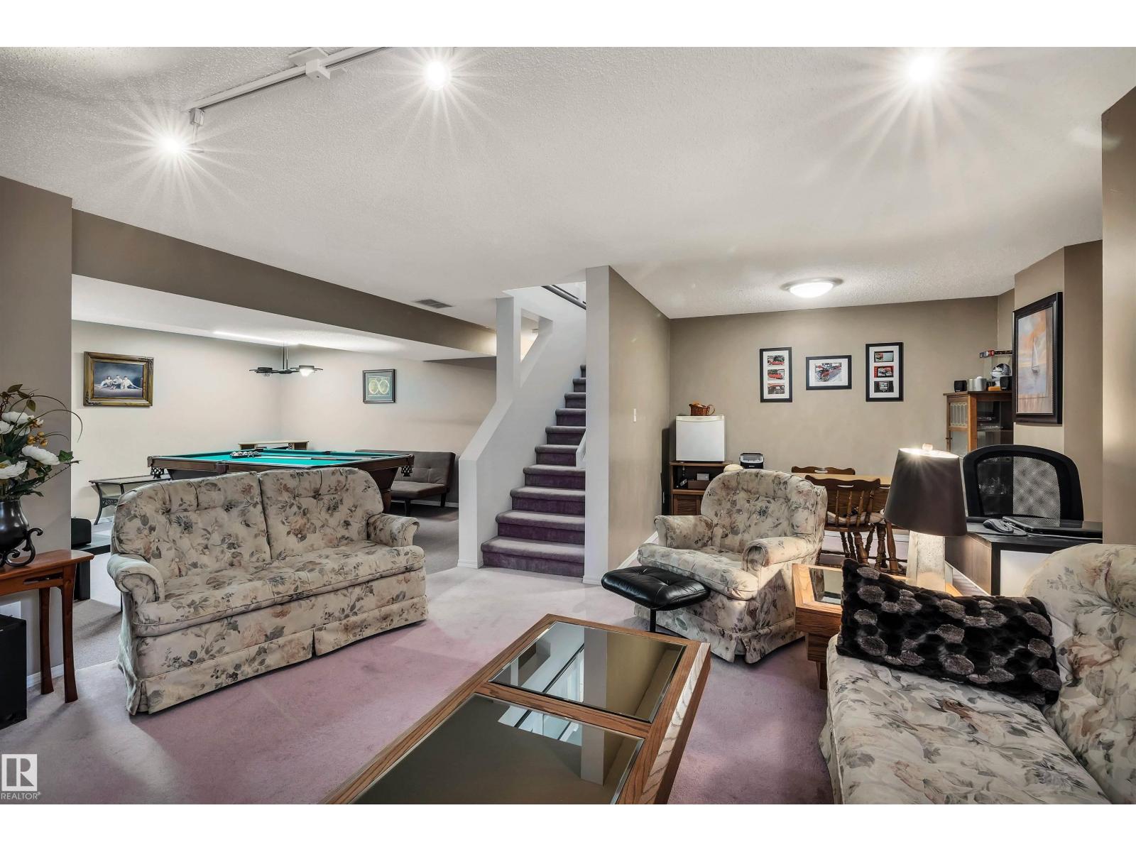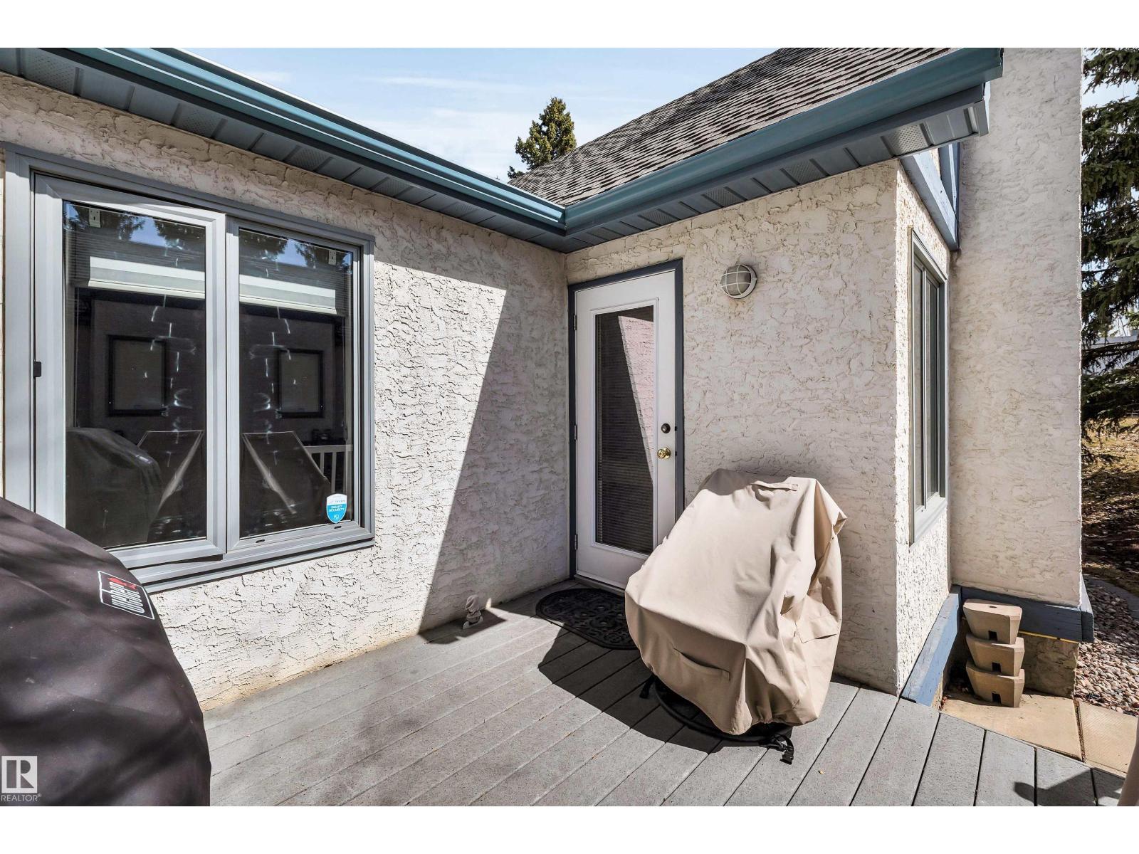 Welcome to this beautifully maintained bungalow in the exclusive Twin Brooks Classics, a sought-after 16+ adult living community. Thoughtfully updated, this home offers an open-concept main floor ideal for comfortable living & entertaining. The timeless white kitchen features dual pantries & flows seamlessly into the main living space. Enjoy the ease of main floor laundry & newer vinyl windows w/custom blinds. The spacious primary includes mirrored closets & renovated spa-inspired ensuite w/heated floors & tiled walk-in shower w/bench. The fully finished basement adds a third bedroom, full bath, large rec room w/pool table, gas fireplace & ample storage. Relax outdoors on the composite deck w/gas BBQ hookup. Complete w/retractable screens on both front/back doors, A/C & double attached garage. Newer furnace & HWT. Located on the MacTaggart Sanctuary & Whitemud Creek Ravine w/extensive walking trails, outdoor skating rink, community league building/garden & more! Close to shopping & all amenities. A gem! (id:63190)