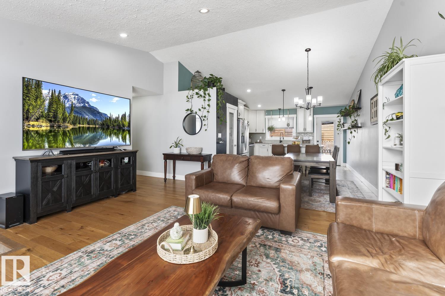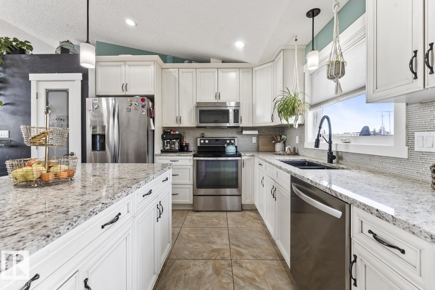 FULLY DEVELOPED raised bungalow with WALKOUT BASEMENT to backyard. Superb family friendly subdivision - THE MEADOWS with park, walking trails & shopping nearby! FENCED BACKYARD, INTERLOCKING PATIO at walkout, 2 DECKS + firepit area! WELCOMING modern looking HOME with large PAVED DRIVEWAY and HEATED DOUBLE GARAGE. Main entrance includes ACCESS TO GARAGE FROM HOUSE. OPEN CONCEPT with soaring VAULTED CEILINGS! TILE & HARDWOOD flooring throughout main level! Sun filled living room opens to dining area with kitchen just beyond. FRESH WHITE KITCHEN includes: GRANITE counters, STAINLESS APPLIANCES, ISLAND with eating ledge + a WALK-IN PANTRY. Plus access to top deck off kitchen. Down the hall is the main full bathroom, 3 bedrooms and MAIN FLOOR LAUNDRY. Primary bedroom with built-in closets, ENSUITE WITH DOUBLE SINKS & A LARGE SHOWER. Lower level includes MASSIVE FAMILY ROOM, 4th & 5th BEDROOMS, 4pc bathroom, storage room, utility room (2nd laundry hookup if one wishes)+roughed in underslab. MAKE IT YOURS! (id:63190)