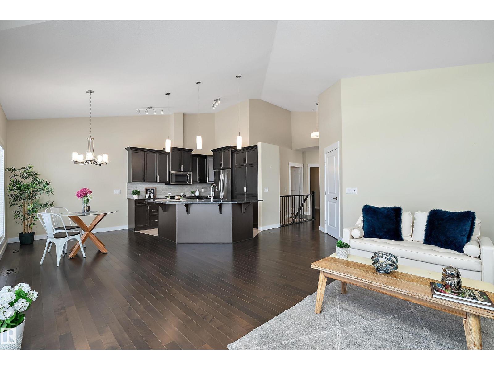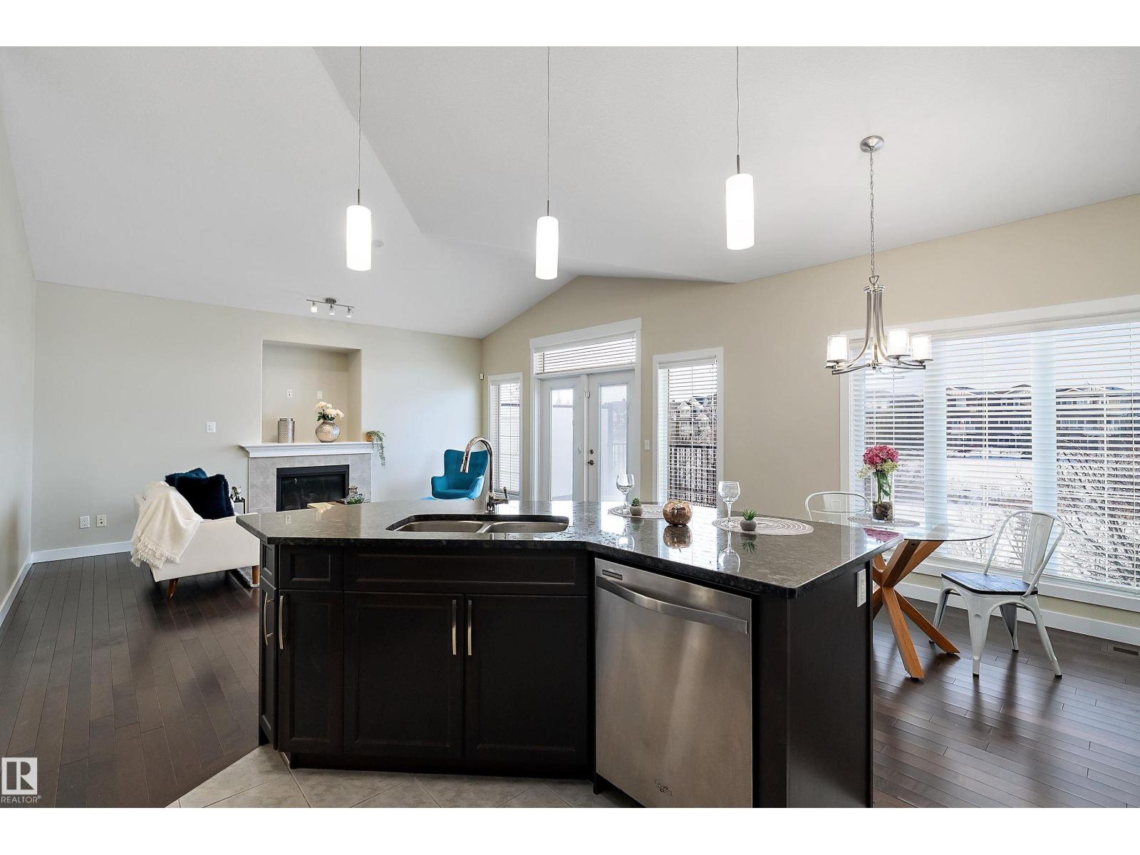 The pristine bungalow located in Rivers Edge Villas, a community for those aged 55 and above, features a beautifully finished WALKOUT basement that overlooks a serene pond. The open-concept main floor showcases vaulted ceilings and hardwood flooring, comprising a bright living room complete with a gas fireplace, a den or optional second bedroom, a laundry room, a full bathroom, and access to a spacious southwest-facing deck. The elegant kitchen is equipped with granite countertops, shaker-style cabinets, and an island with an eating bar. The generous primary suite offers 9-foot ceilings, a luxurious 5-piece ensuite bathroom, and a walk-in closet. The expansive basement includes a family room, a recreation area, a third bedroom, a full bathroom, and a storage room. (id:63190)