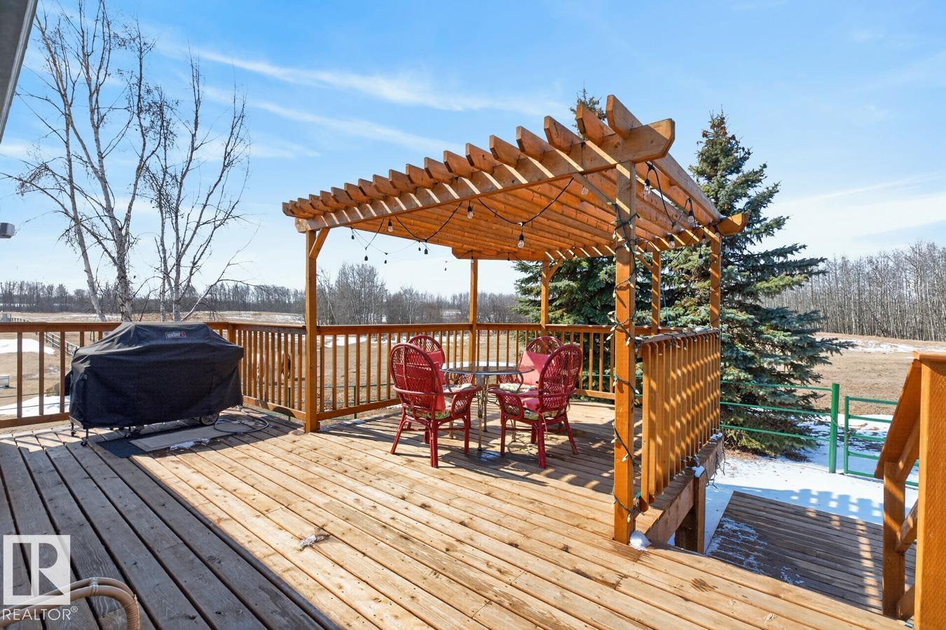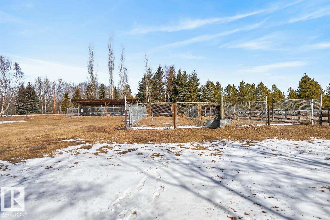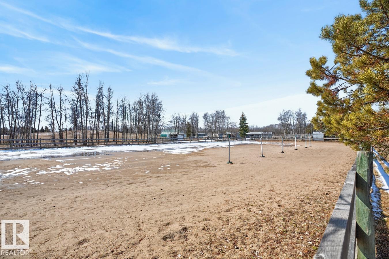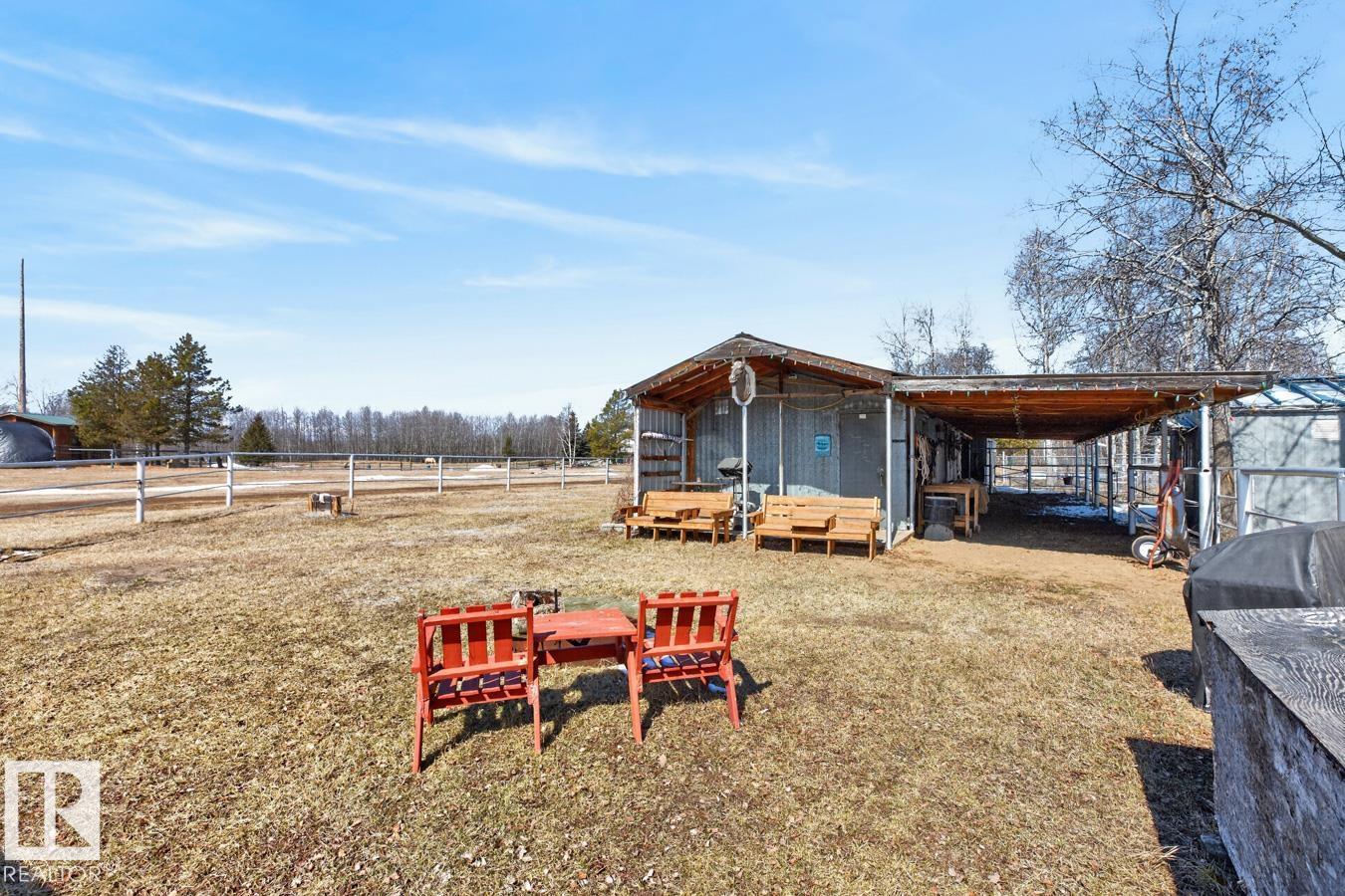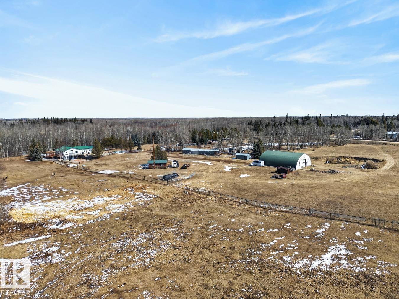 The ultimate opportunity for outdoor enthusiasts, equestrians, or entrepreneurs! The subdividable/multi-residential 74 acre parcel provides a picturesque plentitude of trees and meadows. Currently set up for horses with a 100' x 200' sand base arena, extensive pipe fencing, multiple paddocks, covered 60' breezeway, 9 horse shelters, barn, tack shed, rustic party room, and auto-waterer from the bored well. The thoughtfully placed walkout bungalow with low maintenance landscaping has extensive updates completed in 2024: furnace & A/C, triple pane windows, vinyl plank flooring, and 3000 gallon cistern. The west facing deck with natural gas hookup, pergola, and hot tub, is ready for relaxing or entertaining while your equine friends and wildlife meander under sky or stars. Enjoy morning coffee on the sunny south deck off the bright and efficient kitchen. The property comes complete with a 50 x 60 heated shop with tall overhead doors, sheds, cozy cabin and a creek. 10min. to Edm.,Sp.Grove, & 25min. to airport! (id:63190)