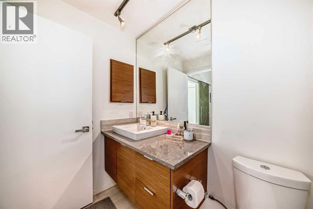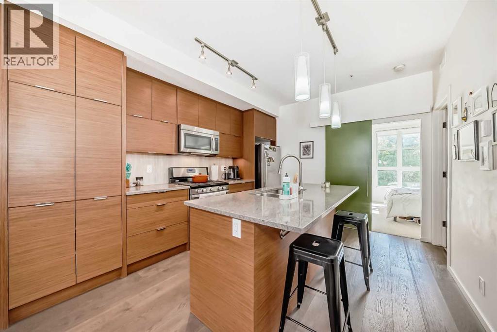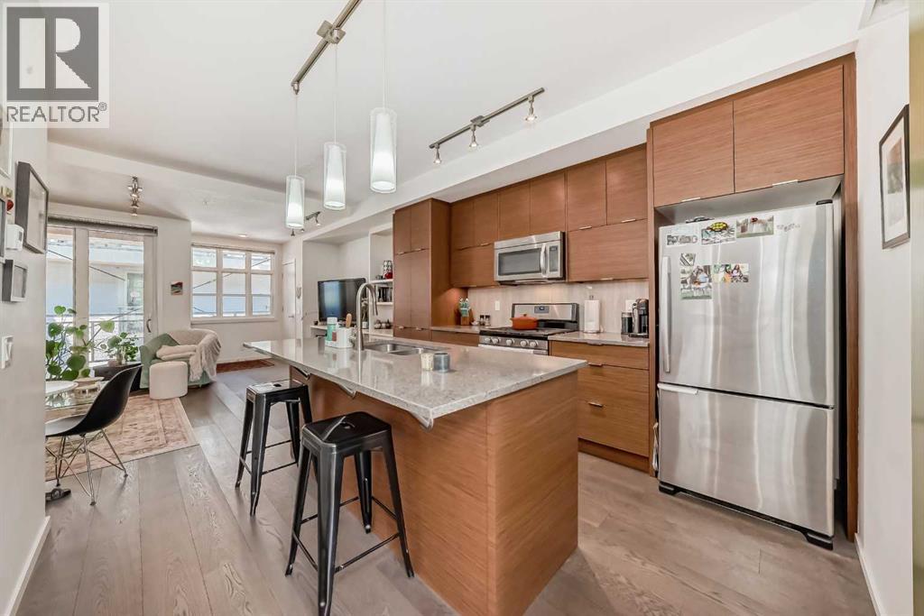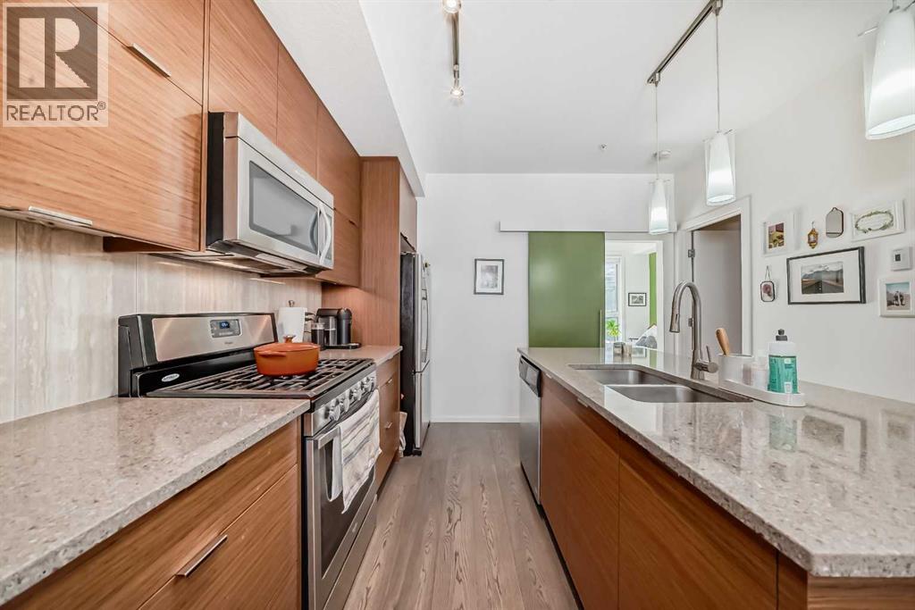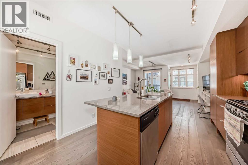 Welcome to 'The Block'. This one-bedroom condo showcases modern style in the heart of Lower Mount Royal, just steps away from the vibrant and trendy 17th Ave. Designed for the urban professional, this condo features high ceilings, a bright and open layout, newly installed engineered hardwood floors, and a kitchen that boasts sleek cabinets, quartz countertops, a gas stove, tile backsplash, under-mount lighting, and ample pantry storage. The spacious bedroom includes a surprisingly large walk-in closet. The bathroom exudes luxury with high-end finishes, floor-to-ceiling tile, and a glass shower. Additional amenities include in-suite laundry, TITLED underground parking, an assigned storage locker, and attractive condo fees. The complex is thoughtfully designed with a beautifully landscaped inner courtyard, elevator, and secure door access for added safety. This unbeatable location is just steps away from Urban Fare, Vine Arts, Canadian Tire, Made by Marcus, bike paths, parks, the river, and all the other fantastic 17th Ave amenities. This is a unique opportunity to enjoy the best the city has to offer. (id:63190)