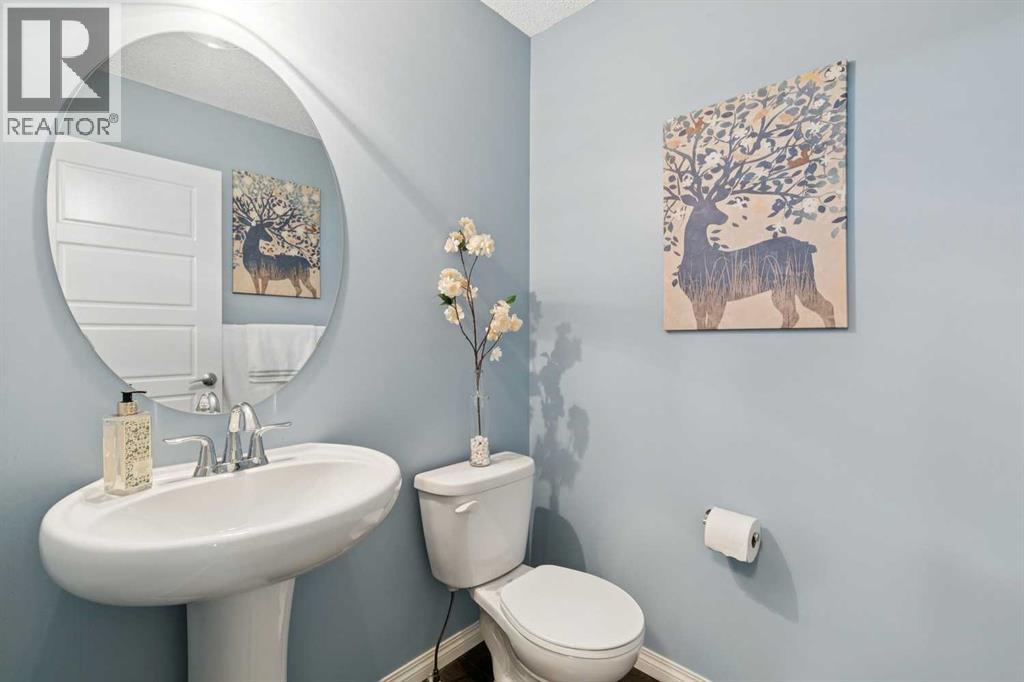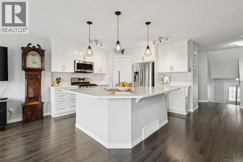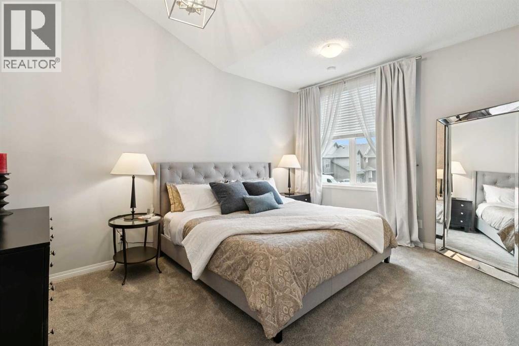 Huge pie lot on a cul-de-sac, backing onto a greenspace, in a lake community, mountain and city views, and air conditioning.....When I say it is all here I am not kidding!!! This home was built by Brookfield and features vinyl plank flooring, upgraded carpet, quartz countertop throughout including the upper level laundry room, and matching tile in the front entry, laundry room and all the bathrooms. The main level offers a living room that is very bright and ideal for the young family. There is a good size dining area for hosting the holidays. The kitchen offers a large pantry, huge island with breakfast bar, stainless steel appliances, gas stove, quartz countertops, feature backsplash and sliding doors to the 20x20 cedar deck for the bbq season. There is a nice size bonus room up by the 2 spare bedrooms that could be used as a children's play area, tv room or workout area. Basement has a family room and a full bathroom. There is an egress window allowing this area to also be used as a teenager bedroom with ensuite. Primary bedroom offers vaulted ceilings, walk-in closet with custom organizer and a 4pc bathroom with linen closet. Two spare bedrooms are a great size with views of downtown and the greenspace. One of them has a large walk in closet. Fully fenced pie shaped backyard has had $20,000 worth of landscaping done and the 20x20 cedar deck has aluminum railing for no maintenance. Backing onto a huge off leash dog park with ponds to add to your enjoyment. Full lake access and a short drive or walk to the shopping areas. (id:63190)