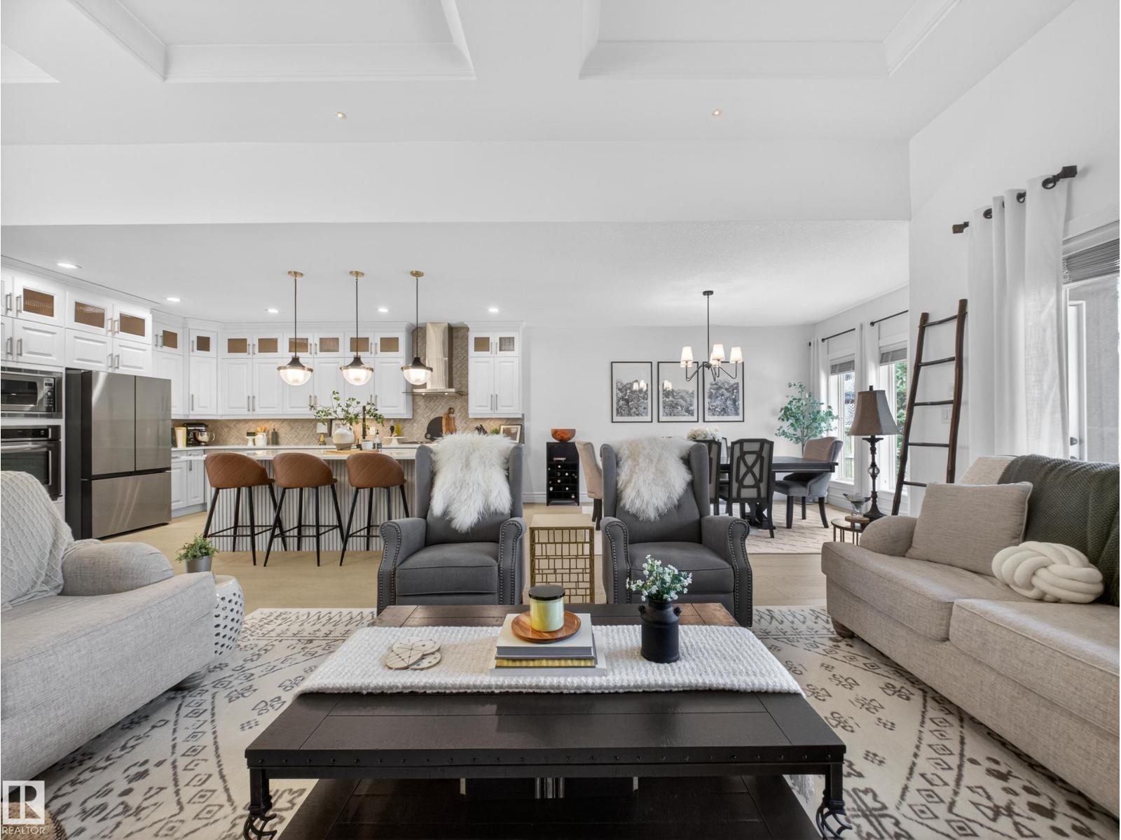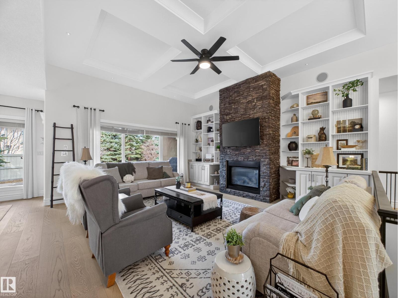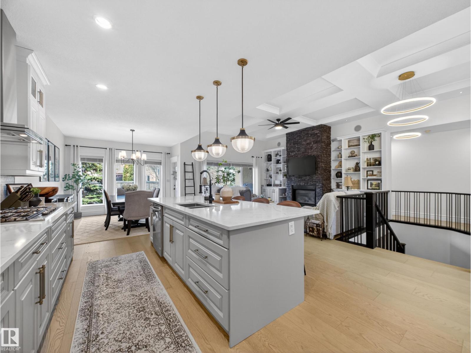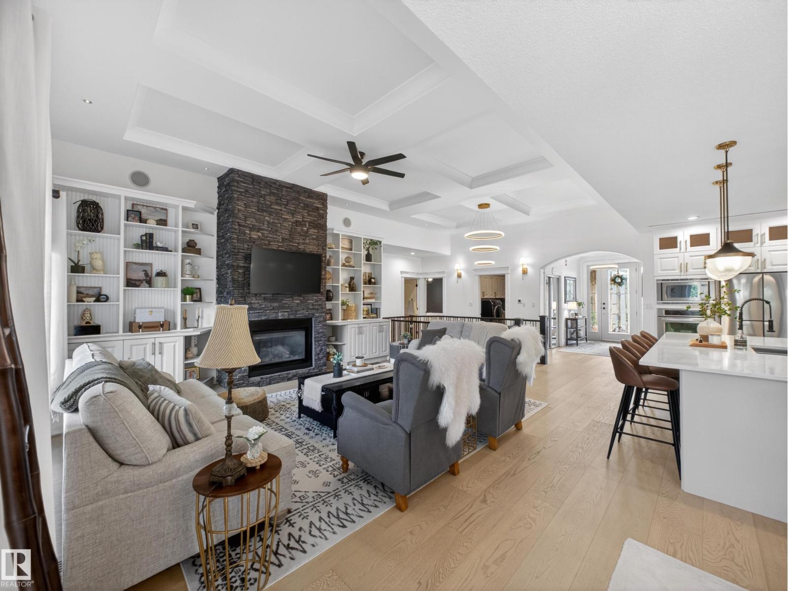 Fully reimagined executive bungalow in the prestigious gated community of Ravines of Richford, offering nearly 3,800 sq ft of refined living. Soaring 11’ coffered ceilings, a striking stacked-stone fireplace, custom millwork, and wide-plank white oak floors set the tone for a bright, upscale interior. The designer kitchen features granite counters, a large island, and seamless flow to the dining area overlooking a private, fully landscaped pie lot. The main-floor primary retreat offers a spa-inspired 5-piece ensuite and walk-in closet, with a private den, second bedroom, full bath, and oversized laundry completing the level. Downstairs delivers exceptional entertaining with a games area, wet bar, theatre room, 2 bedrooms, and full bath. Recent upgrades include a 2025 high-eff furnace, A/C, and more. Finished with a 24’ deep double attached garage with high ceilings—perfect for lifts or storage. (id:63190)