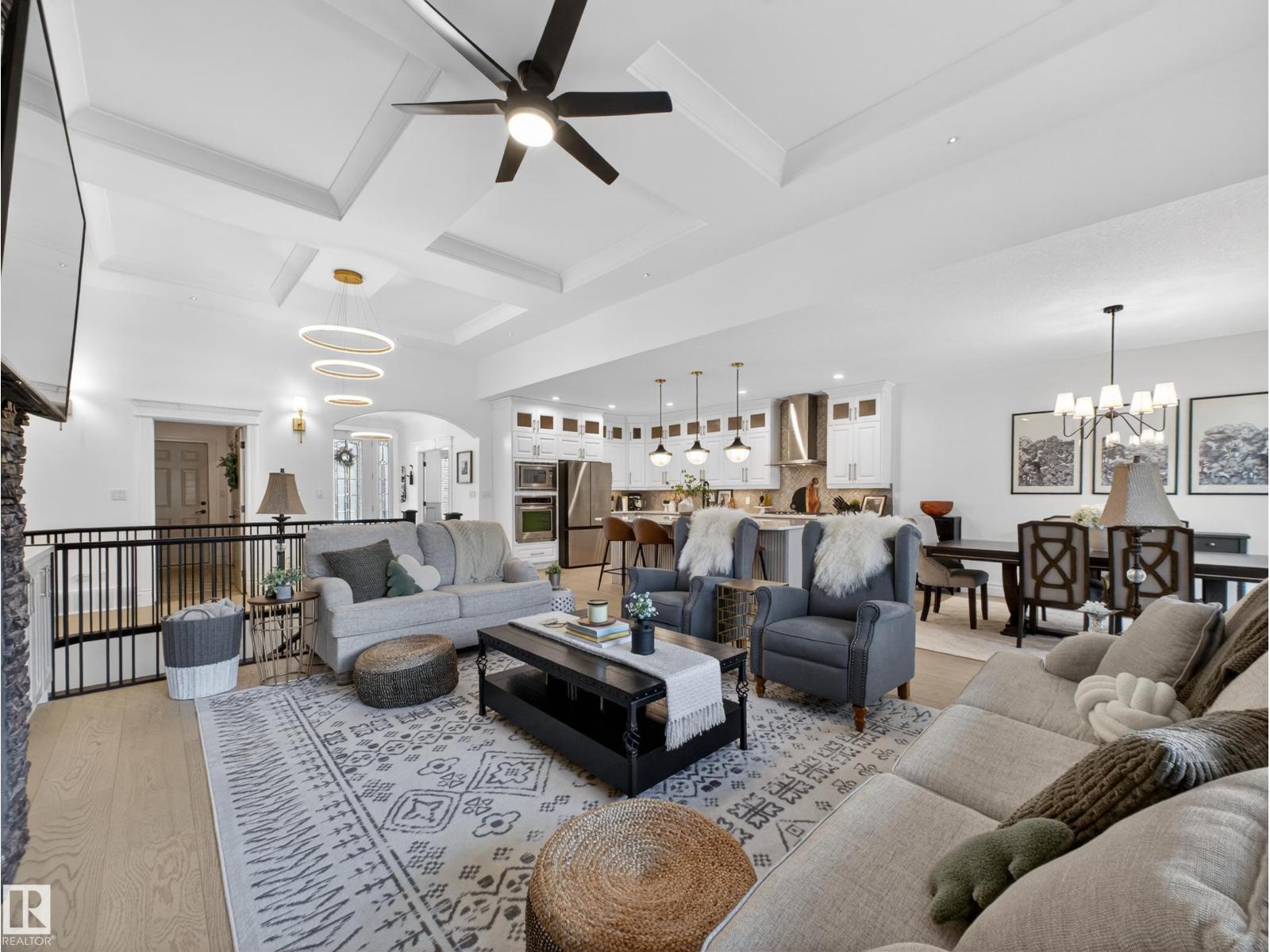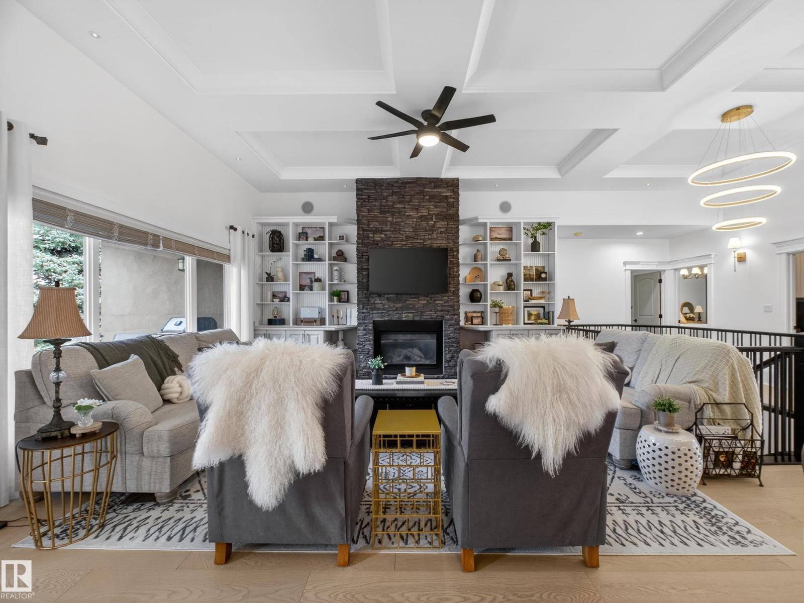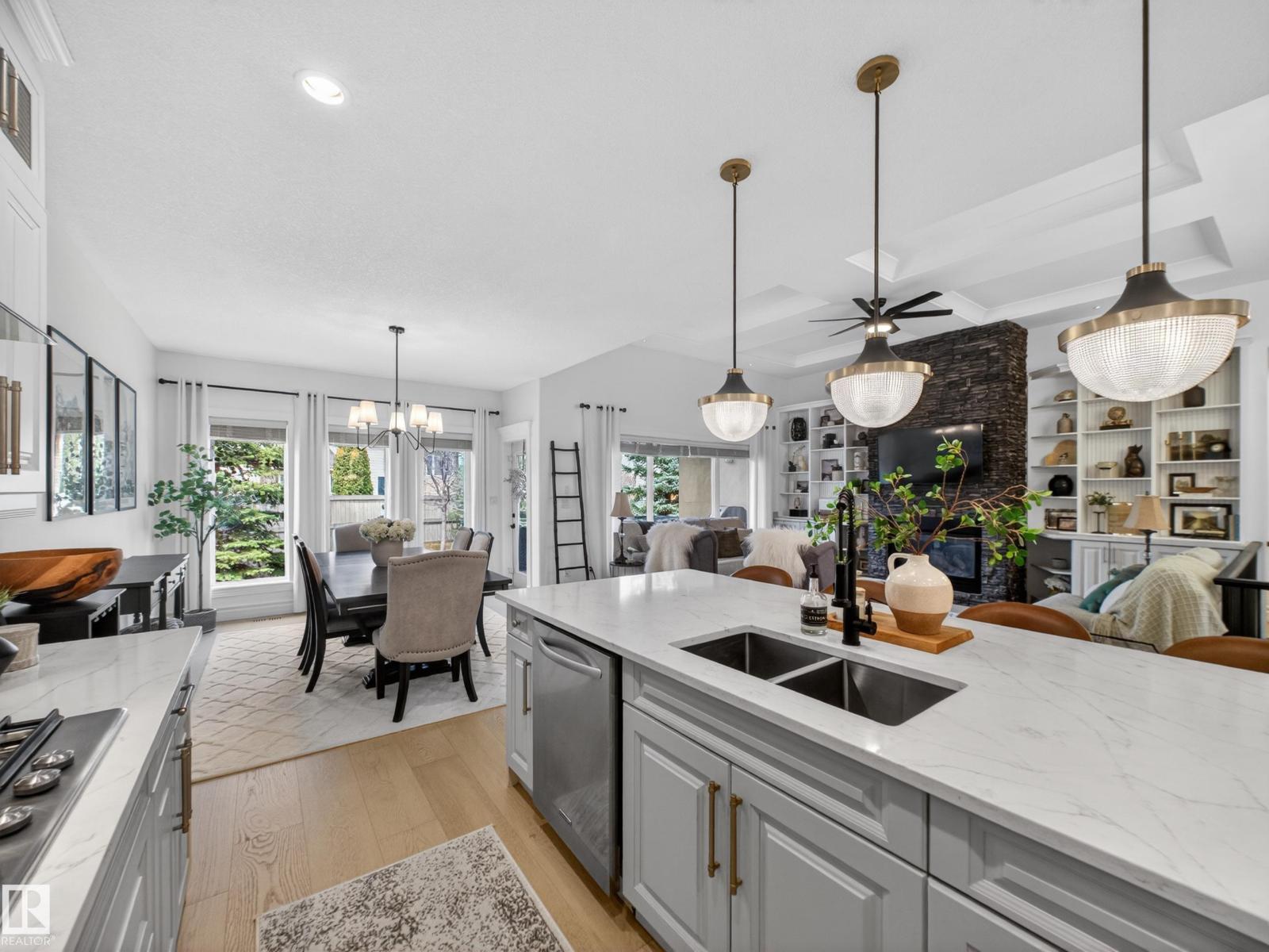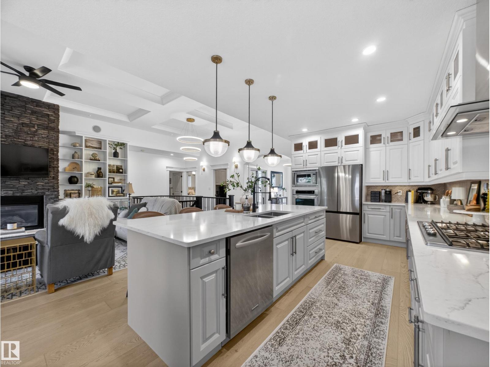 Fully reimagined executive bungalow in the prestigious gated community of Ravines of Richford, offering nearly 3,800 sq ft of refined living. Soaring 11’ coffered ceilings, a striking stacked-stone fireplace, custom millwork, and wide-plank white oak floors set the tone for a bright, upscale interior. The designer kitchen features granite counters, a large island, and seamless flow to the dining area overlooking a private, fully landscaped pie lot. The main-floor primary retreat offers a spa-inspired 5-piece ensuite and walk-in closet, with a private den, second bedroom, full bath, and oversized laundry completing the level. Downstairs delivers exceptional entertaining with a games area, wet bar, theatre room, 2 bedrooms, and full bath. Recent upgrades include a 2025 high-eff furnace, A/C, and more. Finished with a 24’ deep double attached garage with high ceilings—perfect for lifts or storage. (id:63190)