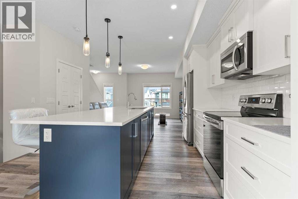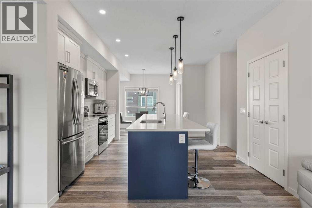 Discover modern comfort, style, and functionality in this bright and spacious 3-storey townhouse in the heart of Harvest Hills. Built by Cedarglen Living, this exceptionally well-maintained, move-in-ready home offers approximately 1500 sq. ft. of thoughtfully designed living space, perfect for today’s lifestyle.Step inside to a welcoming entrance level featuring a versatile flex room ideal for a home office, gym, or study and a dedicated laundry area with side-by-side machines providing functionality for families, guests, or work-from-home flexibility. This level also provides access to the double attached side-by-side garage, offering both convenience and additional storage.The second level showcases a seamless open-concept design enhanced by 9-foot ceilings and durable luxury vinyl plank flooring throughout. The bright, east-facing kitchen is a standout, featuring full-height cabinetry, quartz countertops, stainless steel appliances, and a central island—perfect for both everyday living and entertaining. The spacious dining and living areas flow effortlessly to a private balcony with a BBQ gas line, creating the ideal indoor-outdoor experience. A convenient 2-piece bathroom completes this level. Enjoy year-round comfort with the added benefit of central cooling.Upstairs, this home continues to impress with a generous primary retreat offering a walk-in closet and a 4-piece ensuite complete with double vanity and quartz finishes. Two additional well-sized bedrooms and a full 4-piece bathroom completes this level.This vibrant community offers exceptional amenities including scenic walking paths, green spaces, ponds, and unique features like a community with rentable garden beds, as well as pickleball and basketball courts. Ideally located just minutes from Calgary International Airport, with quick access to Deerfoot Trail and Stoney Trail, and close to everyday conveniences such as T&T Supermarket, Sobeys, Superstore, Canadian Tire, Home Depot, Landmark Cinemas, schools (both CSSD and CBE) and restaurants.Offering a low-maintenance lifestyle with all living space above grade, this premium-spec home truly checks all the boxes. (id:63190)