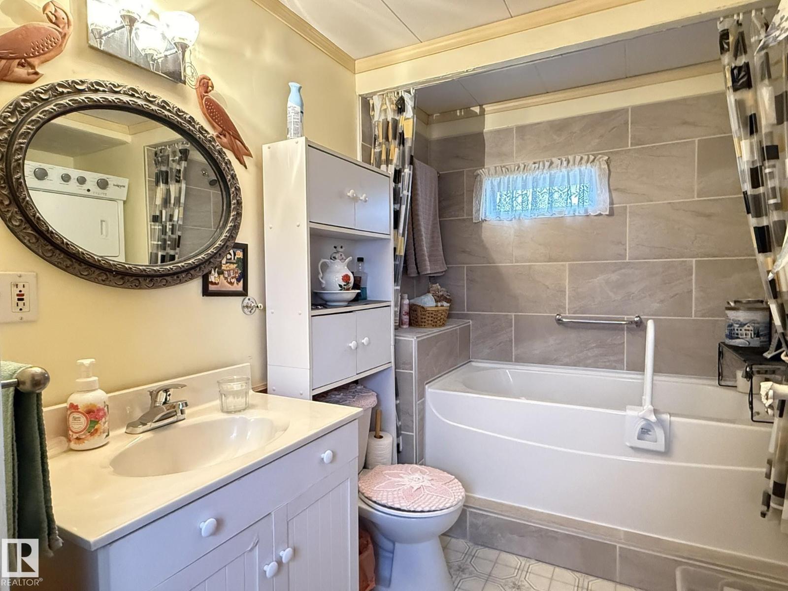 Nice and move in ready! Open bright living area with large East and South facing windows, kitchen has maple cabinets and gas stove. Spacous renovated bathroom/laundry. Large bedroom with plenty of storage. Home has had many upgrades over the years including insulation, drywall, windows, exterior doors, HWT, furnace, plumbing, cabinets, flooring and newer peaked roof and shingles. Peaceful living on a huge 70x110 fenced lot backing a field. (id:63190)