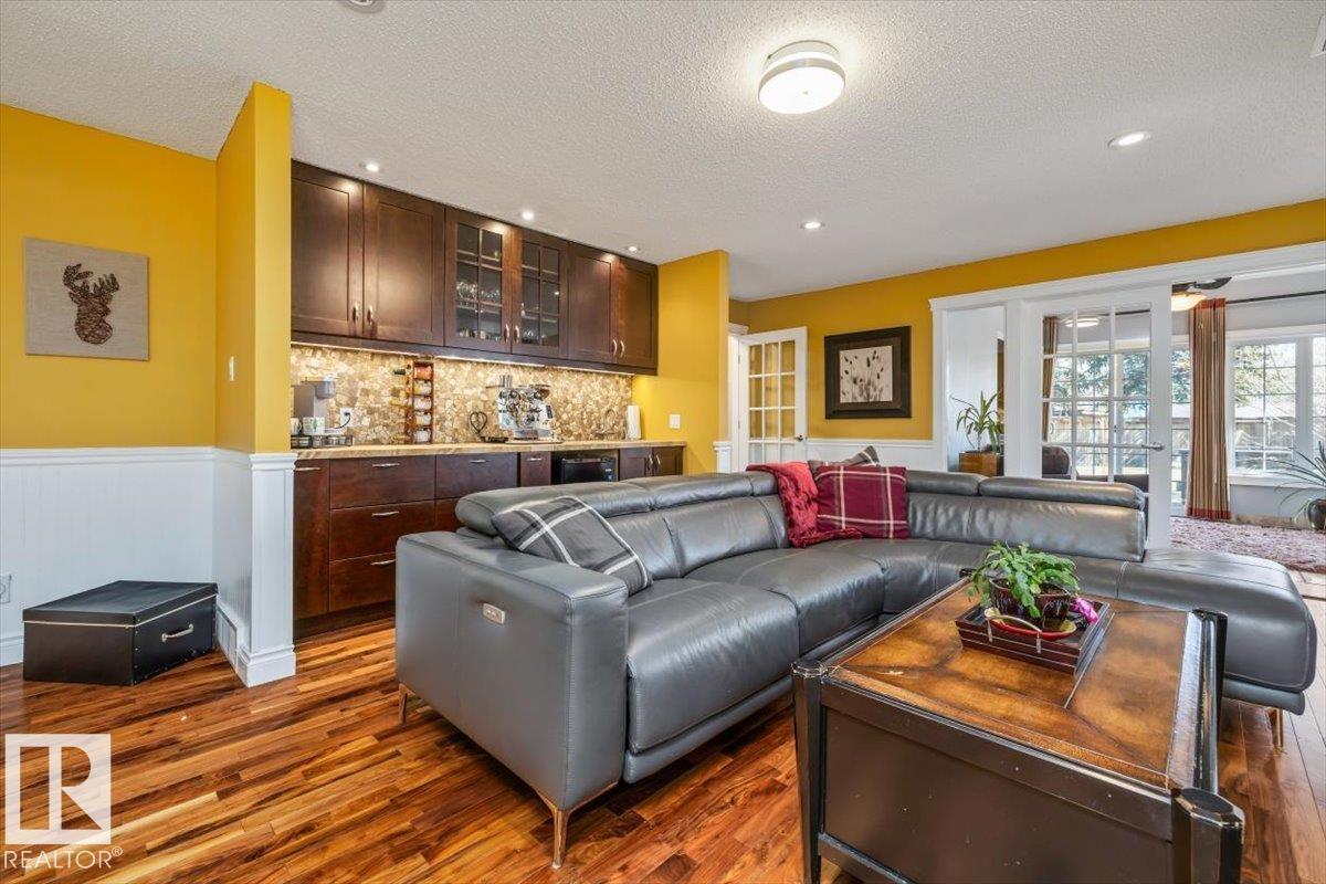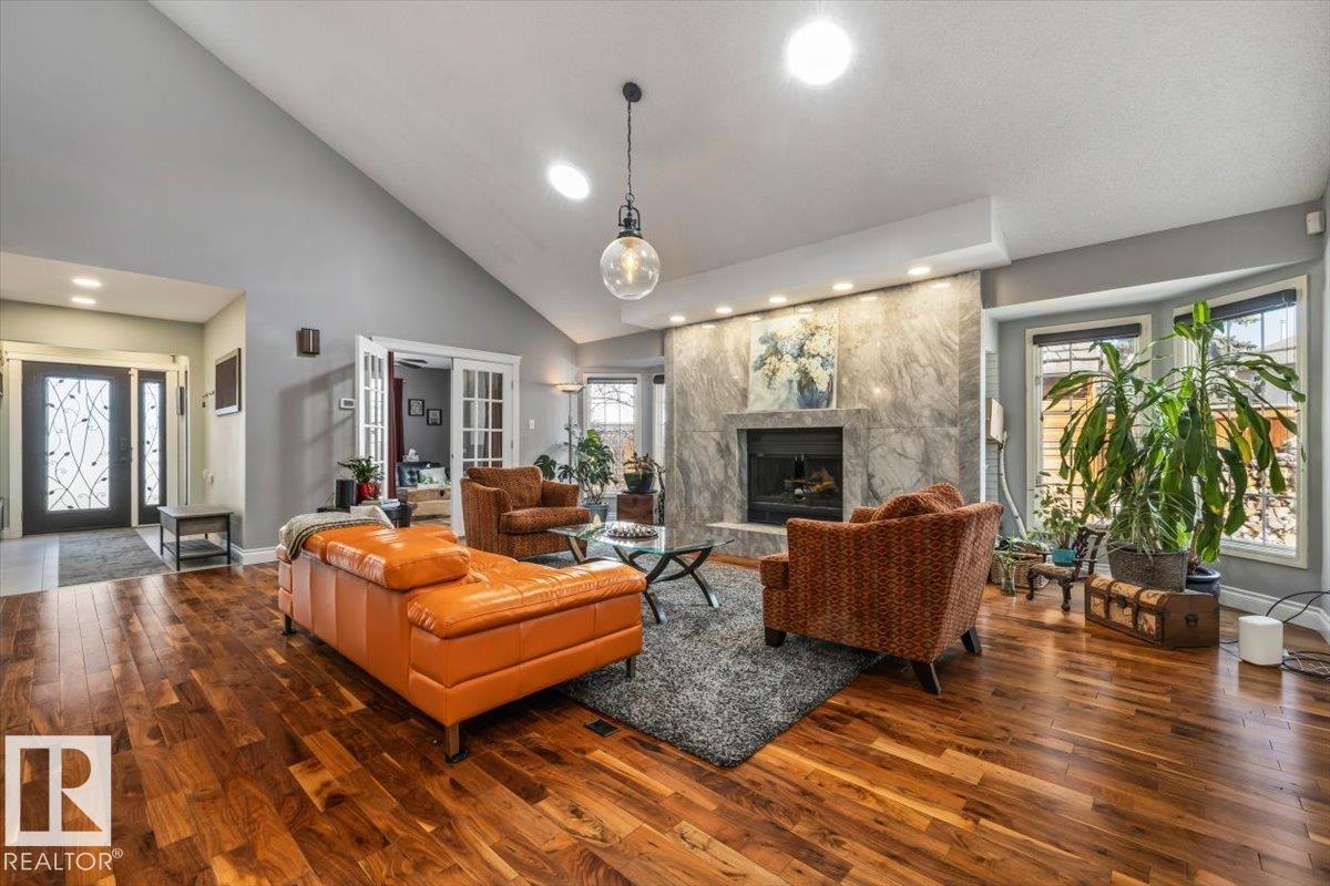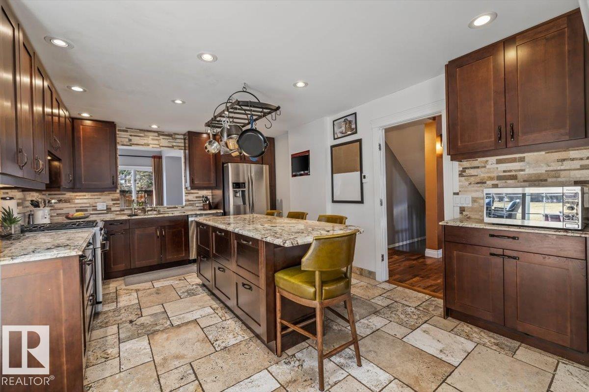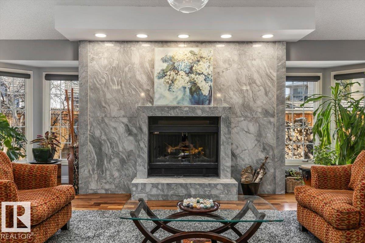 Charming 4 bed, 4 bath home in Gariepy with 3,143 sq ft above grade plus a partially finished basement for over 4,000 sq ft total, moments from the ravine. Main floor with vaulted ceilings open to above, floor-to-ceiling windows, marble-faced wood-burning fireplace, A/C and solar tubes in the main living space. Chef’s kitchen with granite counters, gas stove, stone flooring, and radiant heat. Real stone (travertine) tile throughout, porcelain tile in the entrance. 4-season sunroom (2009) with in-floor heating. Family room with second gas fireplace and wet bar with instant hot water. Main floor bedroom/den and formal dining. Upstairs primary with vaulted ceilings and Tiger Eye hardwood, plus 3 spacious bedrooms and updated bath. Radiant heated floors in upper baths. Large private fenced lot. (id:63190)