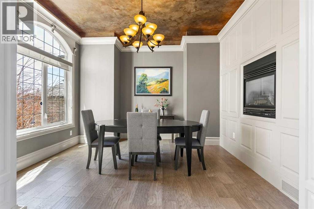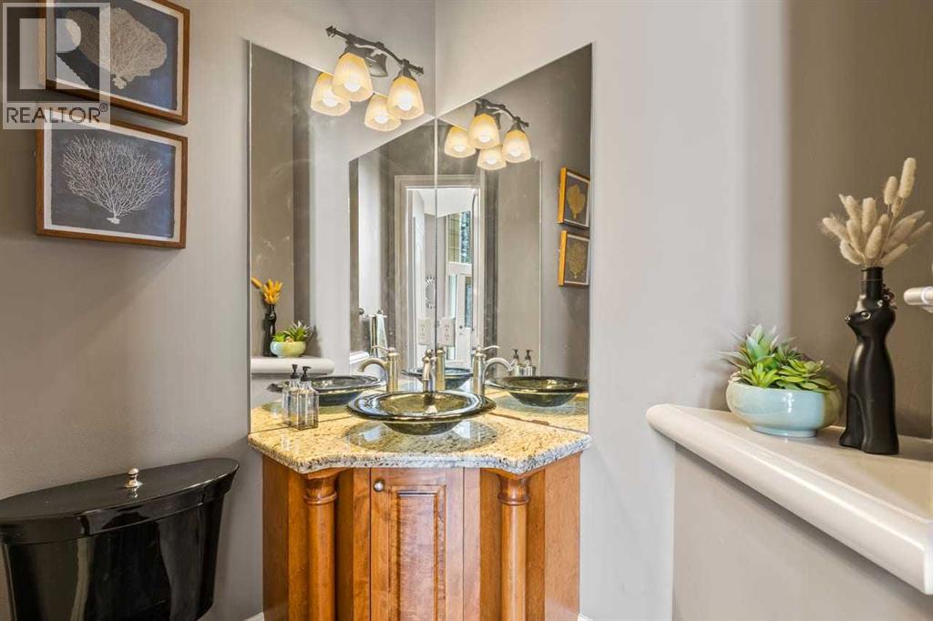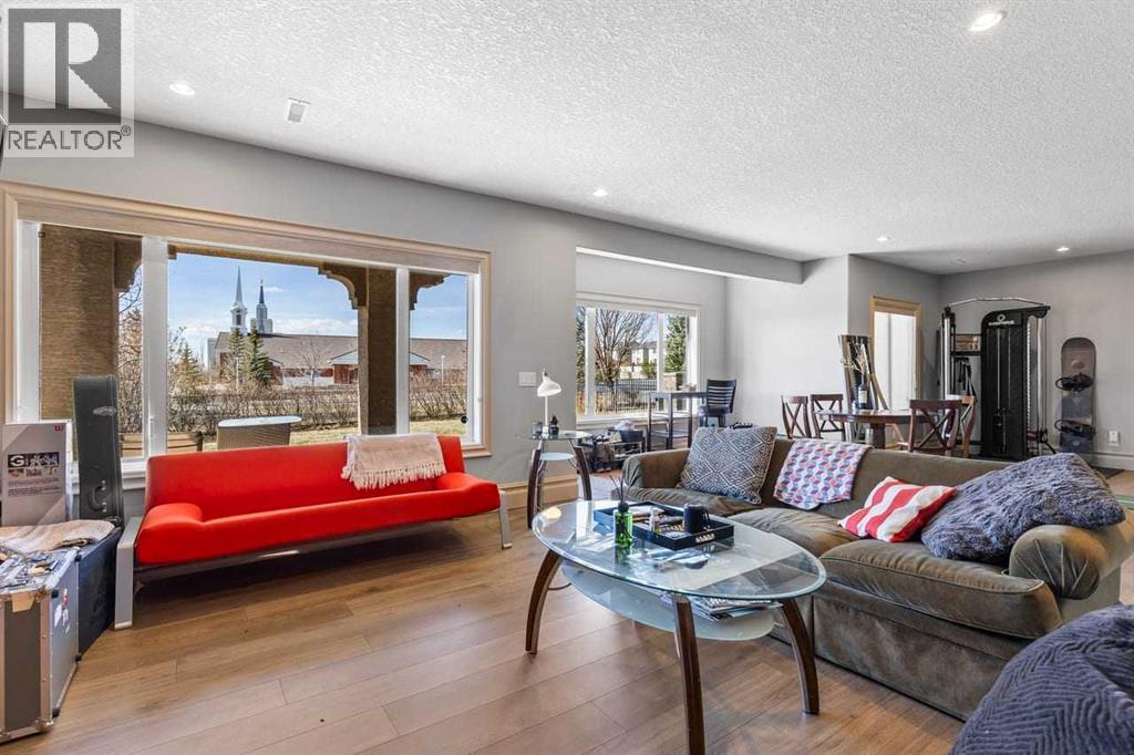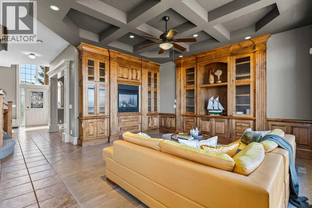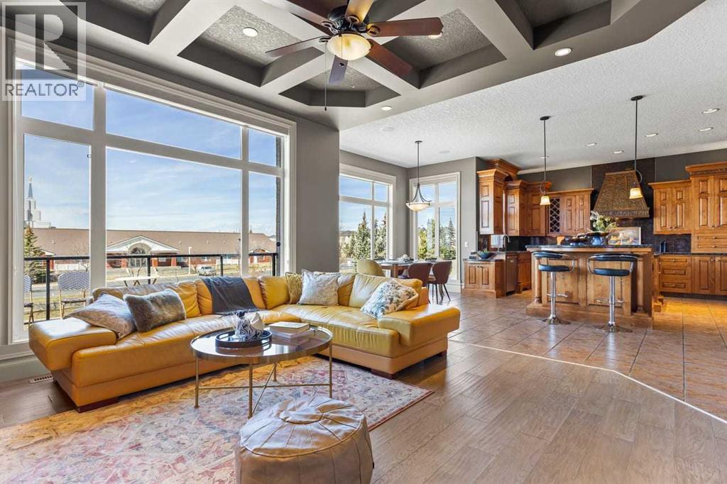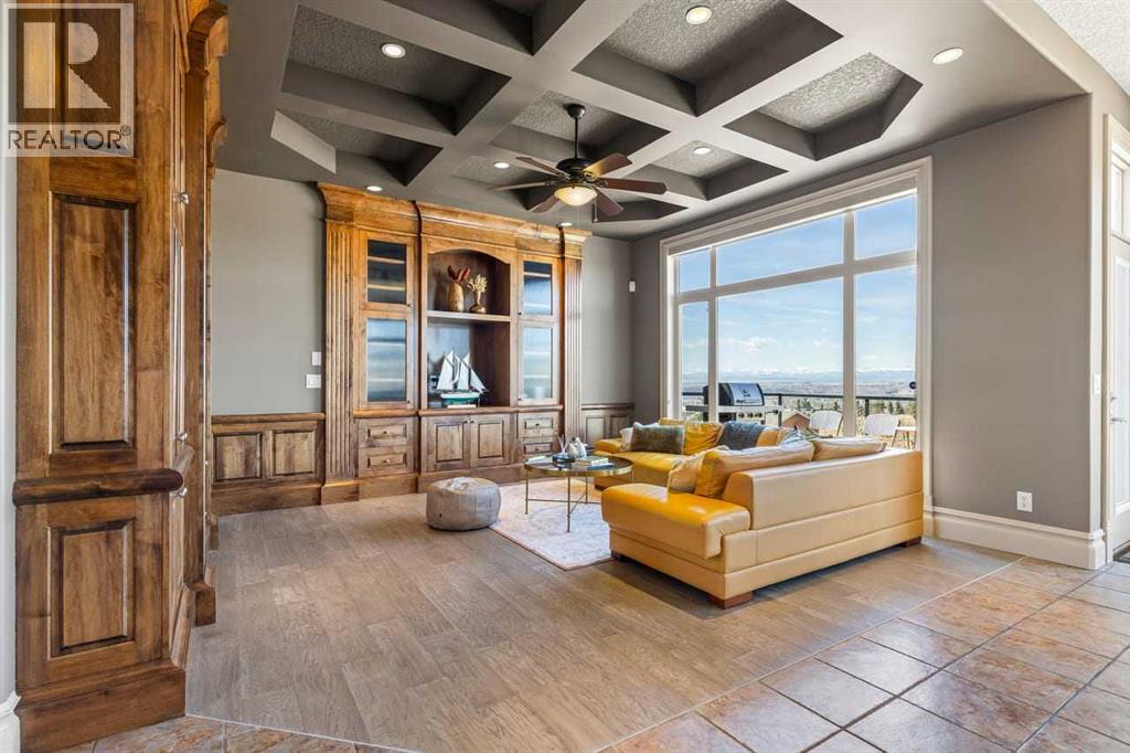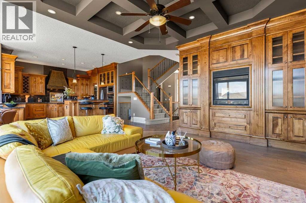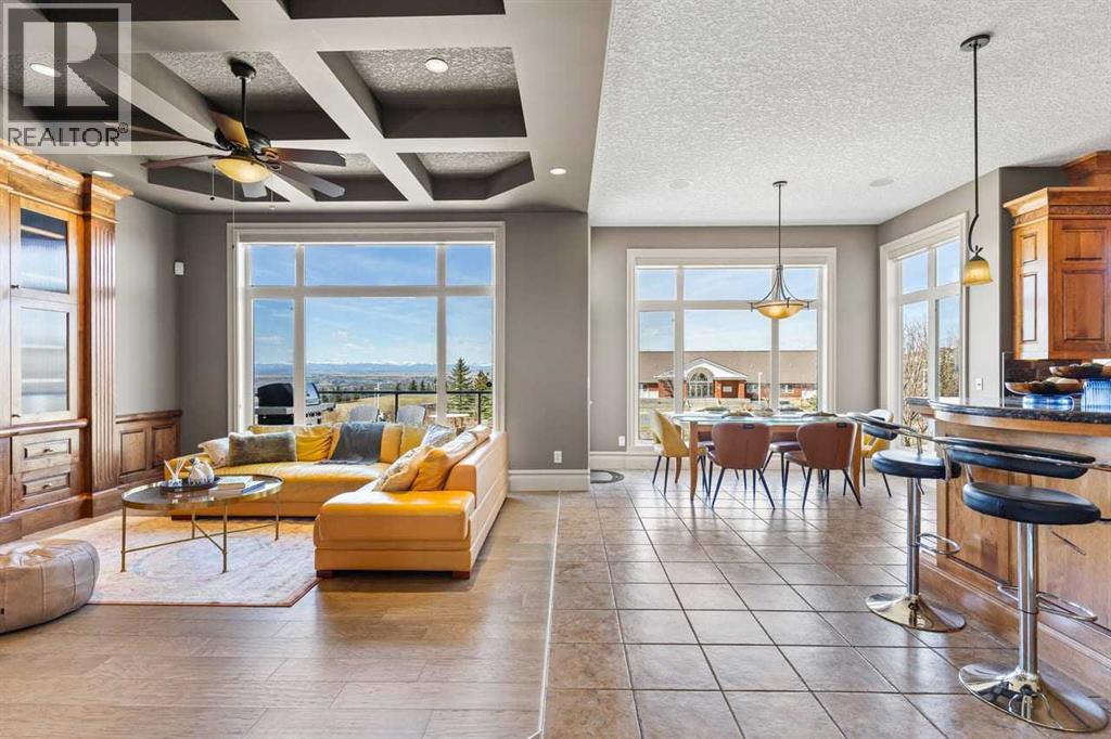 Panoramic Rocky Mountain views take center stage in this exceptional former show home, creating a sense of space and calm that is immediately felt the moment you enter. Offering over 4,000 sq. ft. of total living space, the spacious main floor is enhanced by 10 ft ceilings and an open-concept layout designed to maximize light and sightlines. Expansive windows frame the landscape like artwork, with open skies, rolling horizon, and distant peaks visible throughout the main living areas. The living room is both inviting and refined, anchored by a coffered ceiling and a substantial custom wood built-in that speaks to the level of craftsmanship throughout. Warm engineered hardwood flooring and the seamless connection to the dining area create a space equally suited for everyday living and entertaining. A separate main floor sitting area provides additional flexibility for formal gatherings or a quiet retreat.Originally built by Ashton Luxury Living, the home reflects an exceptional level of detail and finish throughout. The kitchen is thoughtfully designed with ceiling-height solid wood cabinetry, a generous granite island, high-end stainless steel appliances, a custom range hood, full-height backsplash, durable tile flooring, and a walk-in pantry for exceptional storage. The main floor balcony, accessed from the kitchen and dining area, offers a seamless indoor-outdoor transition, perfect for enjoying the mountain views. A functional main floor laundry room with sink adds everyday convenience. Upstairs, the primary suite serves as a private retreat, featuring a cathedral ceiling, with views of the Rocky Mountains, a spacious 5-piece ensuite, and a walk-in closet with custom cabinetry. The ensuite is beautifully finished with furniture-style vanities, detailed millwork, and a deep soaker tub within a fully tiled surround. The bonus room is a standout feature, enhanced by extensive built-in cabinetry that adds both character and highly functional storage, ideal for a me dia room, office, or family space.The fully developed walk-out basement offers a bright and functional extension of the home, with large windows that create an inviting atmosphere. A spacious living area is complemented by a wet bar with granite countertops, ideal for entertaining or everyday use. With durable flooring, a full bathroom, and direct outdoor access, this level provides excellent flexibility for guests, extended family, or additional living space. Additional features include an oversized double garage, a new hot water tank (2023), and recently updated second-floor windows. Ideally located within walking distance to schools and with access to nearby walking and biking pathways, this home also offers convenient access to the Shane Homes YMCA, C-Train station, Stoney Trail, and Crowchild Trail. A rare combination of enduring quality, thoughtful design, and truly exceptional views - be sure to explore the 3D tour for a complete experience. (id:63190)