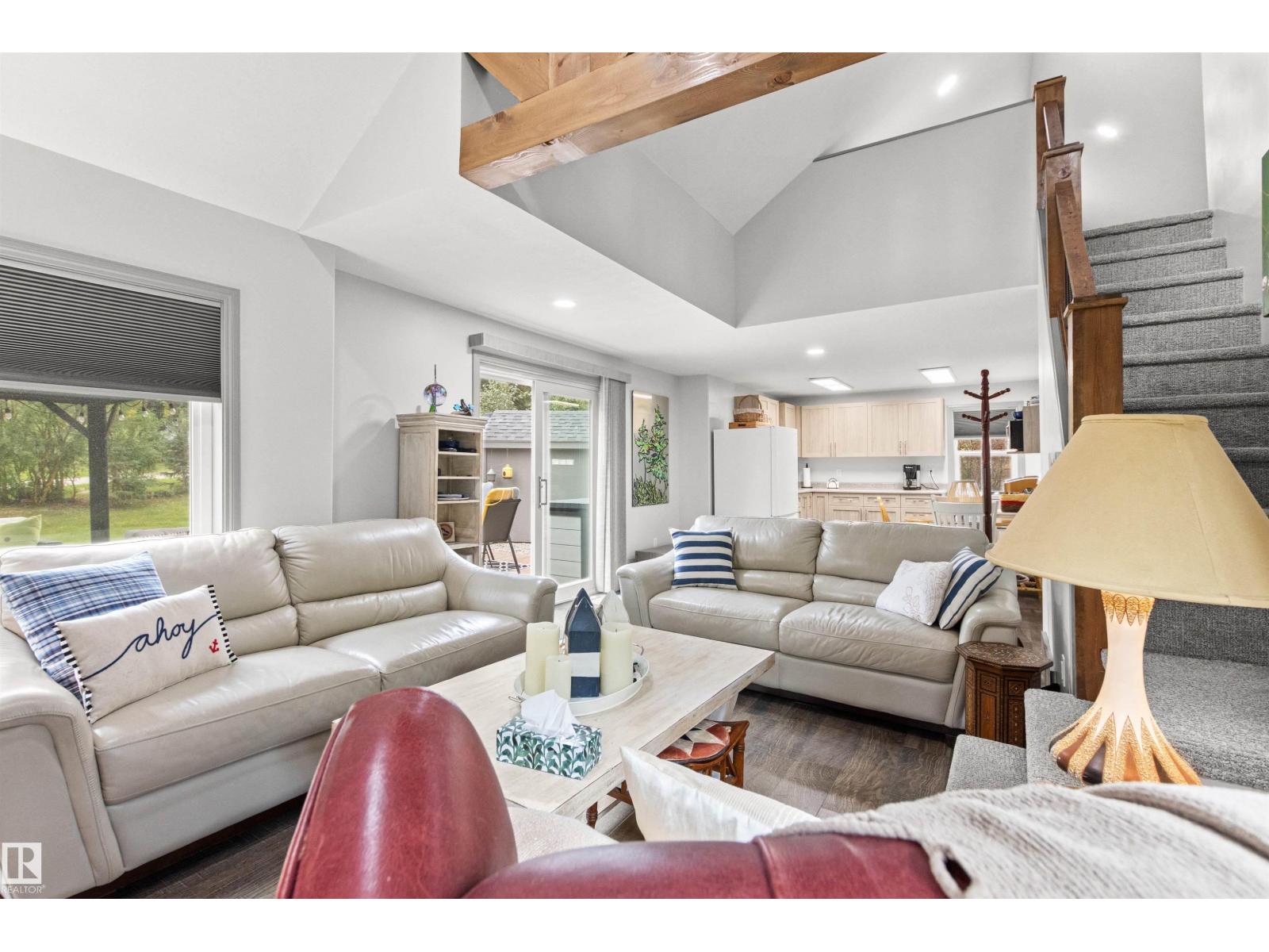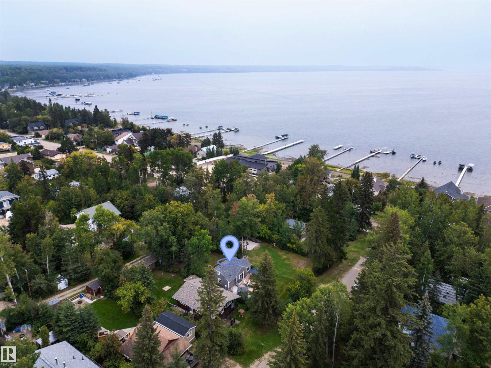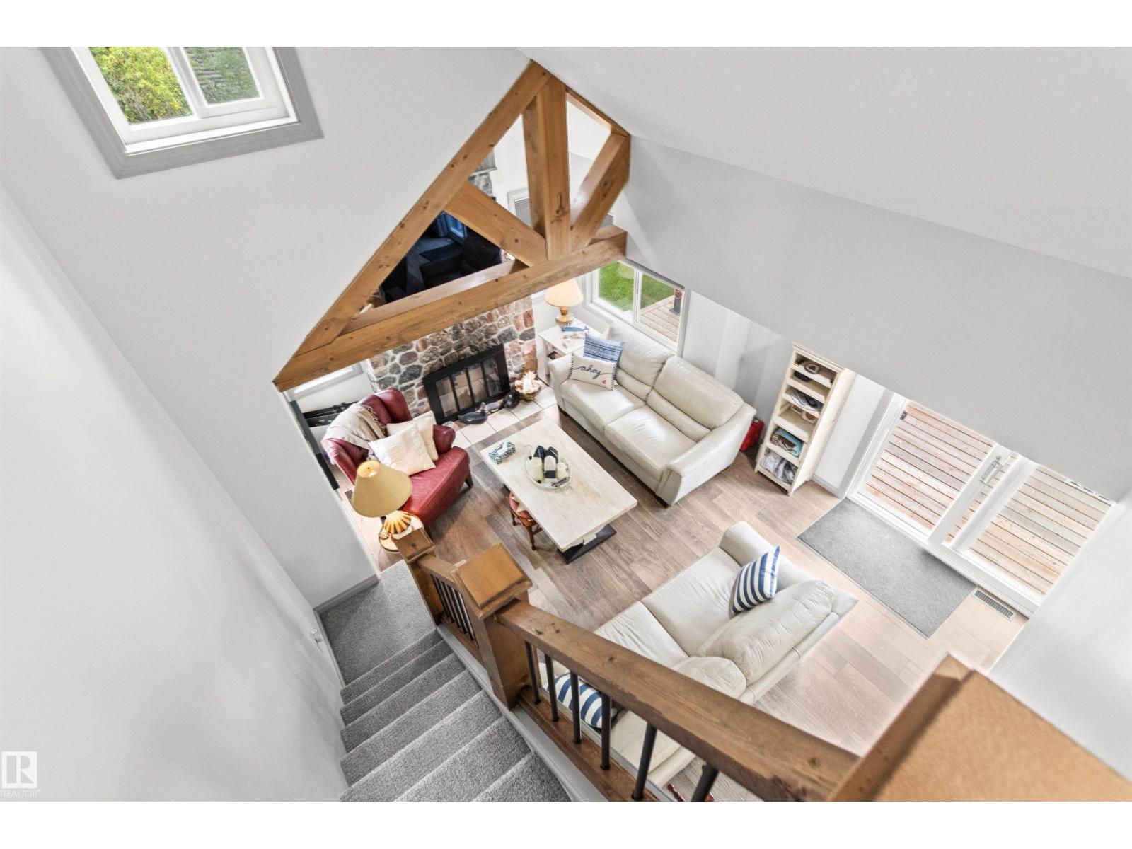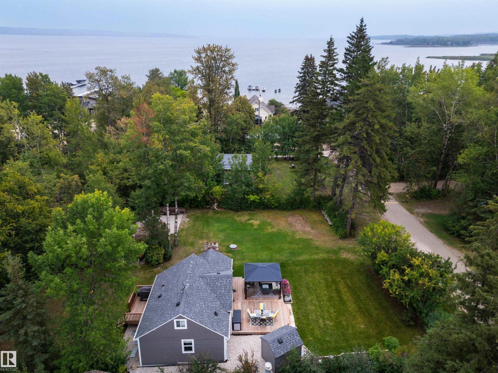 Nestled among mature trees on a private double lot backing onto a creek in sought-after Seba Beach, this 1.5-storey retreat offers exceptional privacy & a peaceful natural setting. Fully renovated top to bottom in 2020, the home blends modern comfort w/ timeless character, highlighted by vaulted ceilings, an exposed timber beam truss, and the original wood-burning stone fireplace. The kitchen is cleanly designed w/ contemporary finishes & flows seamlessly into the main living area, complemented by a spacious 4-piece bath. The main floor hosts the primary bedroom, while the loft above provides a flexible second sleeping area ideal for guests or family. Outdoors, the property features a covered front gazebo, dedicated fire pit area & an expansive, tree-lined yard that provides ideal privacy. Additional upgrades: roof, high-efficiency furnace, hot water tank & pressure tank. Located just a short walk to the public beach and local amenities, this turnkey property is a rare opportunity on a premium double lot (id:63190)