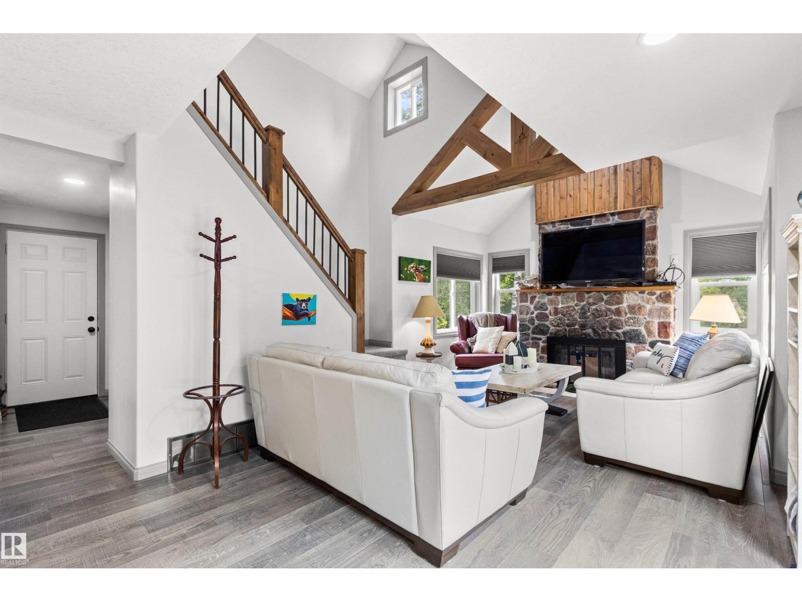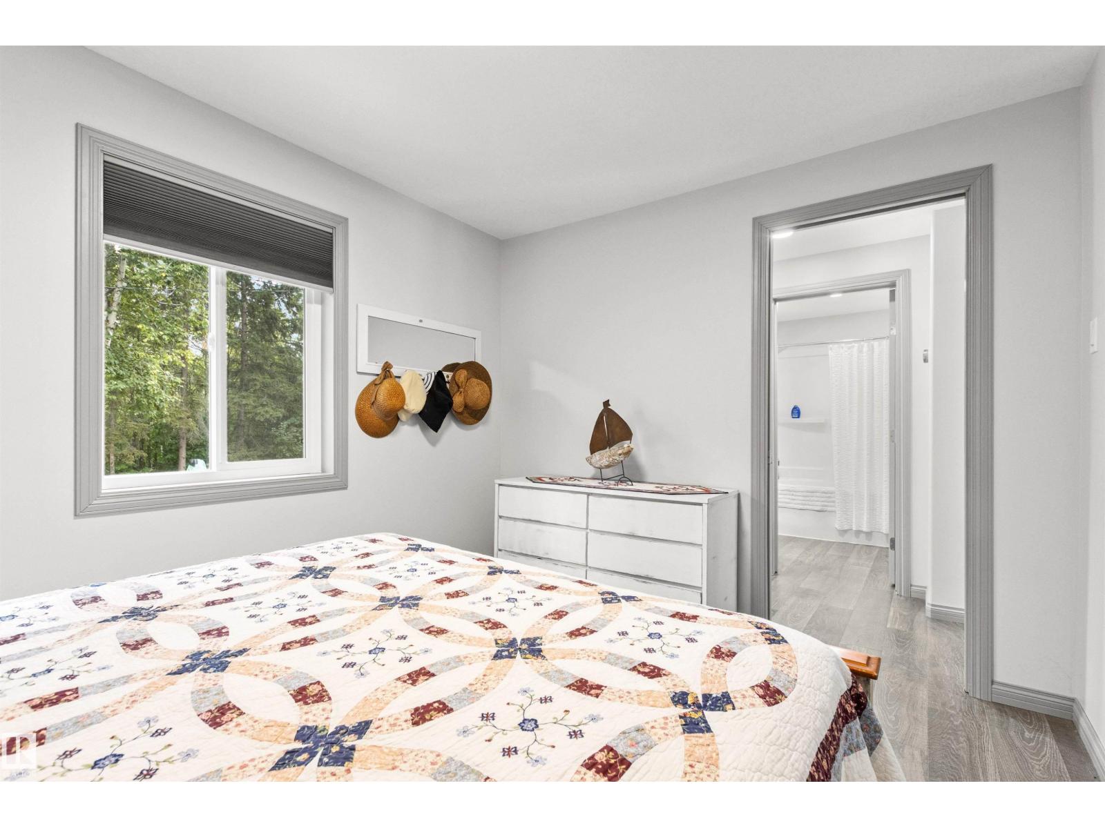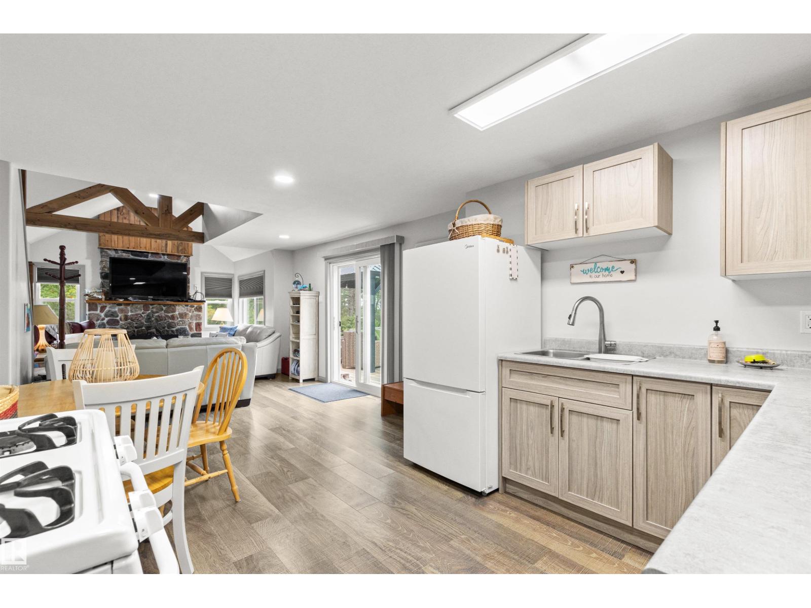Nestled among mature trees on a private double lot backing onto a creek in sought-after Seba Beach, this 1.5-storey retreat offers exceptional privacy & a peaceful natural setting. Fully renovated top to bottom in 2020, the home blends modern comfort w/ timeless character, highlighted by vaulted ceilings, an exposed timber beam truss, and the original wood-burning stone fireplace. The kitchen is cleanly designed w/ contemporary finishes & flows seamlessly into the main living area, complemented by a spacious 4-piece bath. The main floor hosts the primary bedroom, while the loft above provides a flexible second sleeping area ideal for guests or family. Outdoors, the property features a covered front gazebo, dedicated fire pit area & an expansive, tree-lined yard that provides ideal privacy. Additional upgrades: roof, high-efficiency furnace, hot water tank & pressure tank. Located just a short walk to the public beach and local amenities, this turnkey property is a rare opportunity on a premium double lot (id:63190)