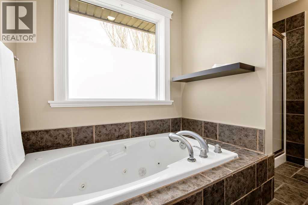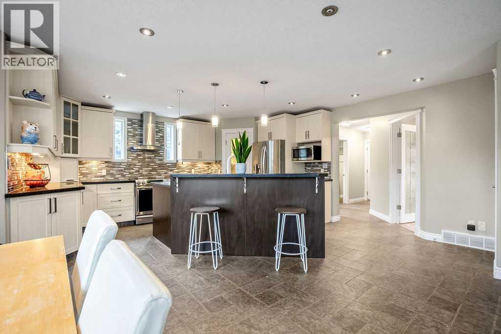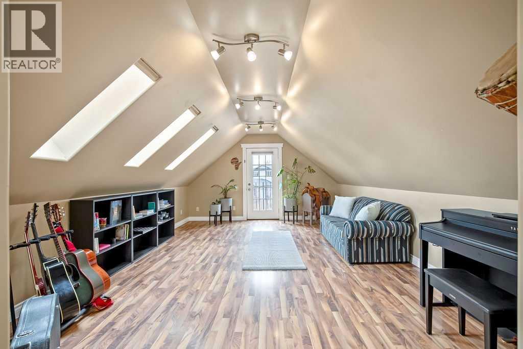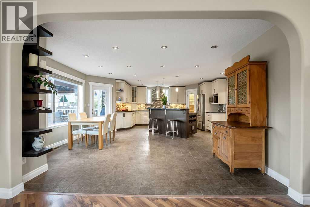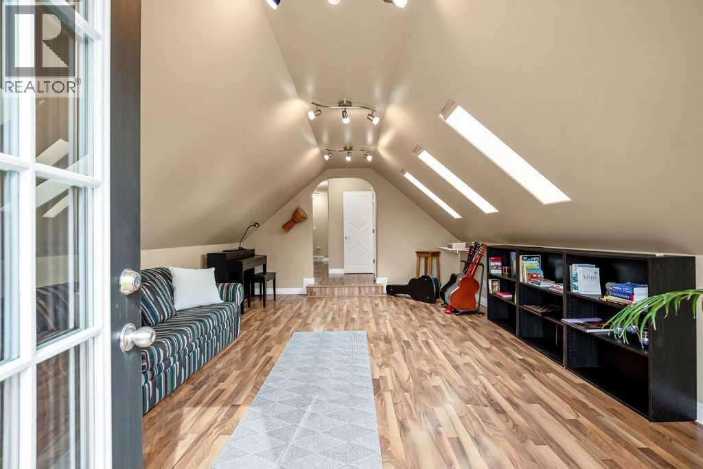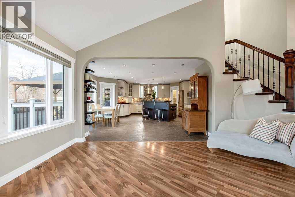 Experience refined country estate living in this exceptional custom-built home, ideally situated in the prestigious Air Ranch community. Set on an expansive 0.41-acre Pie lot—one of the largest in Okotoks—this remarkable property offers a rare blend of space, privacy, and natural beauty. The west-facing backyard is truly spectacular, surrounded by mature trees that create a private, park-like oasis—perfect for elegant outdoor entertaining or quiet evenings enjoying breathtaking sunsets. Positioned on a peaceful cul-de-sac, the property offers endless lifestyle possibilities, with ample space for RV parking, recreation, gardening, or seasonal outdoor features. It’s a setting that seamlessly balances tranquility with everyday convenience. Inside, the home showcases over 3,300 sq. ft. of thoughtfully designed and fully developed living space. The main level impresses with soaring vaulted ceilings and an open-concept layout, anchored by a warm and inviting gas fireplace. The beautifully renovated kitchen is both stylish and functional, featuring rich cabinetry with under-cabinet lighting, granite countertops, generous storage, and a well-appointed corner pantry. The upper level offers three spacious bedrooms along with a versatile bonus room—ideal as a private office, or elegant flex space. The primary suite is a true retreat, complete with double-door entry, a private west-facing balcony, a custom walk-in closet, and a luxurious 5-piece ensuite designed for relaxation. The fully finished lower level continues the home’s elevated feel with 9’ ceilings and the added comfort and convenience of motorized blinds. Recent system upgrades enhance both comfort and efficiency, including new furnaces, humidifiers, new central air conditioning units, hot water on demand, and solar panels—delivering modern performance with long-term energy savings. Additional features include a heated oversized garage, a premium ICF foundation, underground sprinklers, upgraded window coverings, r ear window film, a water softener, and a built-in vacuum system. An exceptional offering, this home includes a hot tub, sauna, pool table, two sheds, and a children’s play structure—creating a true turnkey lifestyle opportunity. A distinguished property offering space, privacy, and elevated living in one of Okotoks’ most desirable communities. (id:63190)