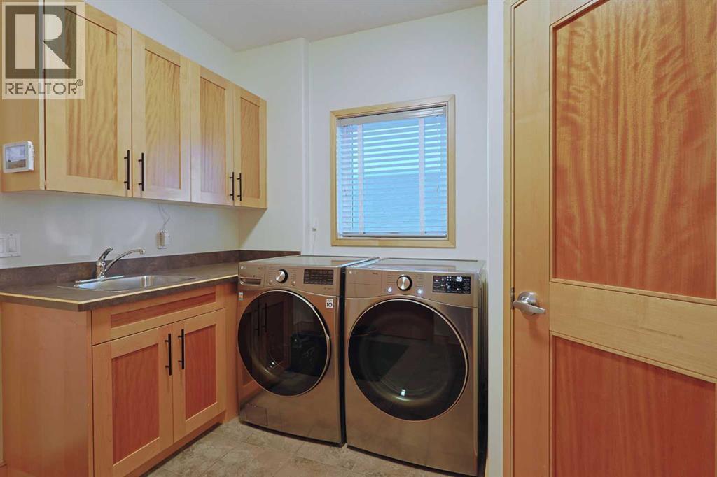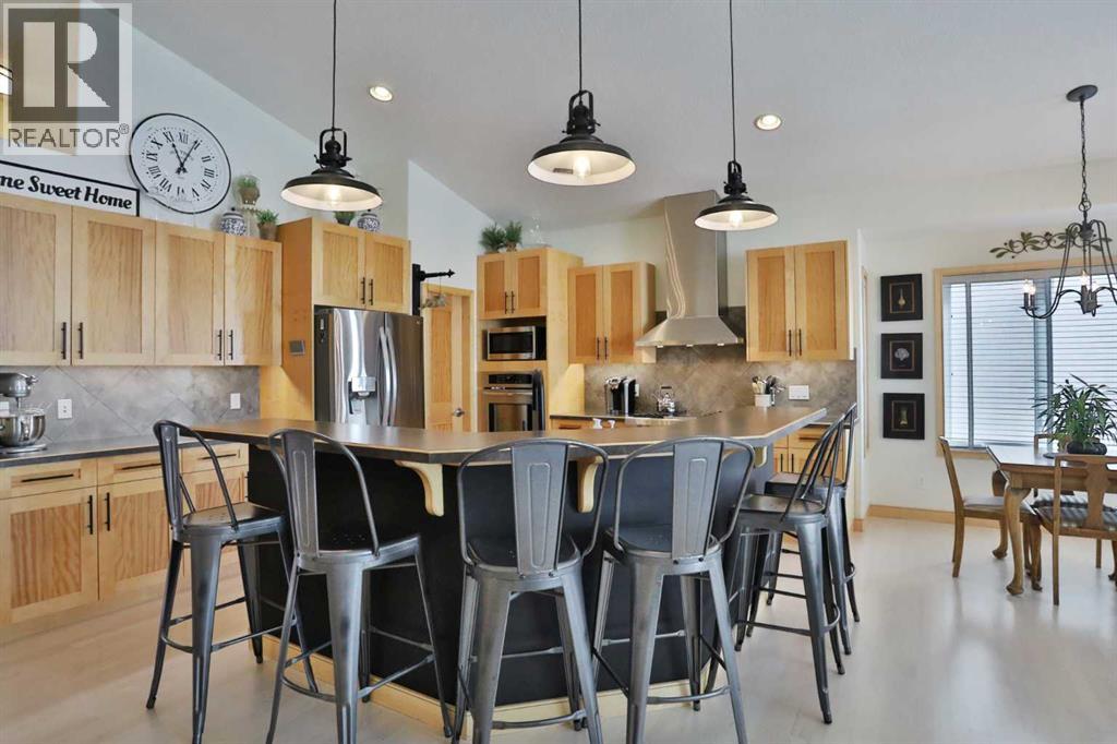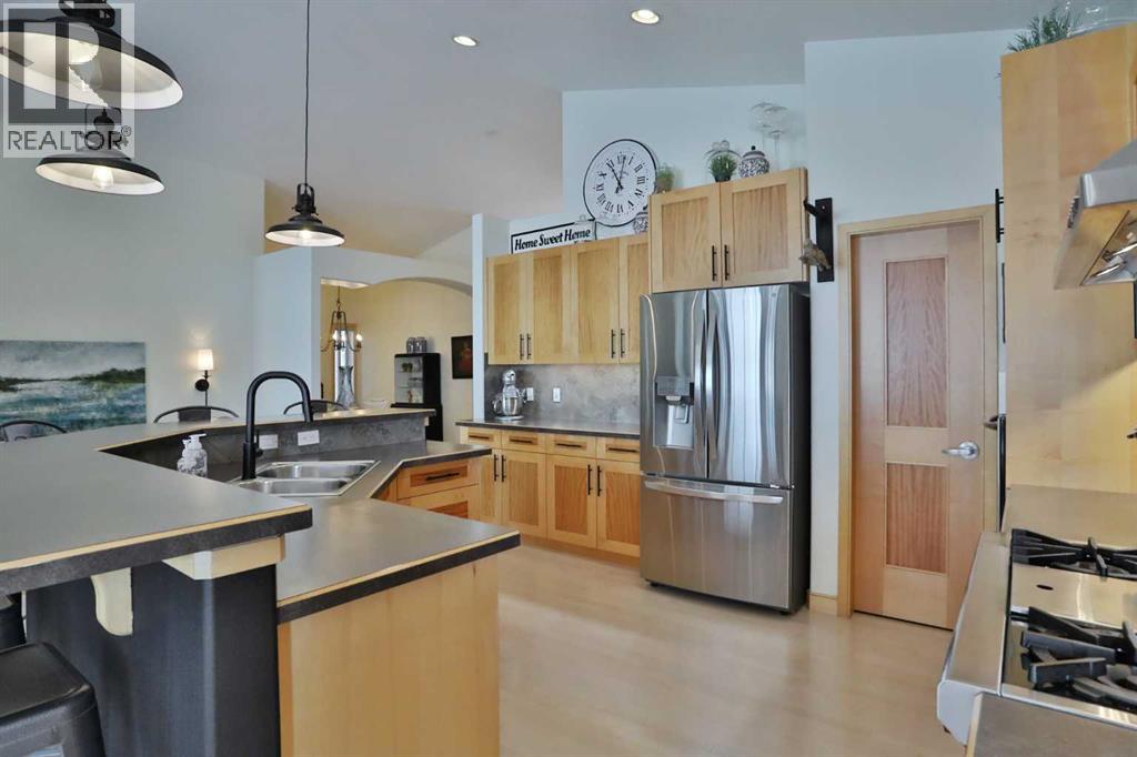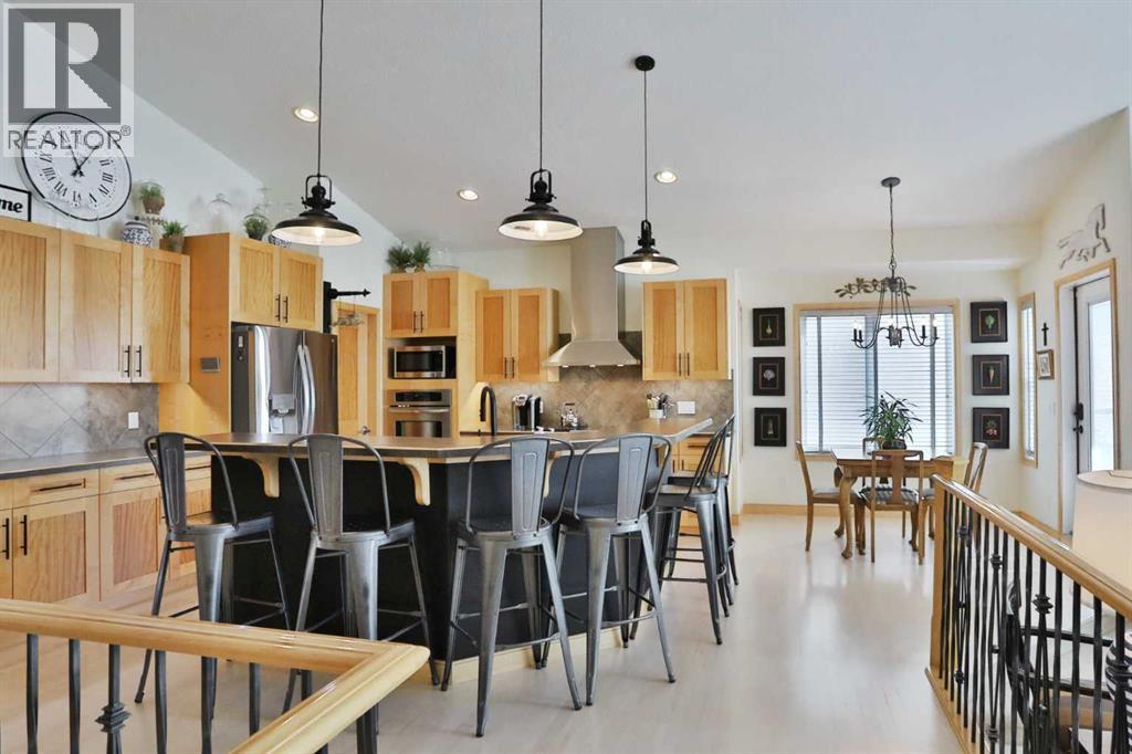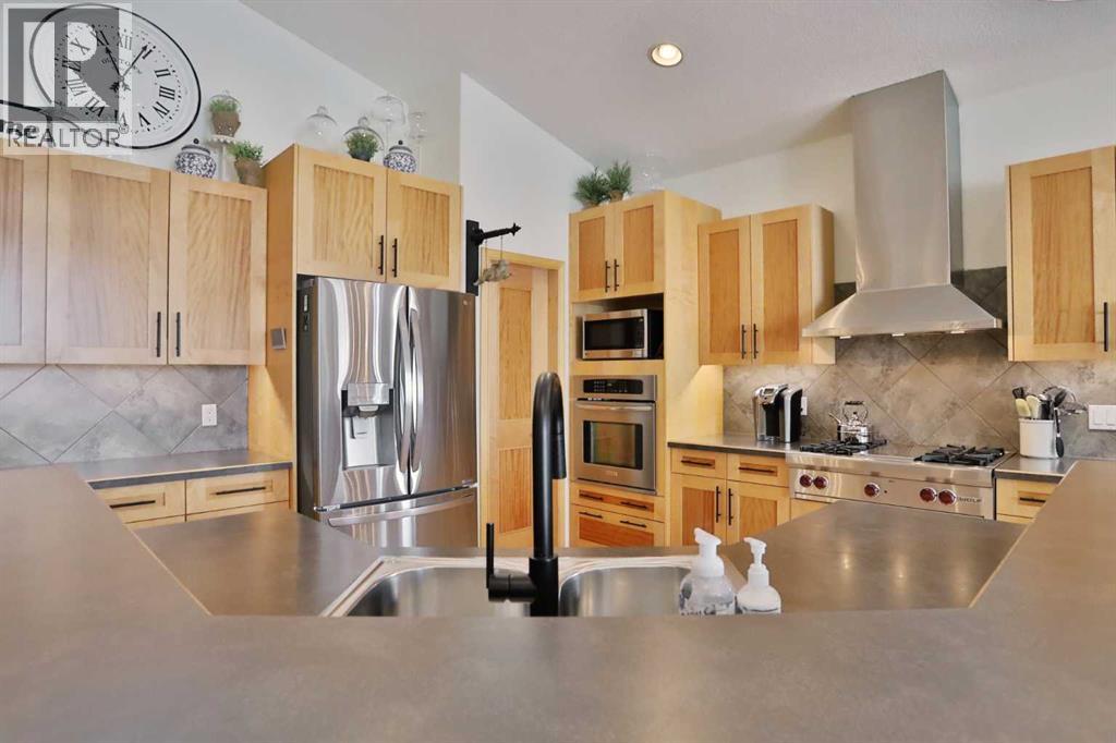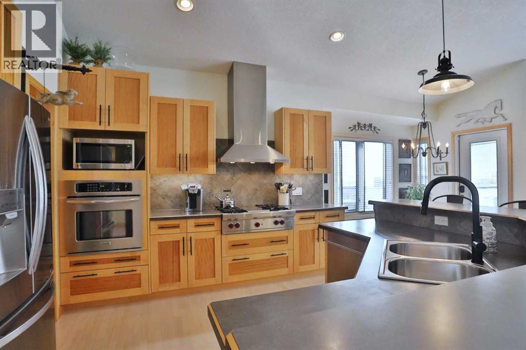 A rare opportunity you won’t want to miss here in this beautifully updated bungalow backing onto the escarpment in the popular Symons Valley community of Sherwood. Offering a total of 3 bedrooms + den & over 2900sqft of living space, this mint condition air-conditioned home enjoys refinished onsite maple hardwood floors, stunning kitchen with custom maple/mahogany cabinetry, sensational lower level with infloor heating & beautifully landscaped backyard with lush perennial gardens & stone patio..plus a host of improvements including storm-resistant roof, hot water tank & appliances. Truly incredible open concept main floor with soaring vaulted ceilings, showcasing the sun-drenched living room with fireplace & expanse of windows, elegant formal dining room with graceful archway & custom kitchen with large island & ceramic tile backsplash, oversized walkthru pantry & the upgraded stainless steel appliances include Wolf gas cooktop with built-in griddle & chimney hoodfan, built-in Frigidaire Pro convection oven, & new dishwasher (2025) & fridge (2024)...both from LG. The private owners' retreat is an airy & inviting space with a big bay window, great-sized walk-in closet & jetted tub ensuite with double vanities, tile floors & separate shower. Renovated in 2022 (with permits), the lower level - with 9ft ceilings & infloor heating, is beautifully finished with 2 bedrooms, large full bath with linen closet, office/craft room with barn door closet & terrific games/rec room...the perfect spot to hang out with the family. Main floor also has a dedicated home office with French doors & laundry room with built-in cabinets/sink & new LG washer & dryer (2025). Both the front & back yards are exquisitely & professionally landscaped...with stone walkways & patio, new permanent outdoor Gemstone X-mas lights (2025), 3-tiered concrete fountain (backyard) & deck complete with natural gas line for your BBQ, under-deck storage & Duradek weather-protection deck. Extensive features includ ing plantation shutters (lower level) & 2” Levolor blinds (main level), finished garage with new heater (2024) & sealed floors, solid maple doors & cabinets with mahogany inserts, exposed aggregate front walkway & driveway, glass hand railings & in addition to the new roof in 2025 & refinished hardwood floors in 2026, there are new light fixtures, 2 new industrial-size/high-efficiency hot water tanks (2025), brand new furnace (2026), new central air (2023) & new main floor carpets (2024). A simply amazing home just minutes to neighbourhood greenspaces & Blessed Marie-Rose School, walking distance to bus stops & quick easy access to shopping (including Beacon Hill, Sage Hill Crossing & Sage Hill Quarter) & Stoney/Sarcee/Shaganappi Trails. (id:63190)