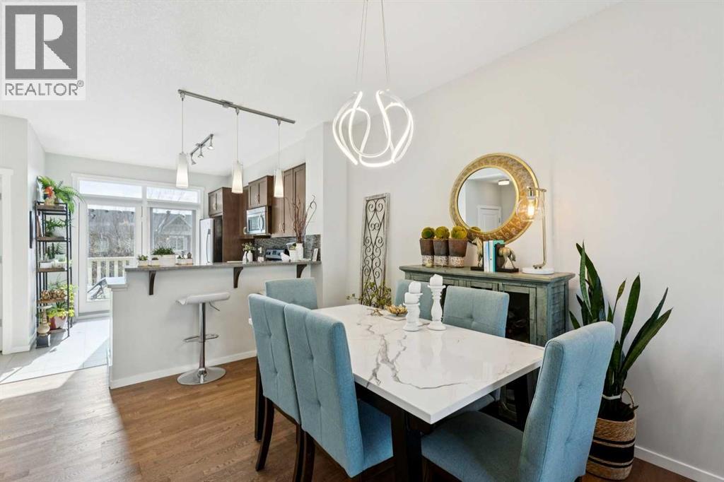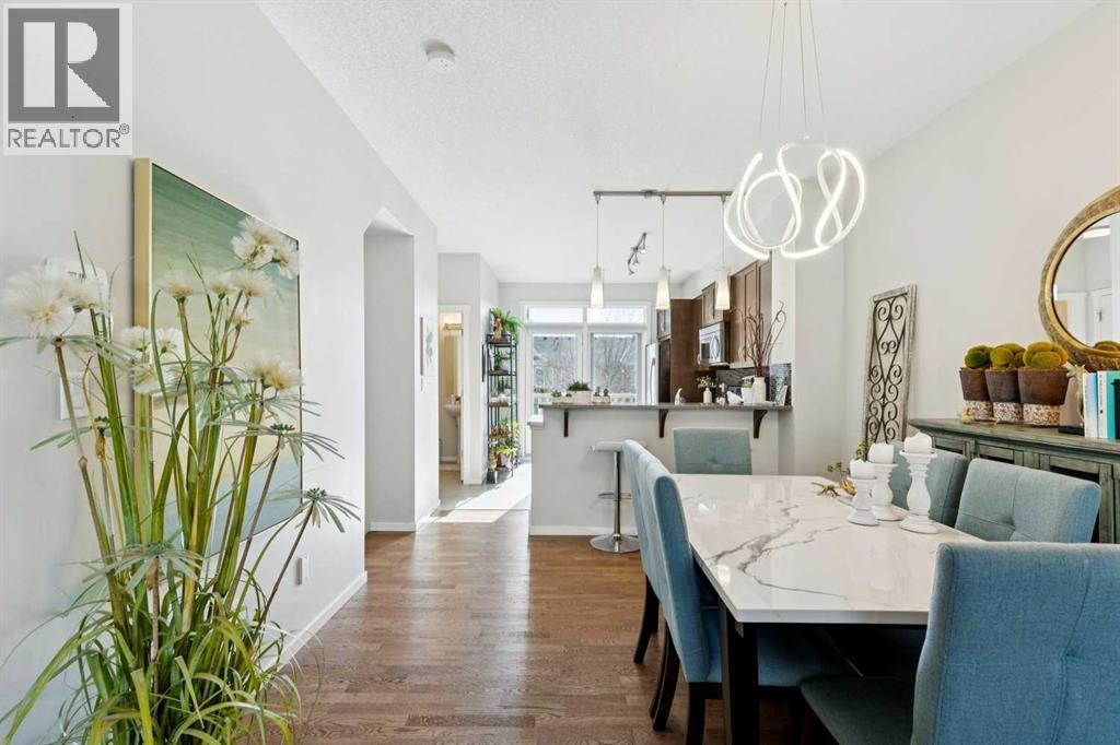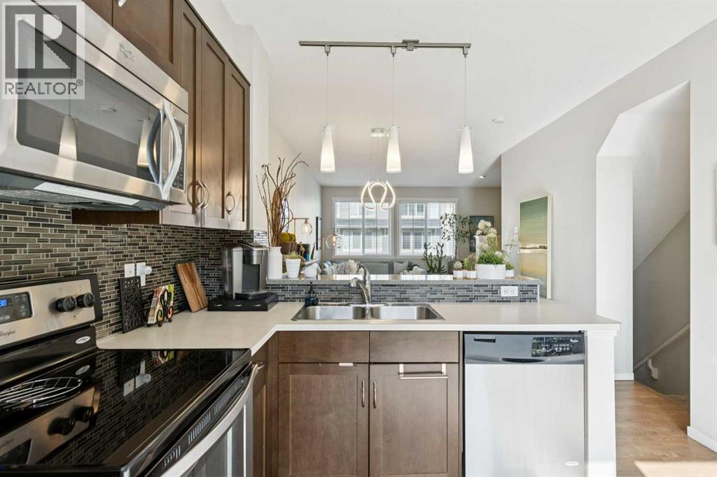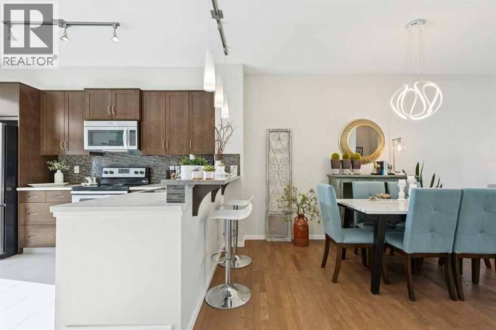 Natural light pours through this beautifully maintained townhome, where the main living level is bright, open, and exceptionally well appointed. The living room is anchored by a gas fireplace with built-ins, creating a warm and polished focal point. From there, the layout flows naturally into the dining area and kitchen, where richly stained cabinetry, stainless steel appliances, and a breakfast bar with raised seating offer both style and functionality. Just off the kitchen, the balcony overlooks the courtyard and provides a outdoor extension of the main floor. Upstairs, both bedrooms are generously proportioned and each is complete with a walk-in closet, offering a layout that is both comfortable and well designed for a professional couple, small family or roommates. The primary suite includes its own ensuite bath with an oversized shower, while the second bedroom has direct access to the stylish upstairs bath. A full-size den offers flexible space for a home office, study, nursery, or small gym, while upper-level laundry adds everyday convenience. The heated and drywalled tandem garage accommodates two vehicles and offers future development potential, while the full-length parking pad allows space for an additional vehicle, a rare advantage above many other inner units. A fenced, covered patio extends from the garage to the treed courtyard, while the rear balcony, complete with a natural gas line, overlooks the same setting and offers an easy outdoor retreat. With quick access to major routes, extensive pathway networks, nearby amenities, and the airport, this is a home that balances comfort, convenience, and thoughtful design exceptionally well. (id:63190)