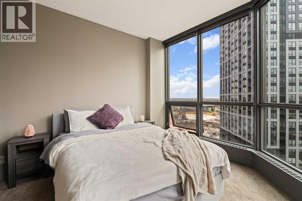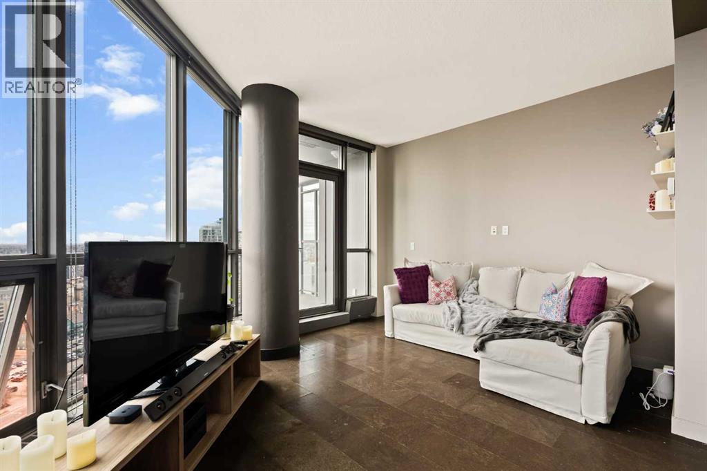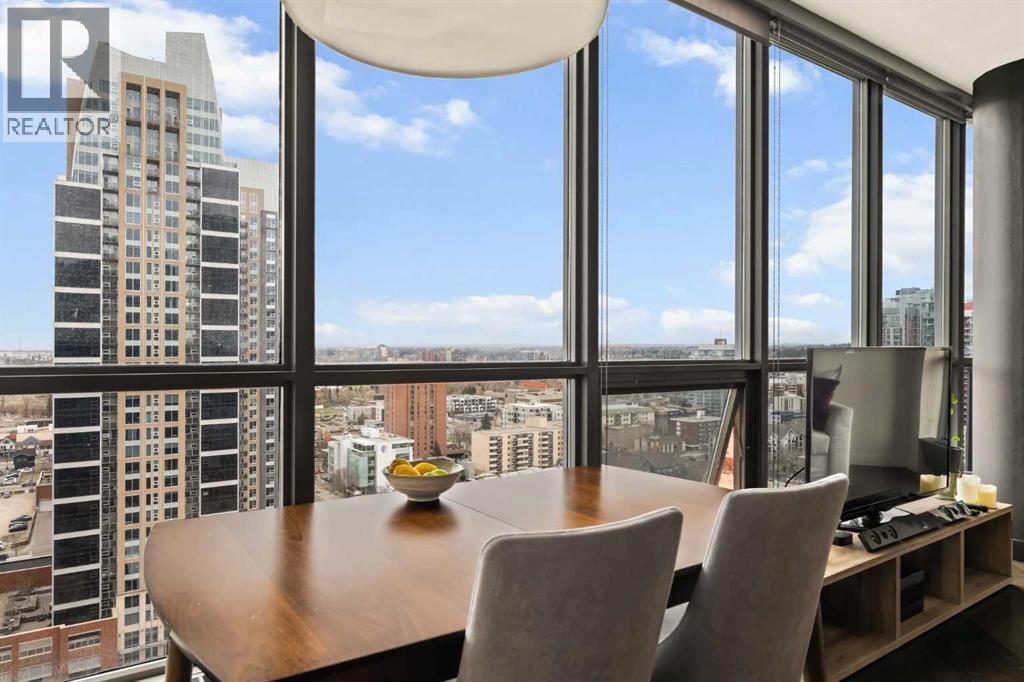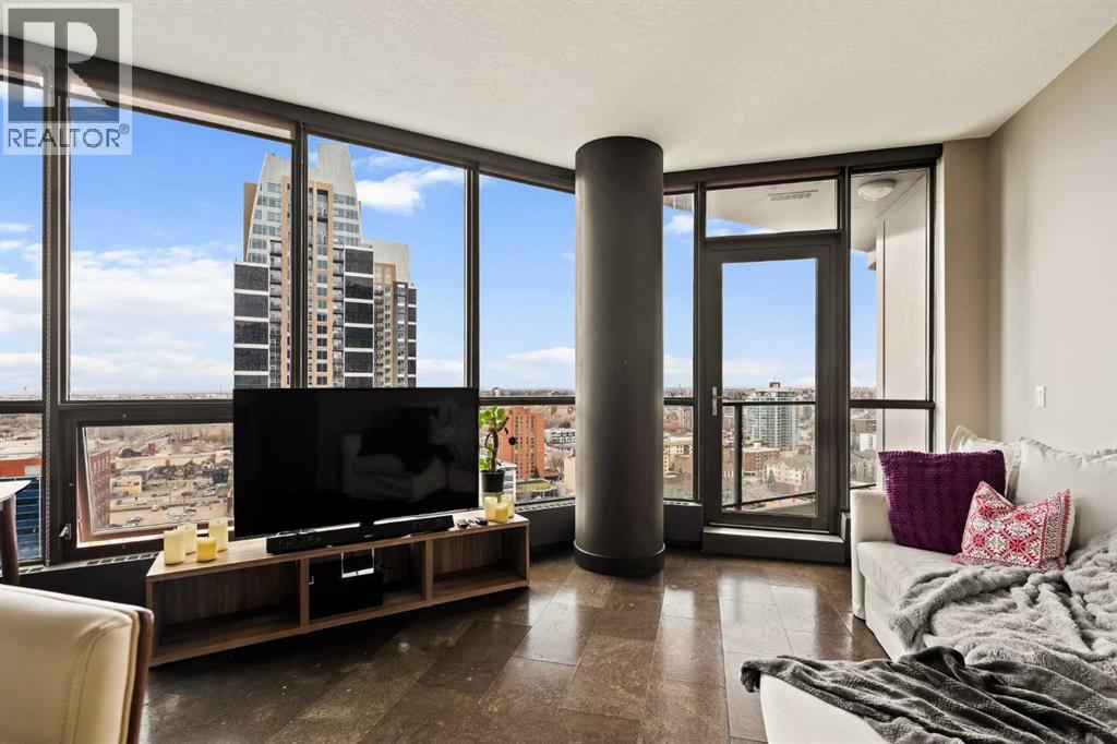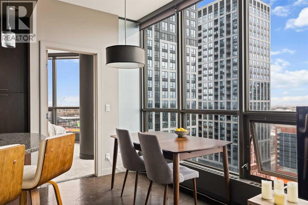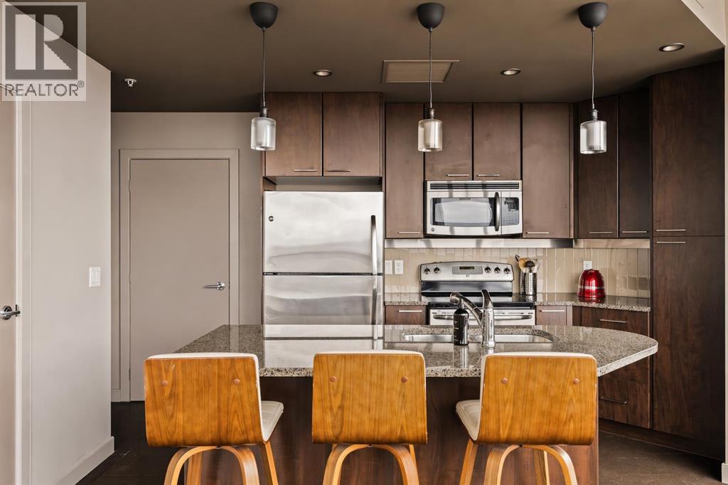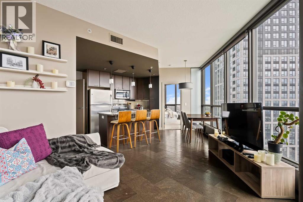 Welcome to Unit 2008, located in the highly sought-after Keynote 1 building in the heart of Calgary’s vibrant Beltline. Perched on the 20th floor, this beautifully appointed 1-bedroom, 1-bathroom condo offers over 560 sq. ft. of thoughtfully designed living space, with stunning south-facing views over the Stampede Grounds and sweeping west-facing views toward the Rocky Mountains. Floor-to-ceiling windows fill the home with natural light throughout the day, creating a bright and inviting atmosphere. The open-concept layout seamlessly connects the kitchen, dining, and living areas, making the space ideal for both everyday living and entertaining. The timeless kitchen features a functional layout with granite countertops, stainless steel appliances, ample cabinetry, and a convenient island with seating. The living area is framed by expansive windows and provides direct access to a private balcony, perfect for enjoying your morning coffee, evening sunsets, or taking in the energy of the city below. The primary bedroom offers a comfortable retreat with space for a king-sized bed. Its unique layout allows for natural light while maximizing the views. The bedroom connects to a walk-through closet and a well-appointed 4-piece bathroom, which is also accessible from the main living area for added convenience. In-suite laundry (new in December 2025) and additional storage complete the interior. Residents of Keynote 1 enjoy access to exceptional amenities, including a fully equipped fitness centre, guest suites, owner’s lounge, and outdoor courtyard space. The building also offers the convenience of secure underground titled parking and direct access to Sunterra Market, making day-to-day living effortless. Situated just steps from downtown offices, restaurants, cafes, transit, the Stampede Grounds, and the river pathway system, this location offers the perfect balance of urban convenience and lifestyle. Combining elevated views, modern finishes, and an unbeatable location, thi s is downtown living at its finest. (id:63190)