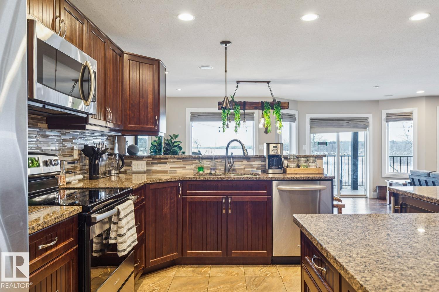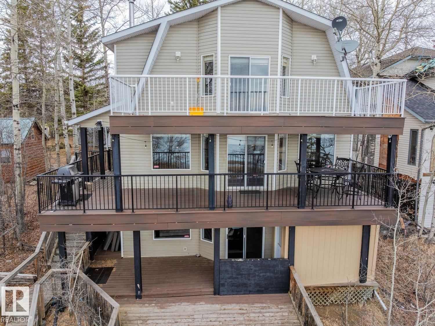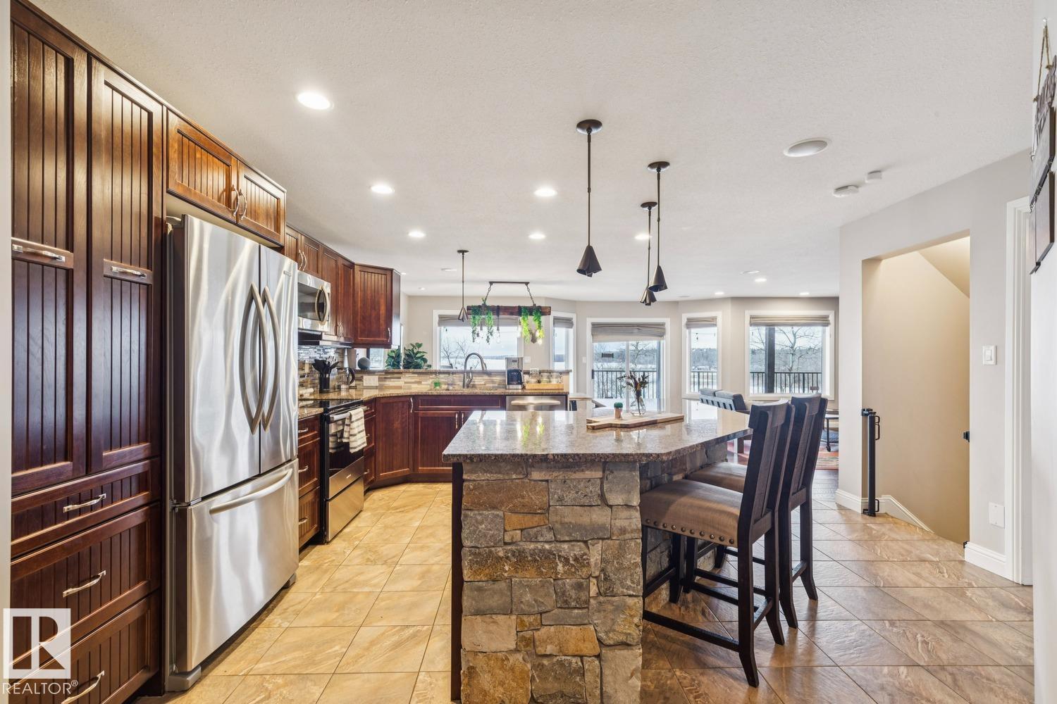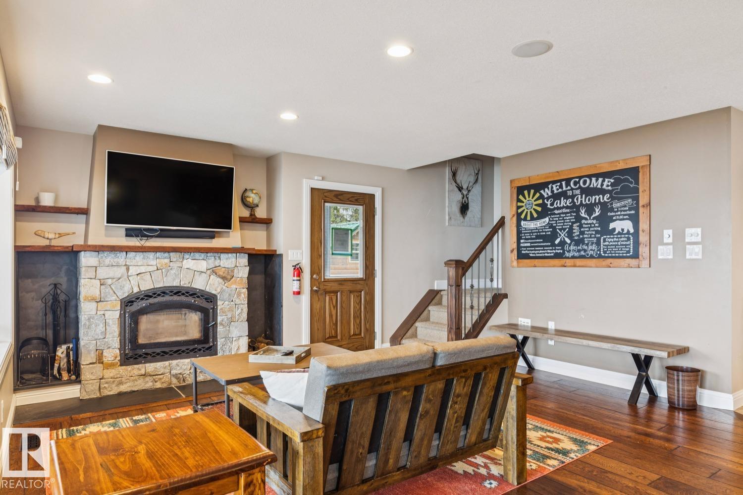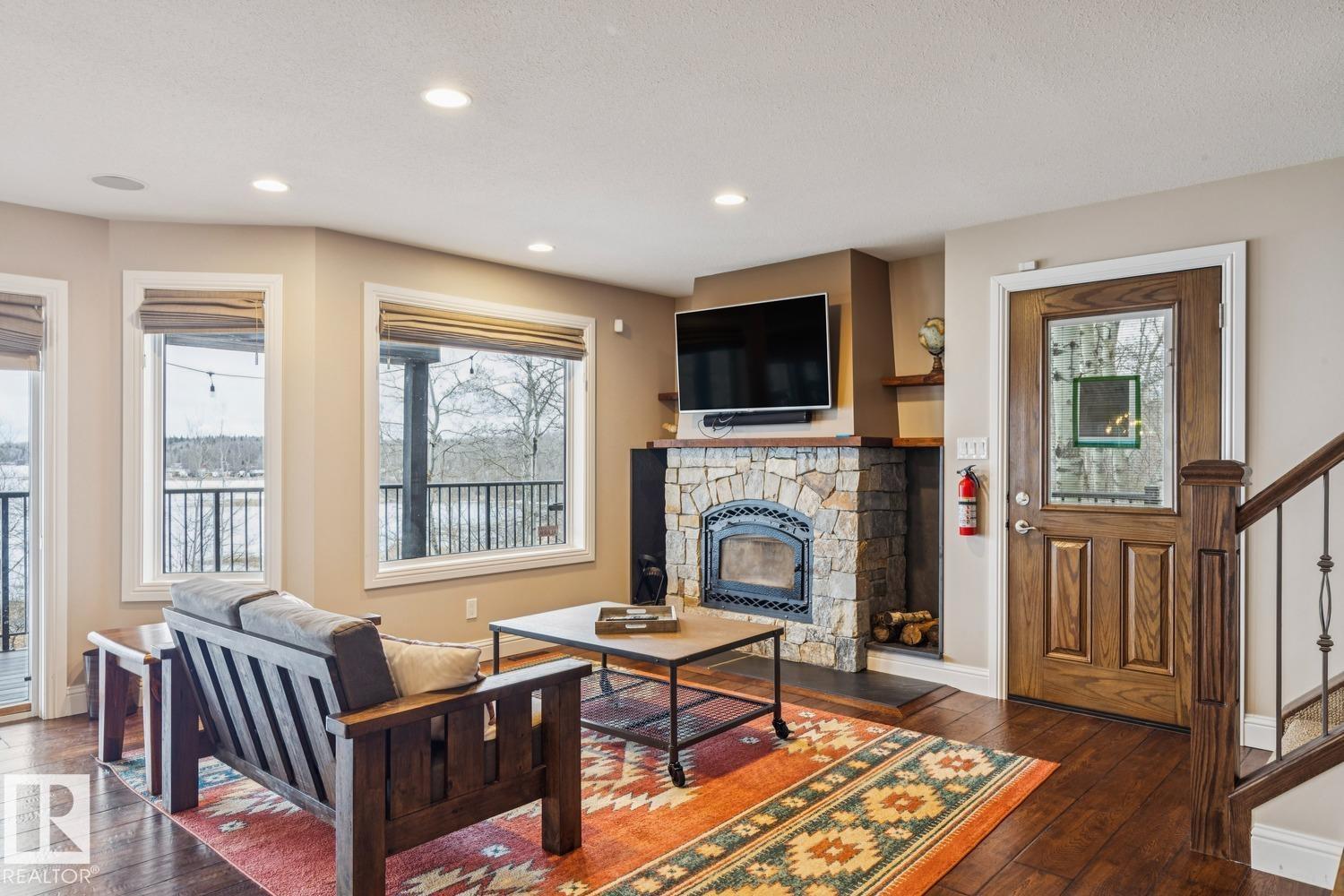 Welcome to one of Birch Cove’s finest lakefront homes, backing directly onto Lac la Nonne with unobstructed views. This beautifully renovated 5 bed, 3 bath home offers over 2,600 sqft of living space with a walk-out basement. The main floor features rich kitchen cabinetry, granite countertops, hardwood floors, and a stunning stone fireplace, all complemented by large windows capturing the lake. Upstairs, the primary suite offers a private retreat with breathtaking views and its own deck overlooking the water. The walk-out lower level is perfect for entertaining with a spacious games area and direct access to the backyard and shoreline. Thoughtfully upgraded throughout with quality finishes, craftsmanship, and attention to detail, this home delivers the perfect blend of luxury, comfort, and true lakefront living. Enjoy your own private escape just steps from the water ideal for year round recreation, boating, and unforgettable memories. Experience lakefront living with unmatched views and direct access. (id:63190)