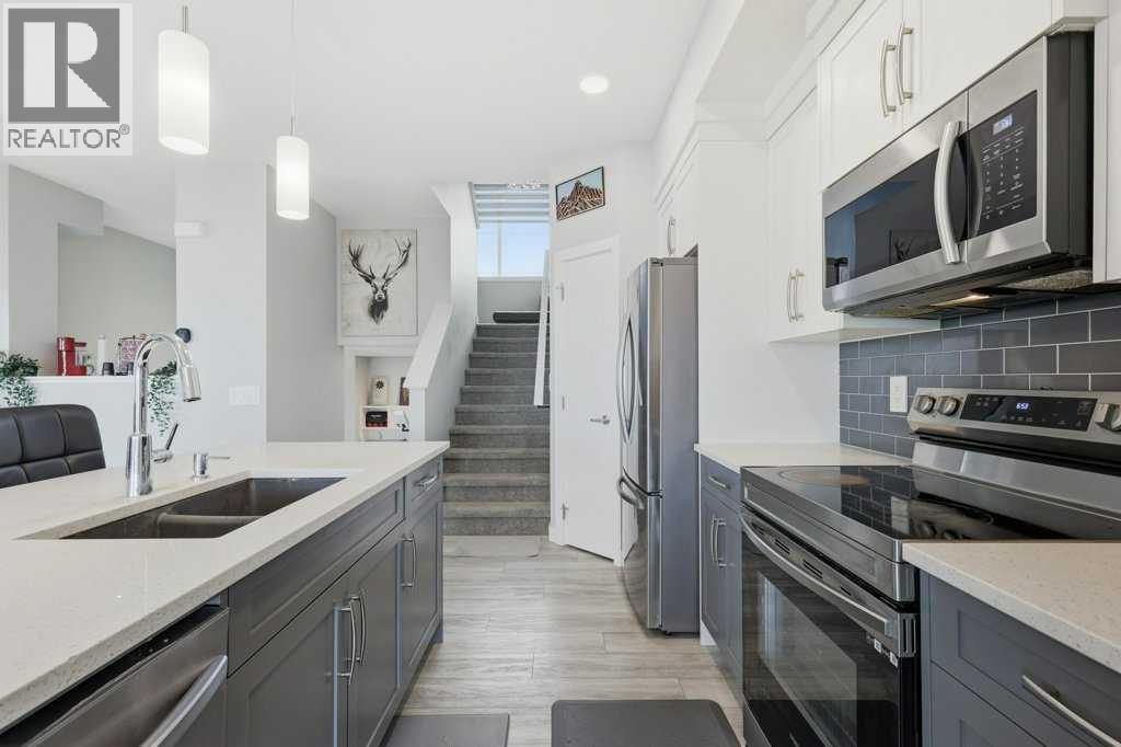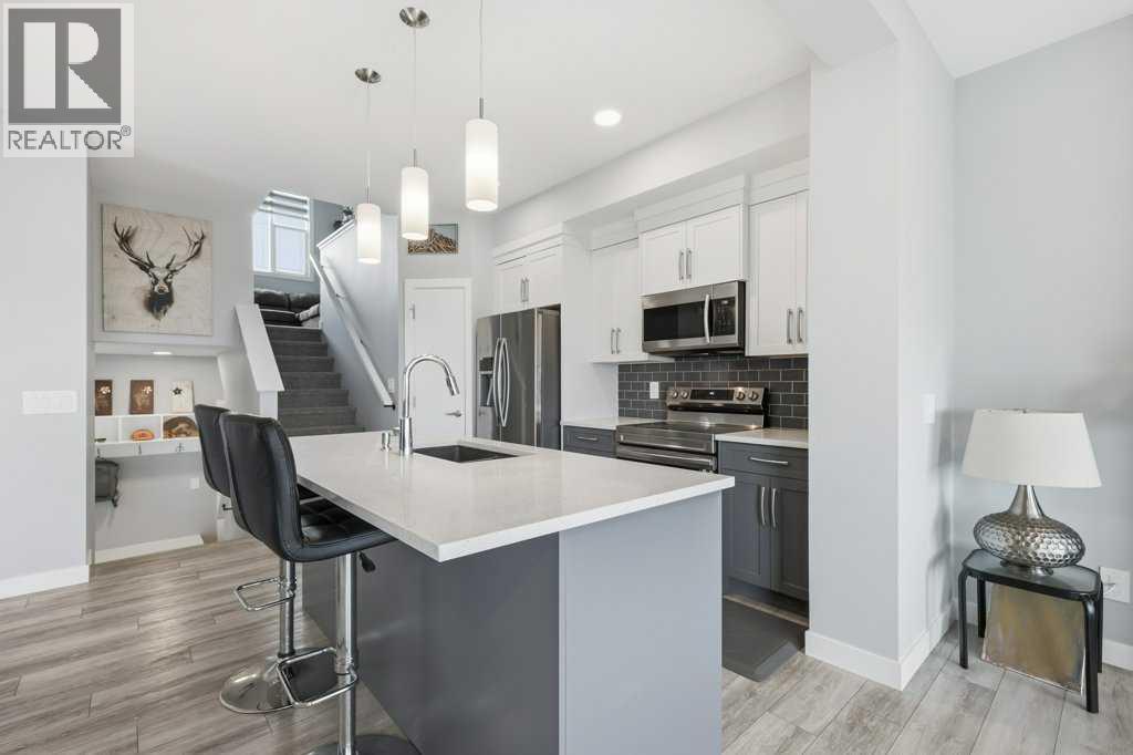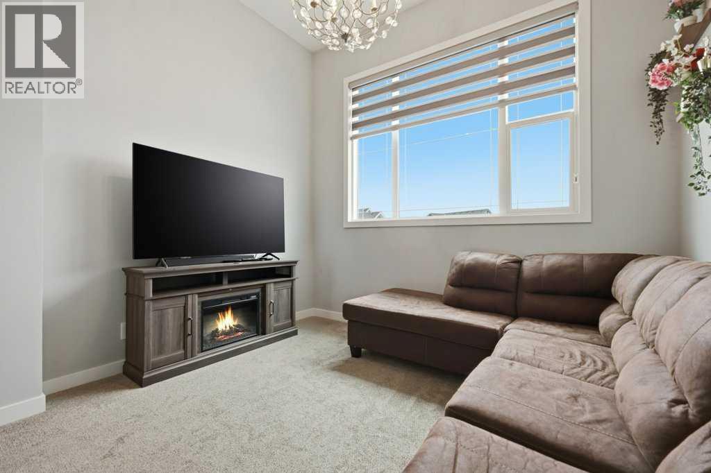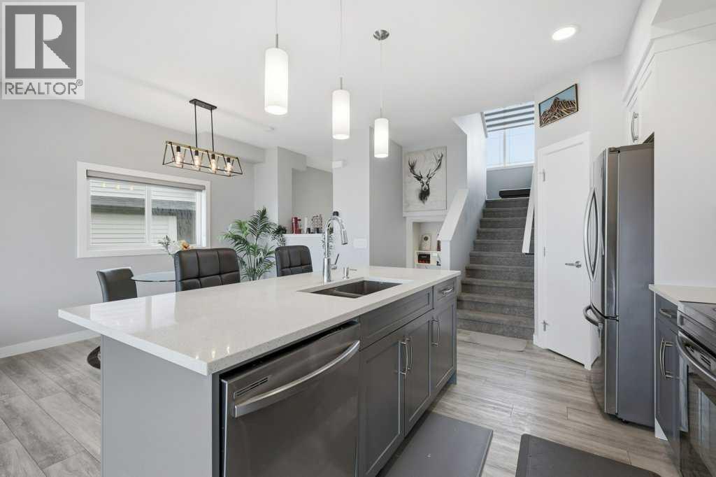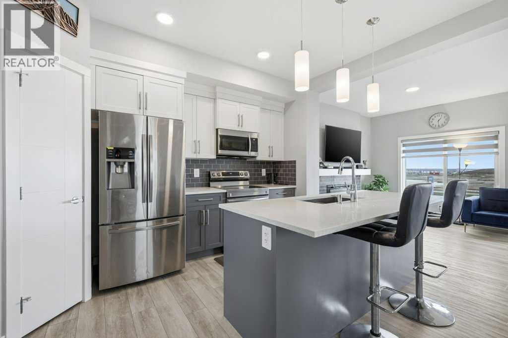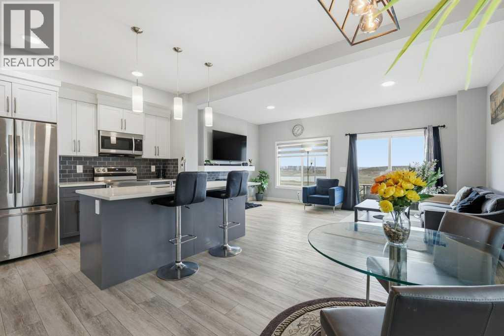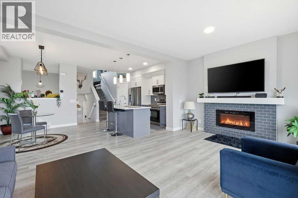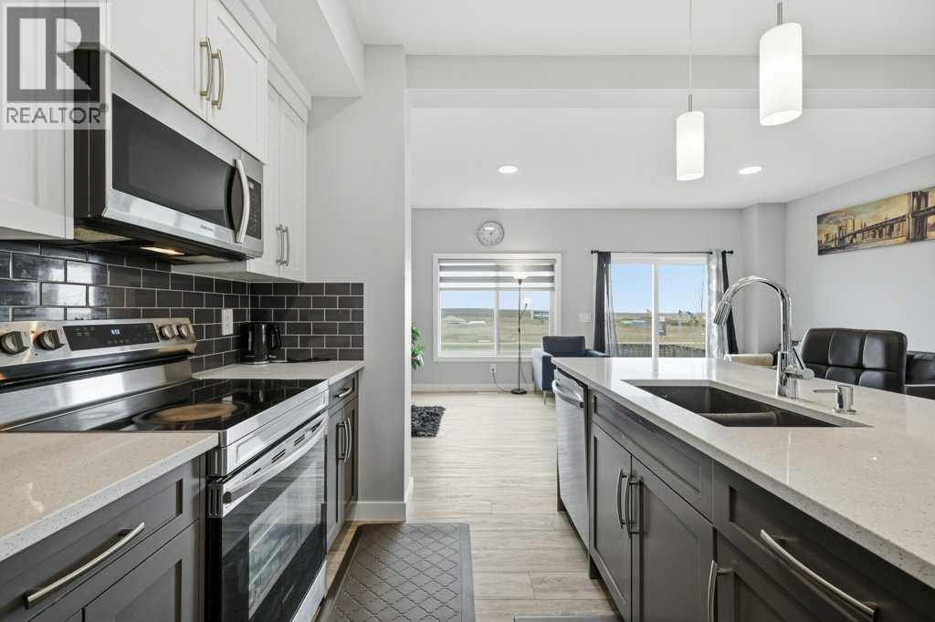 The main floor opens up around a kitchen built for actual cooking. Quartz counters, walk-in pantry, stainless appliances. White shaker uppers, grey lowers, dark subway tile backsplash. The island fits a family. Living room sits right off the kitchen with a tiled fireplace and big windows facing the back. Side entry has a built-in mudroom with bench, hooks, and cubbies, which you'll appreciate the first time someone walks in with wet boots. Upstairs is where it gets interesting. The bonus room has vaulted ceilings and its own fireplace, basically a second living room. Three bedrooms up here, including a primary with a walk-in closet and an ensuite with a glass shower. Laundry on the bedroom level where it should be. Two and a half baths total. Attached garage out front. Fenced yard with a patio and a back deck for summer dinners. The basement is unfinished and ready for whatever you have in mind, whether that's a fourth bedroom, a rec room, or both. Pine Creek itself has grown into one of Calgary's better newer SW communities. Playgrounds and soccer fields within a 20-minute walk. Pathways winding past ponds, wetlands, and into the foothills. Township Centre and Silverado Shopping are minutes away for groceries, coffee, and errands. Stoney Trail puts the mountains within easy reach on weekends. Macleod Trail takes you downtown when you need it. Spruce Meadows is up the road. Fish Creek Park and the South Health Campus are close. Wake up to foothills views and you'll get why people are moving out here. (id:63190)