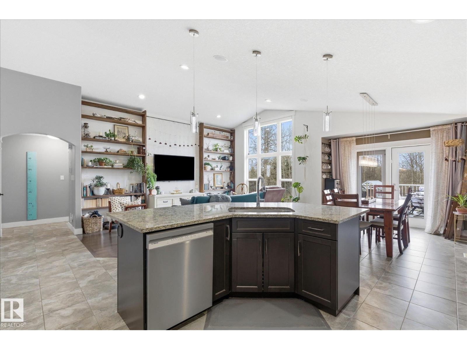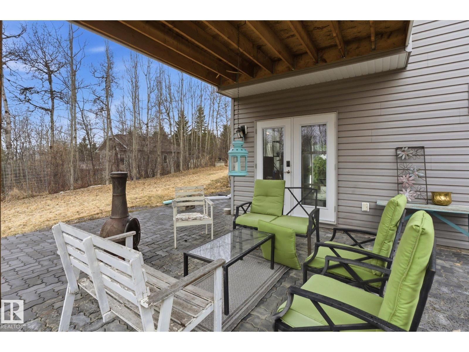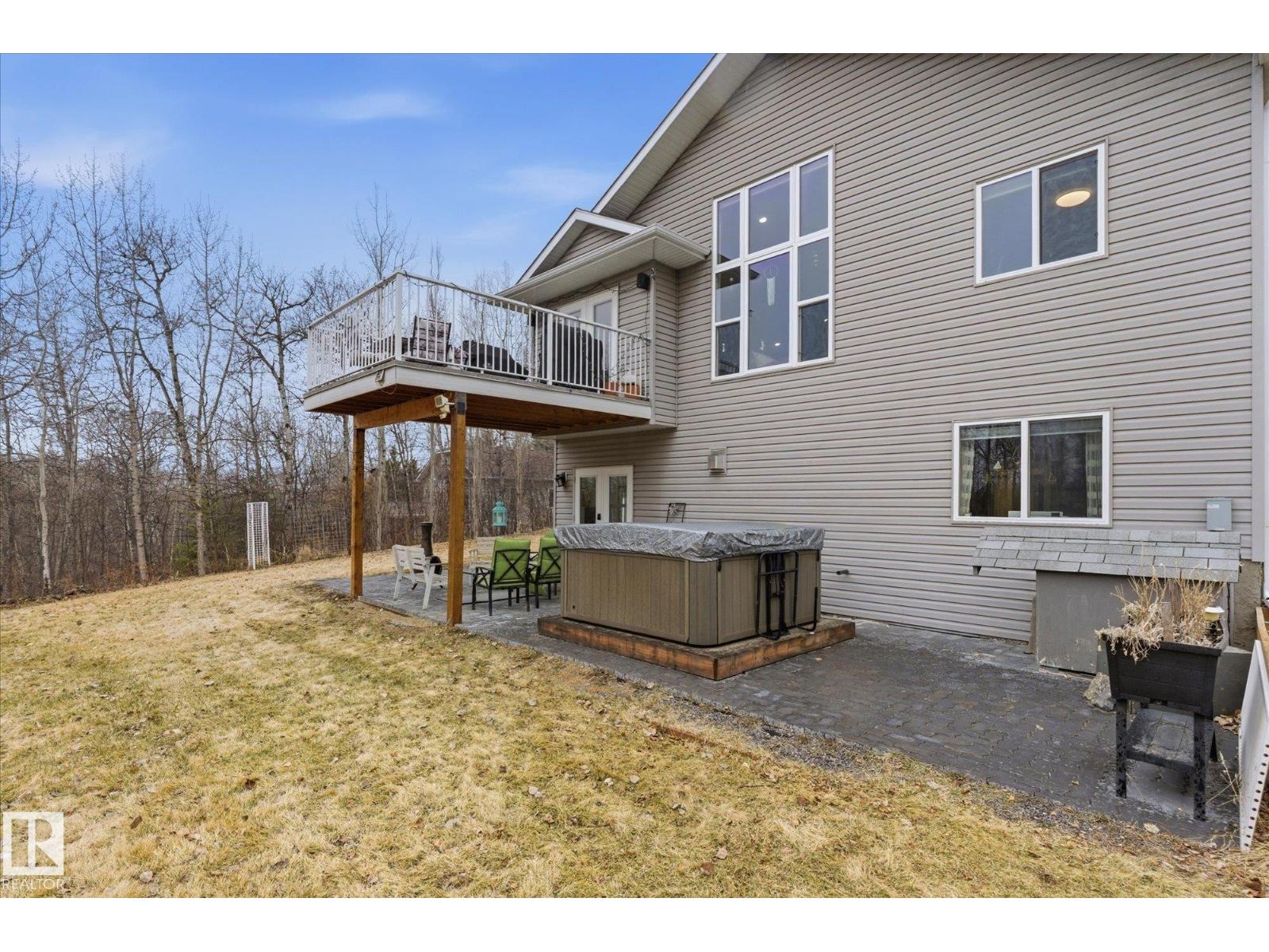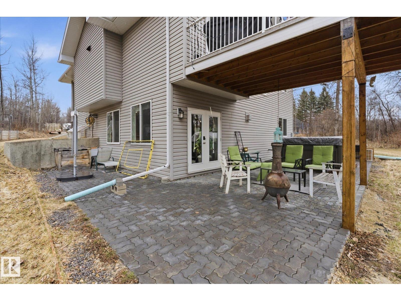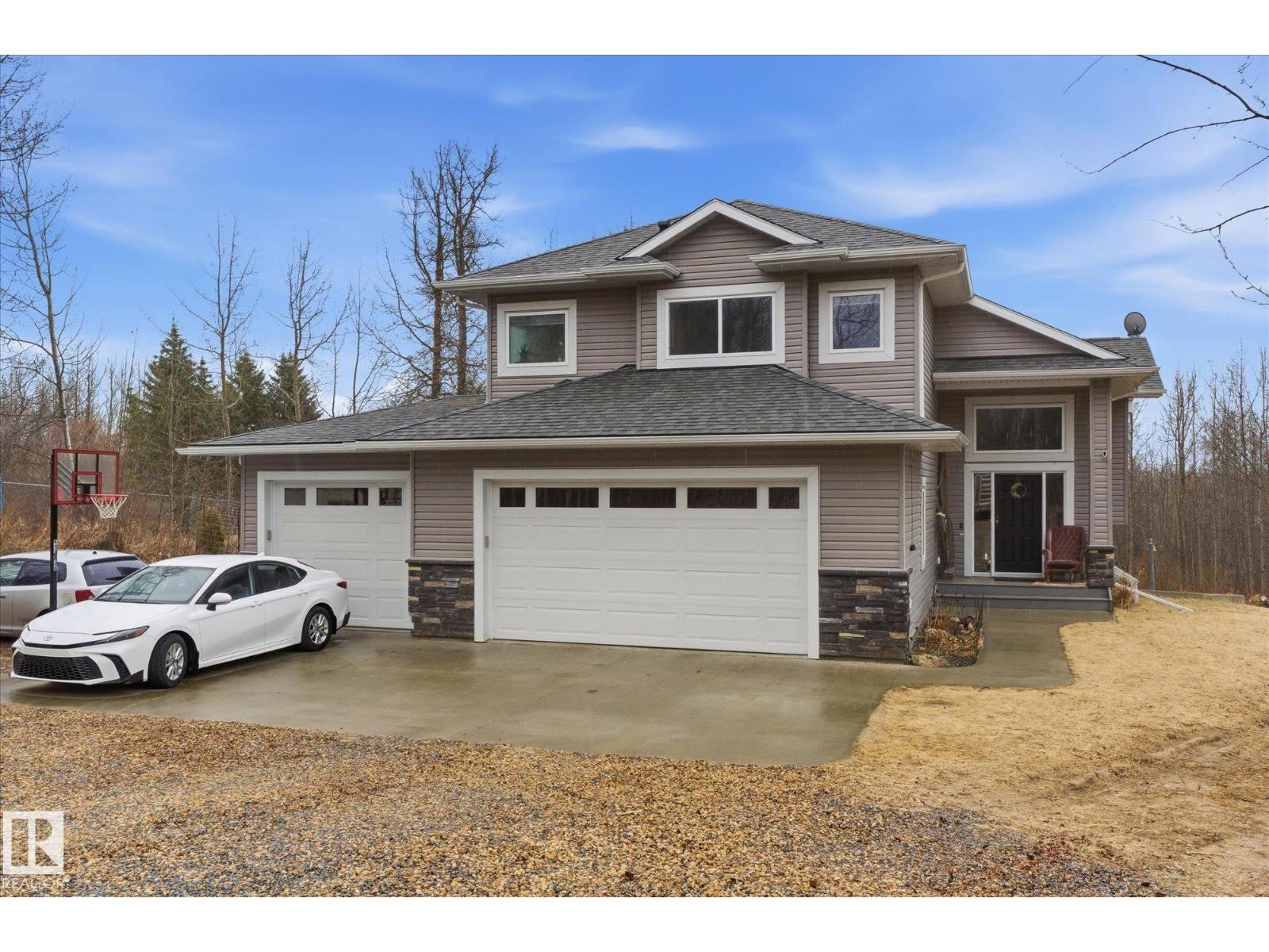 Gorgeous custom-built 1.5 storey walkout on 1.09 private, treed acres backing greenspace, just minutes from Chickakoo Lake Recreation Area. This 5 bedroom, 3 full bathroom home features an open-concept layout with 12’ vaulted ceilings, large windows, and a bright kitchen with island, granite countertops, and corner pantry. The main floor offers 2 spacious bedrooms, while the fully finished basement includes 2 more. The huge primary suite over the garage features a walk-in closet and 4-pc ensuite with dual sinks and a corner jetted tub. Enjoy a cozy gas fireplace, walk-in laundry, dual-zone heating & A/C. Maintenance-free decks overlook a beautifully treed yard with invisible fence. Heated 27’ x 36.5’ triple garage with H/C water and drains. Quick commute to Stony Plain. This one won’t last! (id:63190)