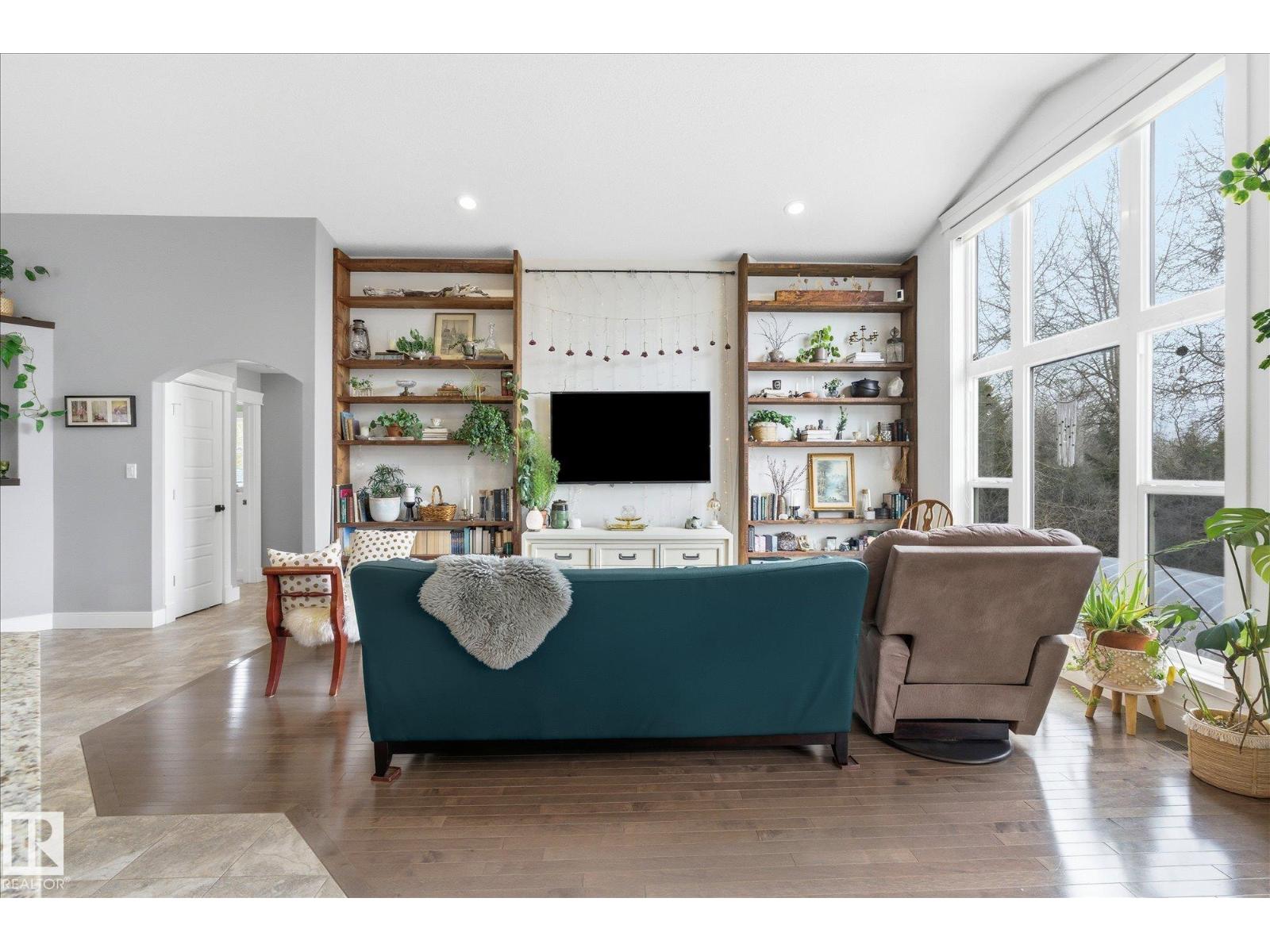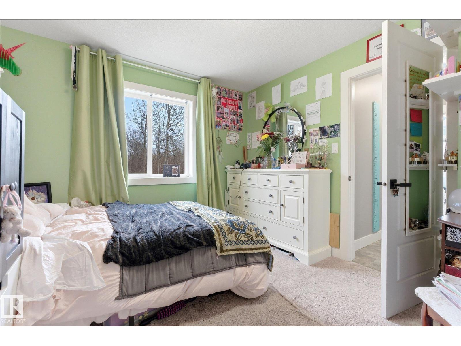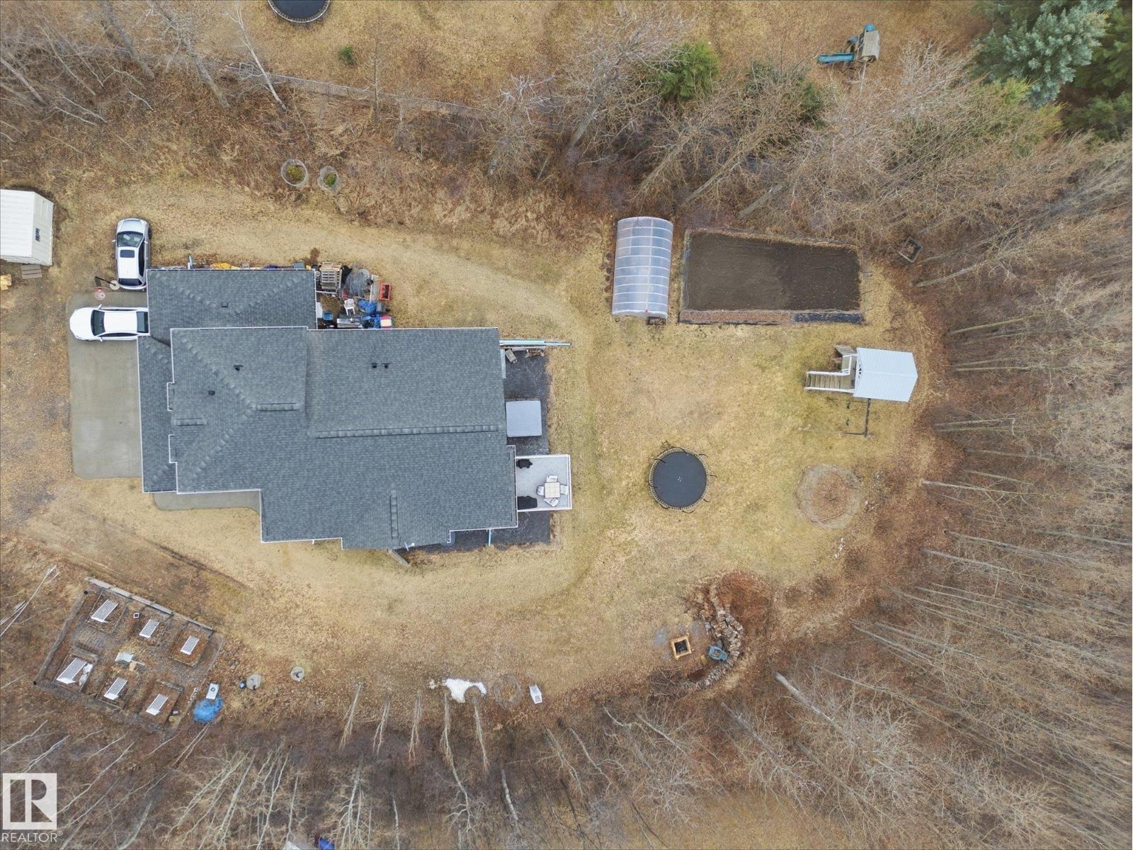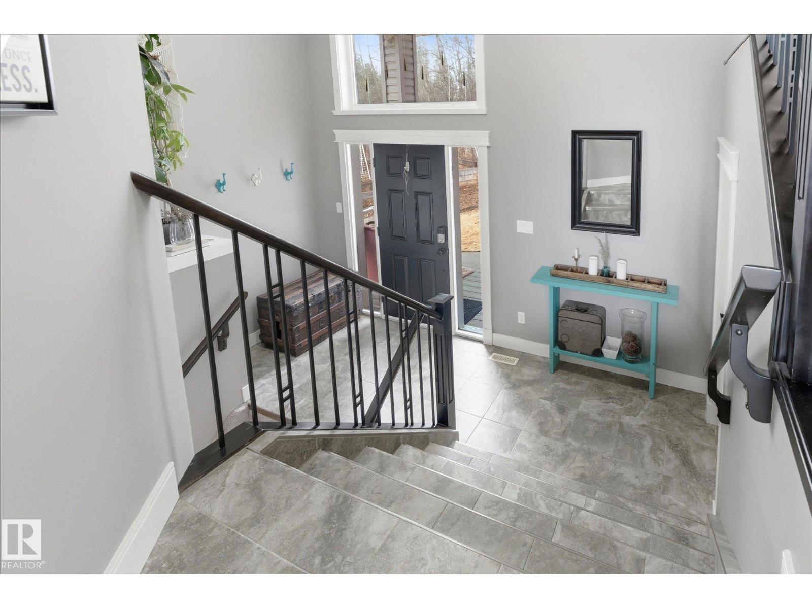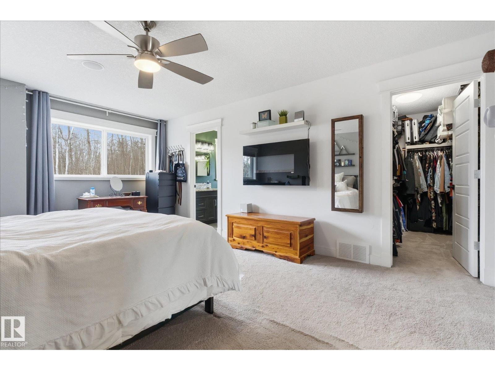 Gorgeous custom-built 1.5 storey walkout on 1.09 private, treed acres backing greenspace, just minutes from Chickakoo Lake Recreation Area. This 5 bedroom, 3 full bathroom home features an open-concept layout with 12’ vaulted ceilings, large windows, and a bright kitchen with island, granite countertops, and corner pantry. The main floor offers 2 spacious bedrooms, while the fully finished basement includes 2 more. The huge primary suite over the garage features a walk-in closet and 4-pc ensuite with dual sinks and a corner jetted tub. Enjoy a cozy gas fireplace, walk-in laundry, dual-zone heating & A/C. Maintenance-free decks overlook a beautifully treed yard with invisible fence. Heated 27’ x 36.5’ triple garage with H/C water and drains. Quick commute to Stony Plain. This one won’t last! (id:63190)