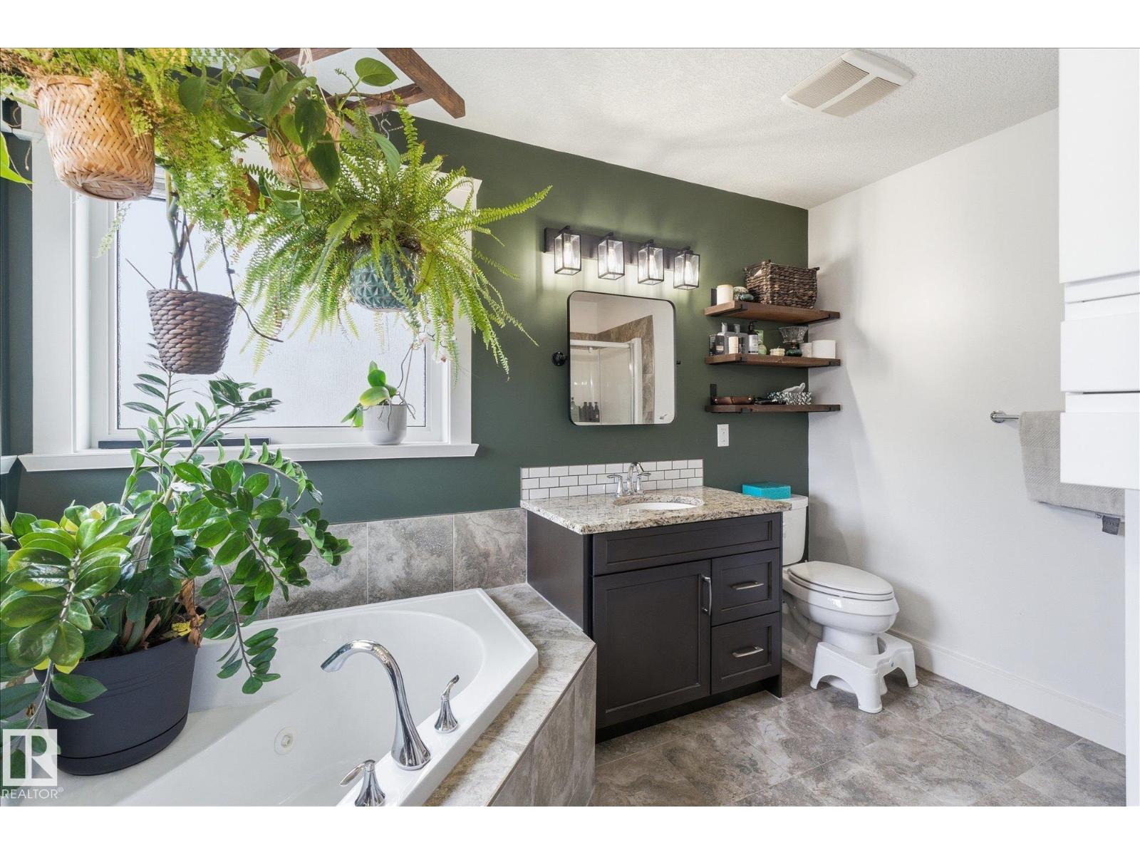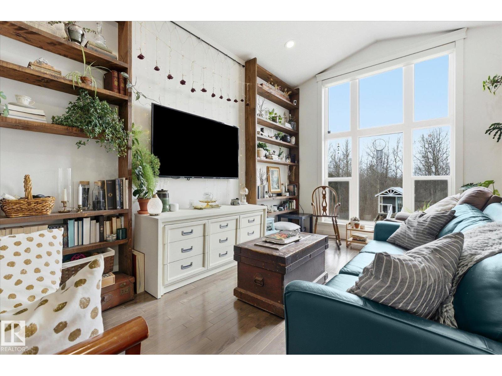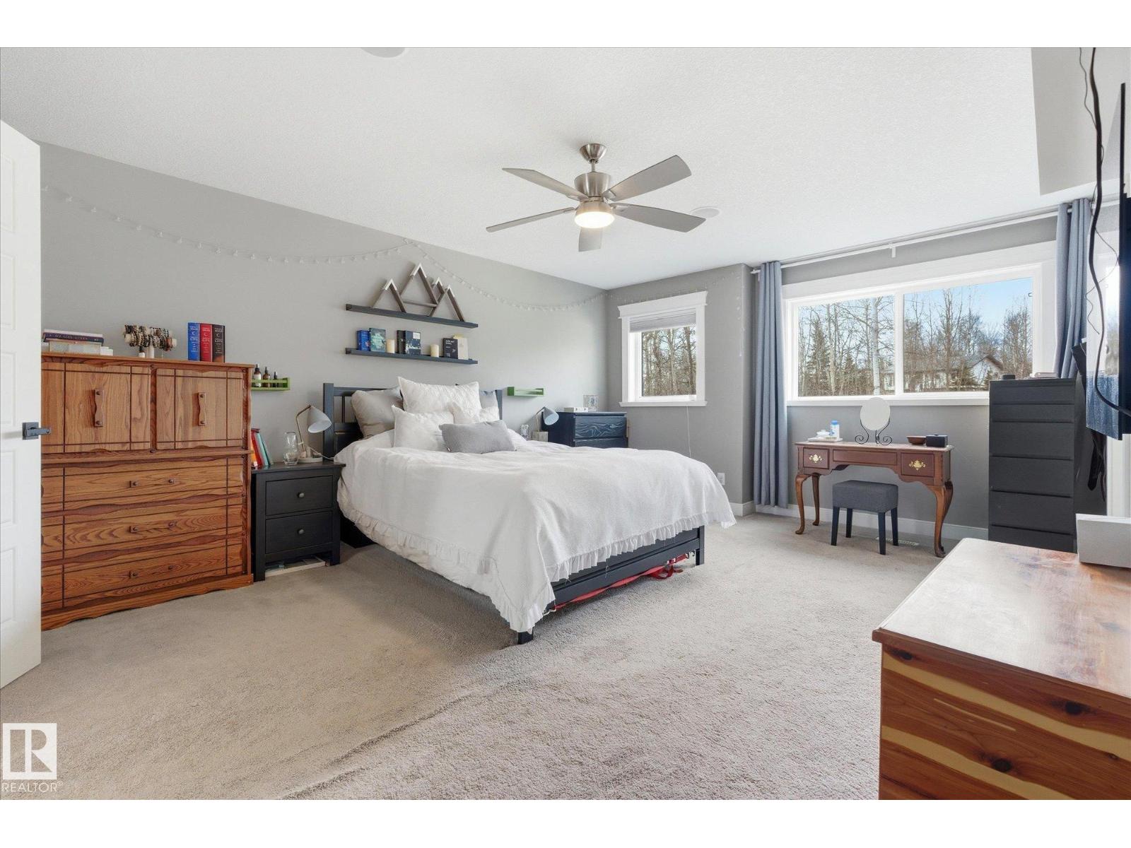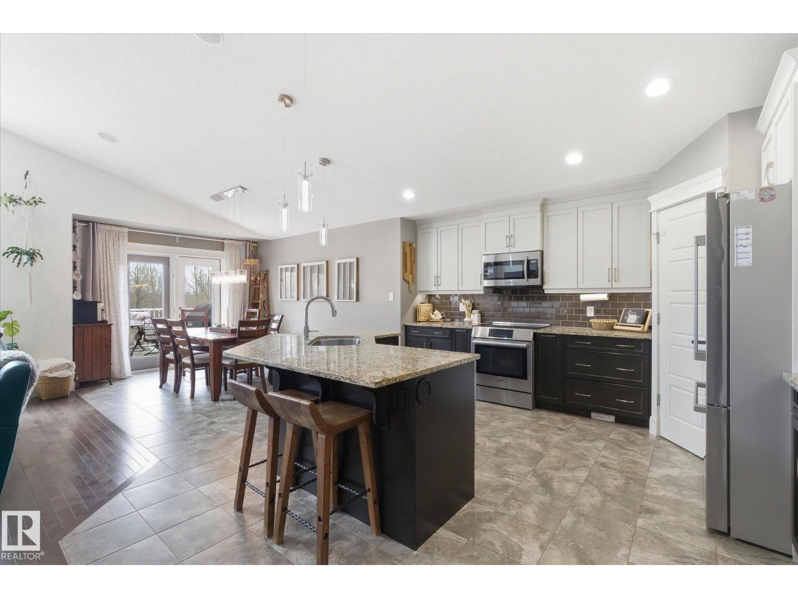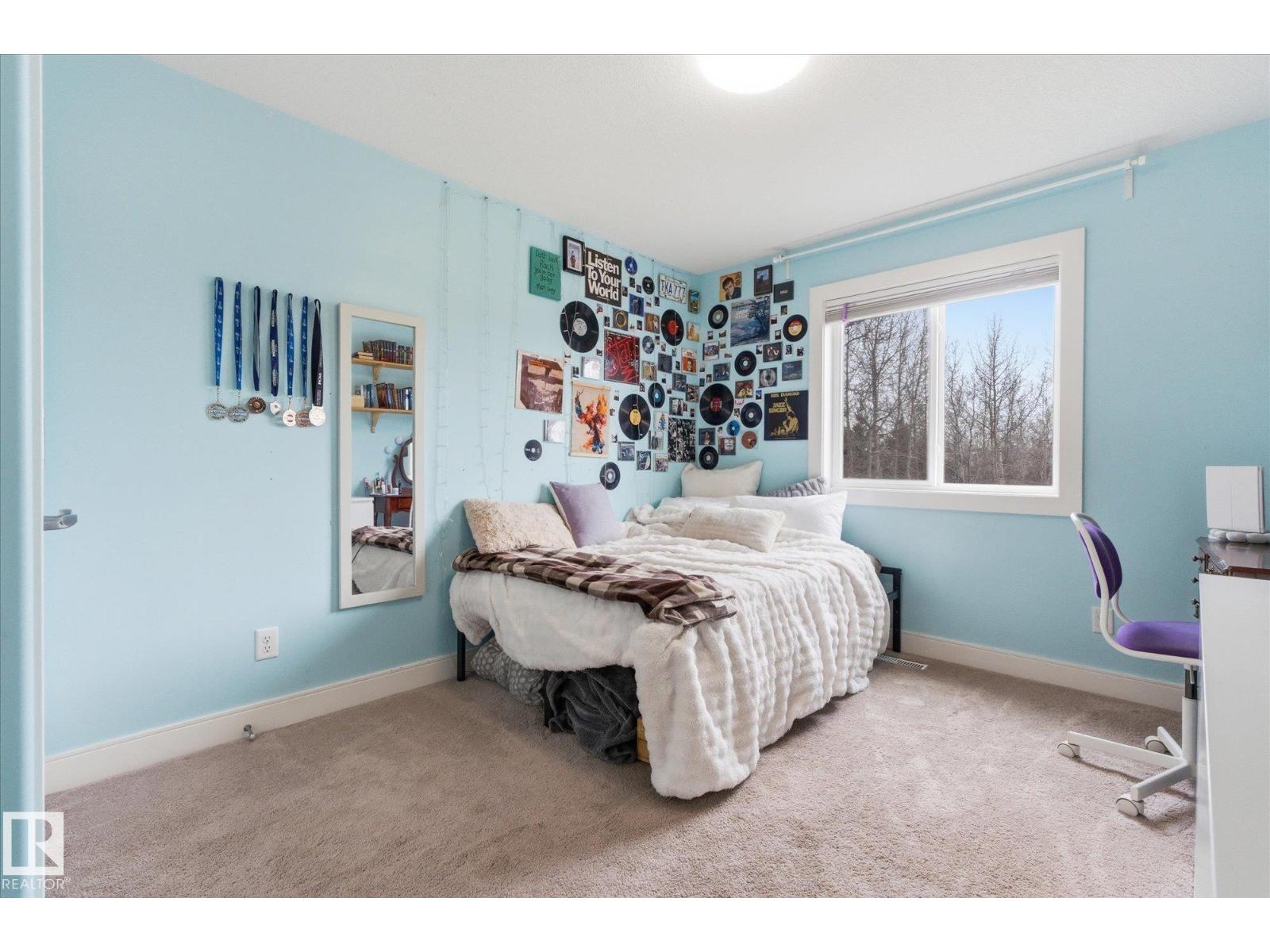 Gorgeous custom-built 1.5 storey walkout on 1.09 private, treed acres backing greenspace, just minutes from Chickakoo Lake Recreation Area. This 5 bedroom, 3 full bathroom home features an open-concept layout with 12’ vaulted ceilings, large windows, and a bright kitchen with island, granite countertops, and corner pantry. The main floor offers 2 spacious bedrooms, while the fully finished basement includes 2 more. The huge primary suite over the garage features a walk-in closet and 4-pc ensuite with dual sinks and a corner jetted tub. Enjoy a cozy gas fireplace, walk-in laundry, dual-zone heating & A/C. Maintenance-free decks overlook a beautifully treed yard with invisible fence. Heated 27’ x 36.5’ triple garage with H/C water and drains. Quick commute to Stony Plain. This one won’t last! (id:63190)