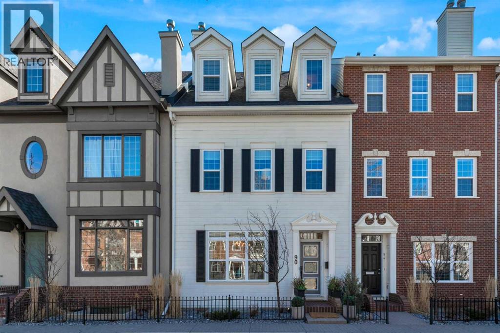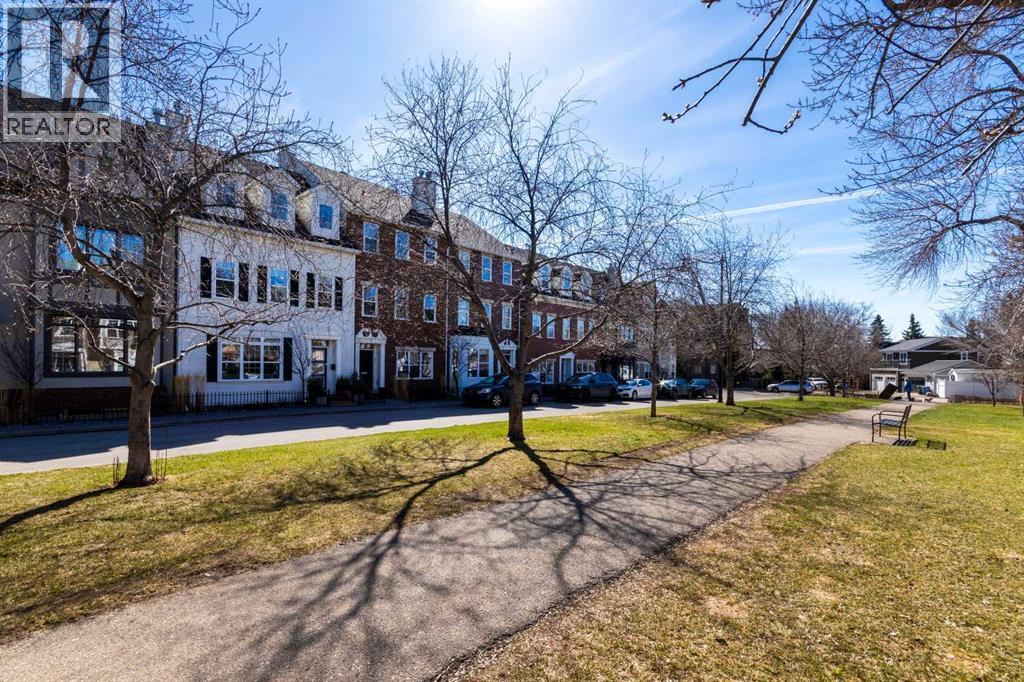 Front elevation of this beautifully renovated 2,396 sq ft townhouse on one of Calgary’s iconic, tree-lined boulevards, complete with a central park and walkway