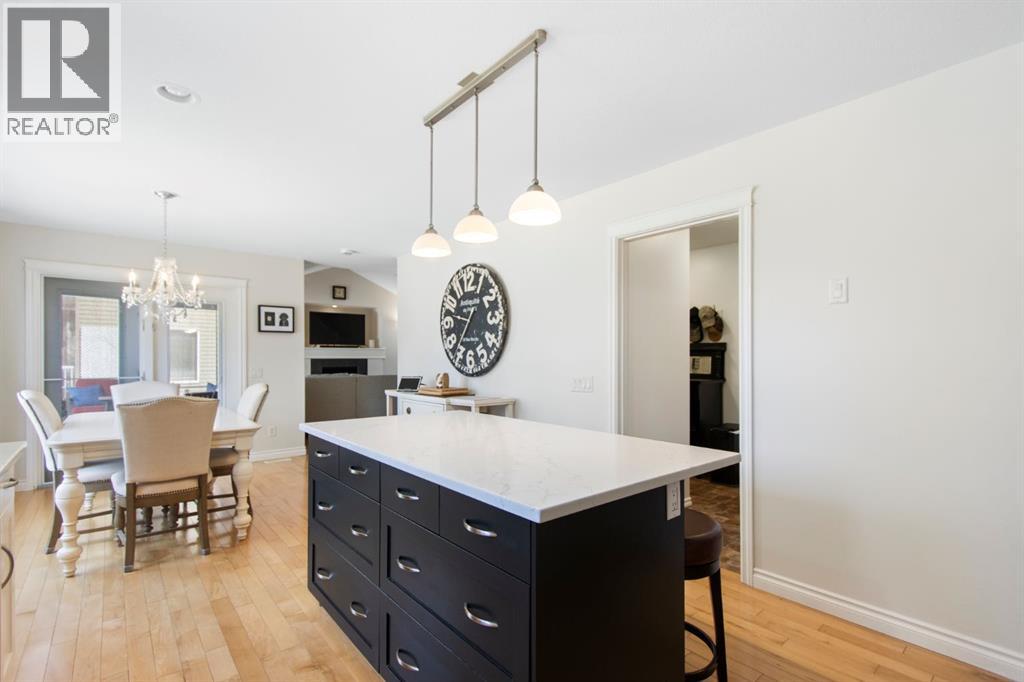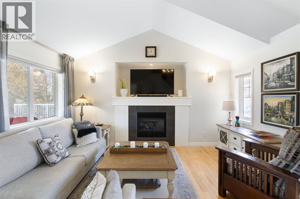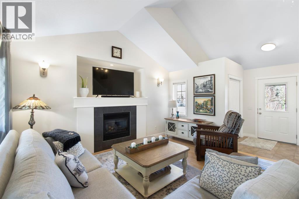 This home shows a "10 out of 10" and offers nearly 1,700 sq. ft. of pristine, move-in-ready living space. The inviting entry opens into a bright living room featuring hardwood floors, soaring vaulted ceilings, a cozy gas fireplace, and large windows that frame views of the west-facing backyard. The seamless open layout leads to a gourmet kitchen equipped with white shaker-style cabinetry to the ceiling, granite countertops, a large island, a gas stove, and stainless steel appliances. Also on the main level, a functional laundry/pantry room, a 2-piece bathroom, and direct access to a private, covered back deck and the back yard surrounded by mature trees.The upper level features a spacious primary suite with a large ensuite and walk-in closet, alongside two additional bedrooms, a full guest bathroom, and a versatile flex space. Downstairs, the finished basement boasts high ceilings and a premium entertaining area complete with a bar to host guests!. Meticulously maintained, the property includes recent upgrades such as fresh paint, newer flooring, a newer high-efficiency furnace, AC, heater in the garage, and a BBQ gas line. As a bonus, the oversized garage (22'6" x 23'1") comes with a side mount garage door opener for extra overhead clearance. Perfectly situated, this home is just a short walk from the golf course, grocery stores, and local amenities.Book your showing today! (id:63190)